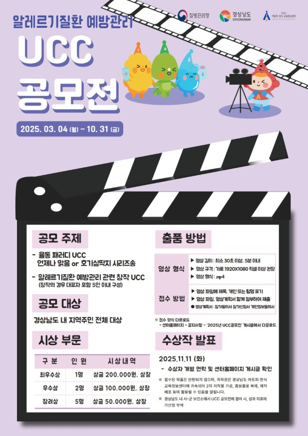 2025년 알레르기질환 예방관리 UCC 공모전 공모분야 사진/영상 접수기간2025.03.04 ~ 2025.10.31 D+109 종료 참가자격 지역한정 주최경상남도 아토피 천식 교육정보센터 1등상금(상품)100만원 이하 홈페이지 바로가기 첨부파일 다운로드 유의사항 ※본 내용은 참고 자료로 내용의 오류와 변동에 대해 책임지지 않습니다. (오류 및 변동 신고는 상단의 '제안/오류' 신고를 통해 해주십시오.) ※주최사 사정에 따라 일정 및 내용이 변경될 수 있으니 주최사 홈페이지 등을 통해 관련 안내를 수시로 확인하시기 바랍니다. 상세내용 ■ 제목2025년 알레르기질환 예방관리 UCC 공모전 ■ 기간 - 접수 기간 : 2025년 3월 4일 ~ 10월 31일 ■ 참가자격경상남도 지역주민 ■ 참여방법 / 접수방법<공모 주제>주제 1질병관리청에서 제작되었던 언제나 맑음 또는 EBS 호기심딱지 시리즈송으로 율동 패러디 UCC 제작 영상은 유튜브 '경상남도 아토피 천식 교육정보센터 ' 재생목록 공모전에 게시되어 있습니다. 주제 2알레르기질환 예방관리 관련 창작 UCC 제작 (단, 대표자 포함 5인 이내 구성) <영상형식>- 영상 길이는 최소 30초 이상, 5분 이내- 영상 규격은 가로 1920*1080 픽셀 권장- 영상 형식은 반드시 .mp4 이어야 합니다. <접수 방법>- 영상 파일에 제목과 개인 또는 팀명을 표기해주세요.- 영상파일과 영상 계획서를 함께 제출해주세요. (영상계획서 : 참가동의서, 참가신청서, 개인정보동의서로 구성)** 접수 양식 다운로드는 공모전 홈페이지의 첨부파일에서 확인 후 다운로드 가능합니다. ■ 시상내용 / 혜택 - 최우수상 1명 상금 200,000원 - 우수상 2명 상금 100,000원 - 장려상 5명 상금 50,000원 ■ 유의사항 - 접수된 작품은 반환되지 않으며, 저작권은 경상남도 아토피 천식 교육정보센터에 귀속되어 2차 저작물 가공, 홍보물로 복제, 제작 배포 등에 활용될 수 있음을 알립니다. - 경상남도 내 시 군 보건소에서 UCC 공모전에 참여 시, 성과 지표에 가산점이 부여됩니다. - UCC 공모 시, 반드시 영상계획서를 꼼꼼히 읽고, 제출해주시기 바랍니다! 목록