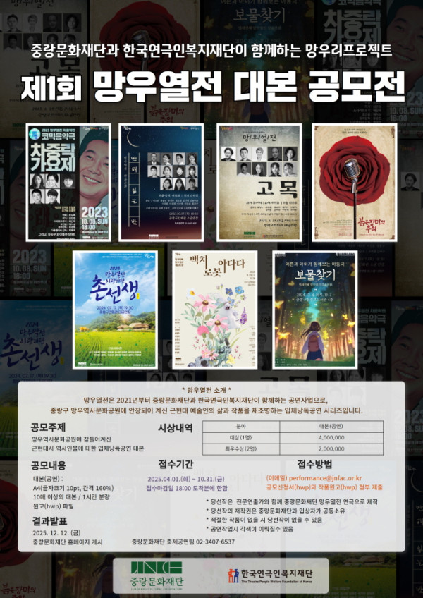제1회 망우열전 대본 공모전 공모분야 문학/시나리오 접수기간2025.04.01 ~ 2025.10.31 D+105 종료 참가자격 제한없음 주최중랑문화재단 1등상금(상품)200만원~499만원 홈페이지 바로가기 첨부파일 다운로드 유의사항 ※본 내용은 참고 자료로 내용의 오류와 변동에 대해 책임지지 않습니다. (오류 및 변동 신고는 상단의 '제안/오류' 신고를 통해 해주십시오.) ※주최사 사정에 따라 일정 및 내용이 변경될 수 있으니 주최사 홈페이지 등을 통해 관련 안내를 수시로 확인하시기 바랍니다. 상세내용 ■ 제목제1회 망우열전 대본 공모전 ■ 개요*망우열전 소개*망우열전은 2021년부터 중랑문화재단과 한국연극인복지재단이 함께하는 공연사업으로, 중랑구 망우역사문화공원에 안장되어 계신 근현대 예술인의 삶과 작품을 재조명하는 입체낭독공연 시리즈입니다. ■ 기간 - 공모기간 : 2025. 4. 1.(화) ~ 10. 31.(금) 18:00까지 이메일 도착분에 한함 ■ 참가자격신인 및 기존 작가 누구나 ■ 참여방법 / 접수방법 ◦ 공모내용 : 망우역사문화공원에 잠들어계시는 근현대사 역사인물에 대한 입체낭독공연 대본 ◦ 제출방법 : 이메일 접수 performance@jnfac.or.kr ◦ 제출서류 : 공모신청서 1부, 원고 1부 ◦ 공모신청서 - 이름, 주소, 전화번호, 응모부문, 제목만 따로 적은 별도의 공모 신청서 양식을 다운받아 첨부해주시기 바랍니다. (공모신청서와 작품 본문 원고 2개 파일 제출) ◦본문 원고 - 본문 원고에는 이름 등 개인식별이 가능한 정보를 표기할 수 없습니다. (맨 앞 장 작품 제목만 기입한 표지 첨부, HWP 한글파일로 제출) - A4 용지에 작성(10매이상) : 본문 글꼴 크기 10포인트 (글꼴은 자유 형식) ,행간 160% ※ 망우리역사공원 인물열전 목차 https://naver.me/513bKYk5 https://jjb3467.tistory.com/m/3739 *망우역사문화공원 자문위원 및 해설사 정종배 선생님의 블로그입니다. 역사인물 목차 나와 있으니, 인물을 참고하시어 직접 선정하여 작품 극작해 주시면 됩니다. ■ 시상내용 / 혜택 - 대상 400만원 1작품 - 최우수상 200만원 2작품 ■ 유의사항◦ 응모작은 순수 창작물이어야 하며, 타 기관의 중복당선된 작품이거나 이미 발표한 작품, 표절작품, AI를 활용한 사실이 밝혀지면 심사 대상에서 제외되며, 수상 이후라도 당선이 즉시 취소됩니다. ◦ 모든 응모작은 반환하지 않습니다. ◦ 응모작은 공연화 작업시 각색이 이뤄질 수 있습니다.◦ 출품작은 반드시 본인의 창작물이어야 하며, 신청을 위해 제출된 작품은 반환하지 않음. ◦ 입상작에 대한 저작인격권은 입상자에게 있습니다. 단, 향후 출판 및 입상작의 발표 지원을 위해 저작 재산권은 중랑문화재단과 공동 소유합니다. ■ 문의중랑문화재단 축제공연팀 02-3407-6537 목록