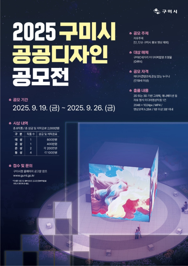 2025 구미시 공공디자인 공모전 공모분야 디자인/캐릭터 접수기간2025.09.19 ~ 2025.09.26 D+138 종료 참가자격 제한없음 주최구미시 주관구미시 1등상금(상품)500만원~1천만원 홈페이지 바로가기 첨부파일 다운로드 유의사항 ※본 내용은 참고 자료로 내용의 오류와 변동에 대해 책임지지 않습니다. (오류 및 변동 신고는 상단의 '제안/오류' 신고를 통해 해주십시오.) ※주최사 사정에 따라 일정 및 내용이 변경될 수 있으니 주최사 홈페이지 등을 통해 관련 안내를 수시로 확인하시기 바랍니다. 상세내용 ■ 제목2025 구미시 공공디자인 공모전 ■ 기간 - 접수기간 : 2025. 9. 19.(금) ~ 9. 26.(금) 18:00까지 ■ 참가자격만19세 이상 누구나 / 1인(팀) 최대 1작품 응모 ※ 팀 구성은 3인 이내로 제한 ■ 참여방법 / 접수방법<공모주제> 자유주제(단순 구미시 홍보 영상 제외) <공모내용>가. 목적 : 첨단기술과 예술을 융합한 미디어아트를 구미IC 진입 관문에 전시, 포토존 및 랜드마크로서 구미시민 및 방문객들에게 시각적 즐거움을 제공하고 ‘스마트 미래도시 구미’ 이미지를 조성하기 위함. 나. 대상매체 : G큐브(미디어복합형 조형물, 신평동 158-2번지 일원) <접수방법>이메일 접수※ 접수 마감일까지 이메일로 아래와 같이 파일을 제출하여야 함 아래“응모제출물 가, 나”의 파일을 하나의 폴더에 넣어 압축(ZIP파일)후 이메일 제출 (폴더명 예시 : 공공디자인공모전_이름.zip) 이메일주소 : vjgh99@korea.kr <응모제출물>가. 출품신청서, 작품설명서, 개인정보 수집·이용동의서, 저작재산권 양도동의서 각 1부 (별지 제1~4호 서식) ※ 출품신청서 등 제출서류는 직접 서명하여 스캔본으로 제출(당선작은 추후 원본 제출) ※ 작품설명서는 A4 사이즈 3매 이내로 작성 ※ 공모요강 및 양식 : 구미시 홈페이지(www.gumi.go.kr) → 행정정보 → 행정알림 → 고시·공고·입법 나. 영상작품 1건 영상길이 : 1분 이상 3분 이내 영상규격 : 2,048×1,024px / MP4 / 영상코덱 h.264 / 오디오 없음 제작방식 : 2D 또는 3D 기반의 그래픽, 애니메이션 등 자유형식 ※ 세부사항은 첨부 상세규격 참조 ■ 시상내용 / 혜택 구 분상 금저작재산권료소 계작품수총 합계대 상400만원400만원800만원1800만원금 상 200만원200만원400만원1400만원은 상100만원100만원200만원2400만원동 상 50만원50만원100만원4400만원 ■ 유의사항 수상작은 구미IC 네거리 인근에 설치된 미디어 복합조형물(G큐브)에 송출될 예정이며 구미시 홍보영상이나 SNS에서 활용되어 외부에 공개됨 모든 출품작은 공공장소에 전시되는 점을 감안하여 전시표출에 적합한 내용으로 제작 및 편집되어야 함 모든 출품작은 저작권 분쟁이 없는 순수 창작물이어야 하며. 타인의 법상 인정되는 일체의 지적재산권 또는 인격권 등을 침해하지 않는 작품이어야 함. 관련 문제 발생 시 수상작 시상 취소 및 시상 내역(상장·상금)이 환수되며, 이에 따른 모든 법적 책임은 출품자에게 있음 특정 개인·단체·기업 등의 수익사업 및 홍보와 관련된 사항은 제외함 수상작 수는 심사결과에 따라 변경될 수 있으며, 수상작이 없을 수 있음 수상작품에 대한 일체의 권리는 구미시가 소유함 ※ 참가자는 저작권 양도동의서를 함께 제출하지 않은 경우, 참가의 제한을 받을 수 있음 저작재산권의 양도 동의를 하는 경우, 상응하는 보상을 하기 위하여 시상금에 저작재산권료를 지급함. 수상작은 필요에 따라 송출 규격이나 형식이 변동되어 추가 수정 요청할 수 있음. 이에 대한 저작재산권 및 제2차적 저작물 수정권, 소유권은 주최자에게 있으며 필요시 주최자가 수상작을 변형하는 것에 수상자가 동의한 것으로 간주함. 수상자는 수상작의 출판, 전시, 시상식 참여에 따른 요청 시 적극 협조하여야 함. 제출 작품(영상, 작품설명서 등)에는 참가자를 알릴 수 있는 내용이 포함될 경우 심사에서 제외됨. 제출물의 규격이 맞지 않을 경우에는 감점됨. 응모 제출물 미제출 시에는 심사에서 제외됨. 주 내용이 단순 구미시 홍보영상으로 판단될 경우 심사에서 제외됨. 심사와 관련된 사항은 구미시의 고유권한이며 출품작에 대한 심사 내용 등 관련 자료는 비공개함 입상하지 않은 응모작은 공모전 종료일로부터 3개월 이후에 폐기함. 본 공모 내용 및 일정은 사정에 따라 예고 없이 변경될 수 있으며, 변경될 경우에는 구미시청 홈페이지에 게재하고, 공모 요강에 설명되지 않은 세부사항은 구미시 미래도시전략과에서 결정함. ■ 문의구미시청 미래도시전략과 : 054-480-2594 (F.054-480-2569) 목록