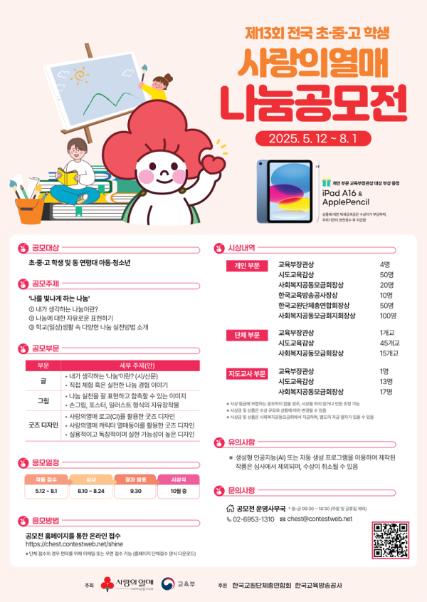 제13회 전국 초,중,고등학생 사랑의열매 나눔공모전 공모분야 문학/시나리오, 논문/수기/사례, 웹툰/포스터/미술, 디자인/캐릭터 접수기간2025.05.12 ~ 2025.08.01 D+193 종료 참가자격 청소년, 어린이/초등학생 주최사랑의열매, 교육부 1등상금(상품)기타 홈페이지 바로가기 첨부파일 다운로드 유의사항 ※본 내용은 참고 자료로 내용의 오류와 변동에 대해 책임지지 않습니다. (오류 및 변동 신고는 상단의 '제안/오류' 신고를 통해 해주십시오.) ※주최사 사정에 따라 일정 및 내용이 변경될 수 있으니 주최사 홈페이지 등을 통해 관련 안내를 수시로 확인하시기 바랍니다. 상세내용 ■ 제목제13회 전국 초,중,고등학생 사랑의열매 나눔공모전 ■ 기간 - 접수 기간 : 2025년 5월 12일 (월) ~ 8월 1일 (금) 23:59 ■ 참가자격 초·중·고 학생 및 동 연령대 아동·청소년 ■ 참여방법 / 접수방법● 공모주제 : 나를 빛나게 하는 나눔1) 내가 생각하는 나눔이란?2) 나눔에 대한 자유로운 표현하기3) 학교(일상)생활 속 다양한 나눔 실천 방법 소개 ● 공모부문 : 글, 그림, 굿즈 디자인 <응모방법> (1) 공모전 홈페이지(https://chest.contestweb.net/shine) (2) 단체 접수의 경우 편의를 위해 이메일 또는 우편 접수 가능 (단체접수 양식 작성 및 제출 필수)- 이메일 : chest@contestweb.net- 우편 : 서울시 송파구 오금로 185, 4층 나눔공모전 운영사무국 (Tel. 02-6953-1310) ■ 시상내용 / 혜택개인 부문 교육부장관상 4인 부상으로 iPad A16 및 애플펜슬 증정 * 제세공과금 원천징수 후 지급 ■ 유의사항 - 생성형 인공지능(AI) 또는 자동 생성 프로그램을 이용하여 제작된 작품은 심사에서 제외되며, 수상이 취소될 수 있음 - 자세한 형식과 규격, 시상 내역은 홈페이지 공고문을 참조 바랍니다. 목록