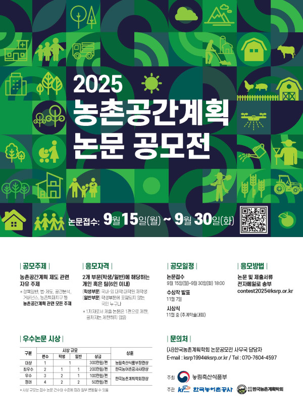 2025년 농촌공간계획 논문 공모전 공모분야 논문/수기/사례 접수기간2025.09.15 ~ 2025.09.30 D+133 종료 참가자격 제한없음 주최농림축산식품부 주관한국농어촌공사, (사)한국농촌계획학회 1등상금(상품)200만원~499만원 홈페이지 바로가기 첨부파일 다운로드 유의사항 ※본 내용은 참고 자료로 내용의 오류와 변동에 대해 책임지지 않습니다. (오류 및 변동 신고는 상단의 '제안/오류' 신고를 통해 해주십시오.) ※주최사 사정에 따라 일정 및 내용이 변경될 수 있으니 주최사 홈페이지 등을 통해 관련 안내를 수시로 확인하시기 바랍니다. 상세내용 ■ 제목2025년 농촌공간계획 논문 공모전 ■ 기간 - 접수 기간 : 9.15.∼9.30. 18:00까지 ■ 참가자격응모 자격 : 2개 부문(학생/일반)에 해당하는 개인 혹은 팀(6인 이내) ㅇ(학생부문) 국내·외 대학/대학원 재학생 * 휴학생 또는 졸업예정자를 포함하며, 지도교수 1인이 교신저자로 참여 가능 * 학생부문임을 증명하는 자료(공고일 이후 발급받은 재학증명서) 제출 ㅇ (일반부문) 학생부문에 포함되지 않는 국민 누구나(제한없음) * 학생과 학생이 아닌 사람이 함께 응모하는 경우에는 일반부문으로 참여 ■ 참여방법 / 접수방법<논문 주제> 농촌공간계획 제도 관련 자유 주제 ※ 학술논문·기술논문 구분 없이 응모 가능하며, △정책일반, △법·제도, △공간분석, △거버넌스, △농촌특화지구 등 농촌공간계획 관련 모든 주제 가능 <응모방법> (사)한국농촌계획학회 이메일 주소(contest2025@ksrp.or.kr)로 제출서류를 접수 마감일(9월 30일) 18:00까지 제출 - 제출 시 이메일 제목 : “논문 공모_(1저자 성명)_(논문 제목)” * 1저자로서 제출 논문은 1편으로 제한, 공저자는 제한하지 않음 <제출서류> ①응모신청서, ②서약서, ③표절 검사 결과서, ④공고일 이후 발급받은 재학증명서(학생부문의 경우), ⑤논문 본문(한글/A4 8~10매) * 응모신청서, 서약서 등 작성 서식은 별지 참고 - 논문 작성기준·양식은 (사)한국농촌계획학회 규정에 따름(별지 참고) - 응모 논문에는 소속기관, 연구비 지원기관, 과제명 등 일체의 사사표기 금지 - 학생부문에 응모한 모든 응모자는 재학증명서 제출(교신저자 제외) -표절검사 결과서는 한국연구재단 ‘KCI 문헌 유사도 검사’ 결과 확인서(상세)로 제출 * 필요시 KCI 회원가입 후 사용 안내에 따라 진행 - 제출 시 파일명 : ①“(1저자 성명)_공모신청서.pdf“ ②“(1저자 성명)_서약서.pdf“ ③“(1저자 성명)_표절 검사 결과서.pdf“ ④“(성명)_재학증명서.pdf“ ⑤“(1저자 성명)_(논문제목).hwp“ ■ 시상내용 / 혜택 구분시상 규모상훈계학생일반상금대상11300만원/편농림축산식품부 장관상최우수상211200만원/편한국농어촌공사사장상우수상321100만원/편(사)한국농촌계획학회 학회장상장려상42250만원/편 ※ 수상작 중 우수논문에 대해서는 학회의 별도 기준에 따라 ’26년 한국농촌계획학회 정기 논문집(농촌계획)에 수록할 수 있음 ■ 유의사항ㅇ국문 작품만 응모 가능하며 제출한 모든 자료는 반환되지 않음 ㅇ응모 주제 및 형식에 부적합, 심사기준에 현저히 미달, 부정한 방법(연구 윤리 위반 등)으로 작성 등으로 판단 시 부적격 처리 ㅇ본 공모전은 공정한 심사와 자발적 참여를 유도하기 위해 응모 논문에 소속기관, 연구비 지원기관, 과제명 등 일체의 사사 표기를 금지하고 있으며, 사사 표기가 포함된 응모작은 심사 대상에서 제외될 수 있음 ㅇ응모자는 제1저자로 1편의 논문만 제출할 수 있으며, 공저자로는 복수의 논문에 참여할 수 있음 ㅇ응모작은 순수 창작물이어야 하며, 타 공모전 응모작⋅유사 작품, 학위 논문, 학술지 등에 이미 발표·공개된 논문은 응모 불가 ㅇ저작권 등 기타 일체의 권리를 침해하는 논문으로 확인되어 법적인 문제 발생 시 수상 취소, 상금·부상 환수 등 불이익이 있을 수 있음 ㅇ제출된 논문의 저작권 분쟁·표절·명예훼손 및 응모작과 관련된 모든 분쟁에 따른 모든 민·형사상의 법적 책임은 응모자에게 있음 ㅇ심사는 (사)한국농촌계획학회가 심사위원회를 구성하여 비공개로 진행되며, 심사 결과에 대해 이의를 제기할 수 없음 ㅇ심사 결과 일정 수준 이상의 논문이 없을 경우 시상 내역을 변경하거나 시상하지 않을 수 있음 ㅇ공동 응모작 수상 시 상금은 대표자(1저자)에게 지급을 원칙으로 함 ㅇ수상작 저작권은 응모자에게 귀속하나, 수상작의 온·오프라인 광고, 전시, 홍보 등 목적으로 공개 배포하거나 2차 가공하여 배포하는 등의 포괄적이고 비영리적인 사용 권한을 공모전 주최/주관기관이 보유 ㅇ본 공모전에서 수상한 논문을 타 학회지 등에 게재할 경우 다음과 같이 표기: ”본 논문은 농림축산식품부와 한국농어촌공사, (사)한국농촌계획학회가 주최/주관하는 ’25년 농촌공간계획 논문 공모전에서 수상작으로 선정된 논문을 수정 보완한 논문임“ ■ 문의ㅇ(논문접수 및 심사) (사)한국농촌계획학회 논문공모전 사무국 담당자 (e-mail : ksrp1994@ksrp.or.kr. / TEL 070-7604-4597) ㅇ(기타 공모전 운영) 한국농어촌공사 논문공모전 담당자 (e-mail : 2060161@ekr.or.kr / TEL 044-202-0340) 목록