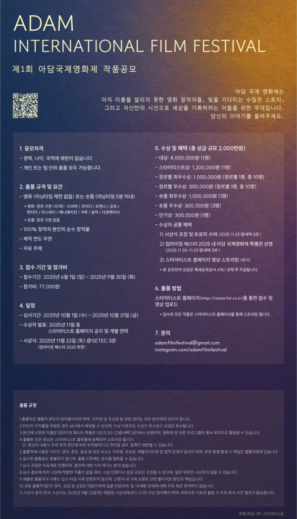 제1회 아담국제영화제 작품공모 공모분야 사진/영상 접수기간2025.06.01 ~ 2025.09.30 D+132 종료 참가자격 제한없음 주최(주)스타아티스트 1등상금(상품)200만원~499만원 홈페이지 바로가기 첨부파일 다운로드 유의사항 ※본 내용은 참고 자료로 내용의 오류와 변동에 대해 책임지지 않습니다. (오류 및 변동 신고는 상단의 '제안/오류' 신고를 통해 해주십시오.) ※주최사 사정에 따라 일정 및 내용이 변경될 수 있으니 주최사 홈페이지 등을 통해 관련 안내를 수시로 확인하시기 바랍니다. 상세내용 ■ 제목제1회 아담국제영화제 작품공모 ■ 기간 - 접수기간: 2025년 6월 1일 (일) ~ 2025년 9월 30일 (화) ■ 참가자격- 경력, 나이, 국적에 제한이 없습니다. - 개인 또는 팀 단위 출품 모두 가능합니다. ■ 참여방법 / 접수방법<출품 규격 및 요건> - 영화 (러닝타임 제한 없음) 또는 숏폼 (러닝타임 5분 이내) ※ 영화 : 장르 구분 (10개)- 드라마 / 코미디 / 로맨스 / 공포 / 판타지 / 미스테리 / 애니메이션 / 가족 / 음악 / 다큐멘터리 ※ 숏폼 : 장르 구분 없음 - 100% 창작자 본인의 순수 창작물 - 100% 본인 창작물 - 제작 연도 무관 - 자유 주제 <출품 방법>스타아티스트 홈페이지를 통한 접수 및 영상 업로드 : https://www.starartist.co.kr/contest/18 ● 참가비 : 77,000원 ■ 시상내용 / 혜택 - 대상 1명 : 400만원 - 스타아티스트상 1명 : 120만원 - 장르별 최우수상 장르별 1명, 총 10명 : 각 100만원 - 장르별 우수상 장르별 1명, 총 10명 : 각 30만원 - 숏폼 최우수상 1명 : 100만원 - 숏폼 우수상 3명 : 각 30만원 - 인기상 1명 : 30만원 ※ 상금은 제세공과금(4.4%) 공제 후 지급됩니다. <수상자 공통 혜택> - 시상식 초청 및 트로피 수여 - 업라이징 페스타 2025 내 아담 국제영화제 특별관 상영 - 스타아티스트 홈페이지 영상 스트리밍 ■ 문의 - adamfilmfestival@gmail.com - instagram.com/adamfilmfestival 목록