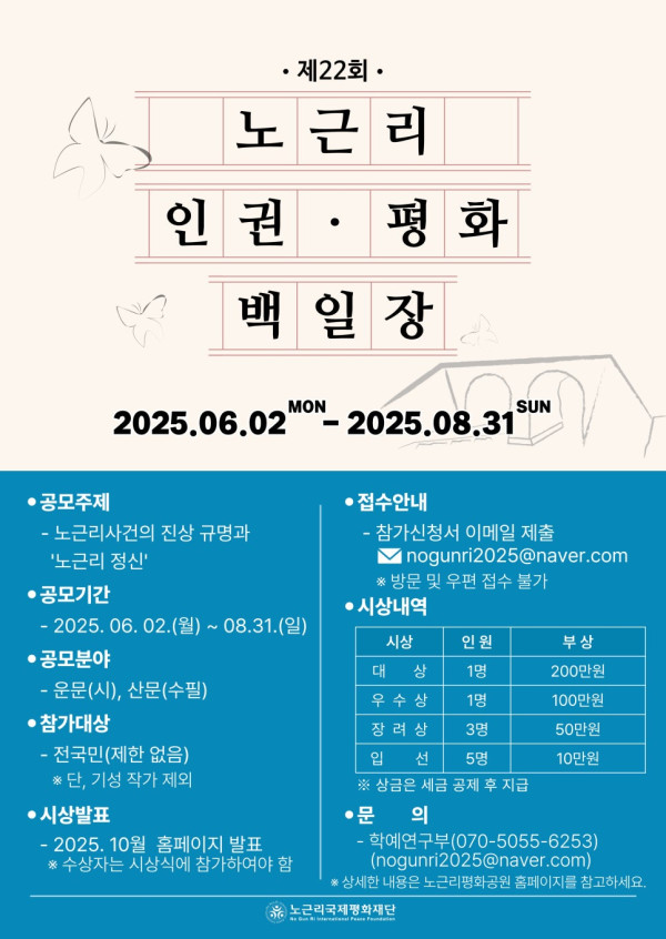 제22회 노근리 인권 평화 백일장 공모전 공모분야 문학/시나리오, 대회/전시/제작 접수기간2025.06.02 ~ 2025.08.31 D+45 종료 참가자격 제한없음 주최(사)노근리국제평화재단 1등상금(상품)200만원~499만원 홈페이지 바로가기 첨부파일 다운로드 유의사항 ※본 내용은 참고 자료로 내용의 오류와 변동에 대해 책임지지 않습니다. (오류 및 변동 신고는 상단의 '제안/오류' 신고를 통해 해주십시오.) ※주최사 사정에 따라 일정 및 내용이 변경될 수 있으니 주최사 홈페이지 등을 통해 관련 안내를 수시로 확인하시기 바랍니다. 상세내용 ■ 제목제22회 노근리 인권 평화 백일장 공모전 ■ 기간 - 접수기간 : 2025년 6월 2일(월) ~ 8월 31일(일) (18:00 마감) ■ 참가자격대한민국 국민 (제한없음) ※연령 제한 없음. 다만, 기성작가와 문예지 등의 등단자는 제외함 ■ 참여방법 / 접수방법<공모주제> - 노근리사건의 진상 규명과 그 속에 투영된 ‘노근리정신’ - 노근리사건의 아픔과 인권·평화의 중요성 ● 출품부문: 산문(수필) 또는 운문(시) <형식 및 분량> 산 문운 문⚬1인 1편⚬A4용지 5매 내외⚬HY신명조 13포인트 줄간격 160%⚬용지여백: 상,하,좌,우 20, 머리말,꼬리말 15 ⚬1인 2편 이내⚬정형시, 자유시 등 형식의 제한 없음⚬HY신명조 13포인트 줄간격 160%⚬용지여백: 상,하,좌,우 20, 머리말,꼬리말 15 <제출방법> ○ 온라인 접수(전자우편): nogunri2025@naver.com ※방문 및 우편 접수 불가 ○ 노근리평화공원 홈페이지에 참가신청서 다운로드 후 작성 ○ 표절 여부 검증을 위하여 한글파일 제출 ○ 파일명: 제22회 노근리 백일장 응모 000(이름) <제출서류> ○ 참가신청서 ○ 개인정보수집 및 이용동의서 ○ 출품작품 <심사 시 가점 반영 사항> ○ 노근리사건 진상규명과정 포함 및 ‘노근리정신’을 반영한 작품을 우대함 ○ 최근 노근리 사건 관련 현안 사항을 반영하고 있는 작품을 우대함 ※동점자일 경우 위 가점 사항을 우선 반영 ■ 시상내용 / 혜택 대상우수상장려상입선1편1편3편5편200만원100만원50만원10만원 ※상금은 원천징수세액(수상자 부담) 공제 후 지급 ※수상자는 노근리평화공원에서 개최되는 시상식에 참가하여야 함 ■ 유의사항 모든 응모작은 미발표된 순수 창작물이어야 하며, 표절 작품은 심사에서 제외됨 ※수상 이후라도 표절 판명 시 즉시 입상을 취소하며 수상자는 시상금을 반환함은 물론 모든 법적 책임을 부담해야 함 심사 점수는 공개하지 않으며, 심사와 관련된 평가 내용은 공개되지 않음 적합한 수상작이 없는 경우 시상하지 않을 수도 있음 제출된 서류는 반환하지 않음 대회 관련 내용을 숙지하지 않아 생기는 불이익은 응모자 본인에게 책임이 있음 응모된 작품에 대한 저작권은 응모자에게 있으나, 수상작에 한하여 수상작품집 등을 복제, 배포 (온라인, 인쇄)하기 위해 저작재산권 (홍보 등을 위한 2차적 저작물 작성권 포함) 중 일부를 양수하거나 이용 허락을 받을 수 있으며 이 경우에는 응모자와 별도로 협의하여 정함 입상하지 않은 응모작은 공모전 종료 후 3개월 이내 모두 폐기함 수상자는 인권·평화 백일장 시상식에 참석 하여야 함 ■ 문의기타 자세한 사항은 담당자에게 문의 바람 -학예연구팀 070-5055-6253/ nogunri2025@naver.com -홈페이지 https://yd21.go.kr/nogunri/ 목록