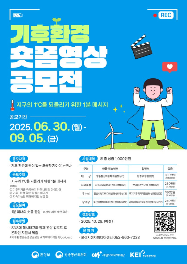 2025년 기후환경 숏폼 영상공모전 공모분야 사진/영상 접수기간2025.06.30 ~ 2025.09.05 D+40 종료 참가자격 제한없음 주최방송통신위원회, 환경부 주관시청자미디어재단, 한국환경연구원 1등상금(상품)100만원~199만원 홈페이지 바로가기 첨부파일 다운로드 유의사항 ※본 내용은 참고 자료로 내용의 오류와 변동에 대해 책임지지 않습니다. (오류 및 변동 신고는 상단의 '제안/오류' 신고를 통해 해주십시오.) ※주최사 사정에 따라 일정 및 내용이 변경될 수 있으니 주최사 홈페이지 등을 통해 관련 안내를 수시로 확인하시기 바랍니다. 상세내용 ■ 제목2025년 기후환경 숏폼 영상공모전 ■ 개요기후위기에 대응하는 실천과 전환의 이야기를 미디어로 공유하는 숏폼 영상(60초 이내) 공모전 ■ 기간 - 접수기간: 2025. 6. 30.(월) ~ 2025. 9. 5.(금) 23:59까지 - 발표일자: 2025년 10월 29일(수) 예정o 발표방법: 시청자미디어재단·한국환경연구원 홈페이지 및 SNS 채널 게재, 수상자 개별 통보o 별도의 시상식은 개최되지 않으며, 시상금 및 상장은 수상자 개별 전달 ■ 참가자격기후·환경에 관심 있는 초등학생 이상 누구나※ 2006년생을 포함한 이전 출생자는 일반부로 지원※ 2007년생부터 2018년생까지는 아동·청소년부로 지원 ■ 참여방법 / 접수방법<공모부문> 숏폼 영상(60초 이내, 가로·세로 영상 제한 없음)※ 영상의 방향은 제한이 없으나, 해상도 FHD(1,080px*1,920px 이상), 포맷 mp4 권장 <공모주제> 지구의 1℃를 되돌리기 위한 1분 메시지※ 소재 예시 ① 기후·환경 일상 속 실천 이야기 ② 기후위기를 극복하기 위한 나만의 아이디어 ③ 지속가능한 미래에 대한 상상 <공모방법> SNS*에 필수 해시태그**와 함께 영상 업로드 후 온라인 지원서*** 제출 ※ SNS 비공계 계정 참여 불가*참여가능 SNS(유튜브, 인스타그램, 페이스북, 네이버블로그)**필수해시태그(#기후환경숏폼영상공모전 #기후위기적응 @gori_eco)***온라인 지원서 링크 및 QR코드 ■ 시상내용 / 혜택아동청소년부, 일반부 구분 시상 - 각 부문 대상 1 : 각 상장 및 상금 150만원 - 각 부문 최우수상 2 : 각 상장 및 상금 70만원 - 각 부문 우수상 3 : 각 상장 및 상금 30만원 - 각 부문 장려상 12 : 각 상장 및 상금 10만원 ■ 문의시청자미디어재단 울산센터 052-960-7033 / yun1@kcmf.or.kr※평일 9:00~17:00 (휴게시간 12:00~13:00 제외, 주말 및 공휴일 문의 불가) 이외 시간은 메일로 문의 목록