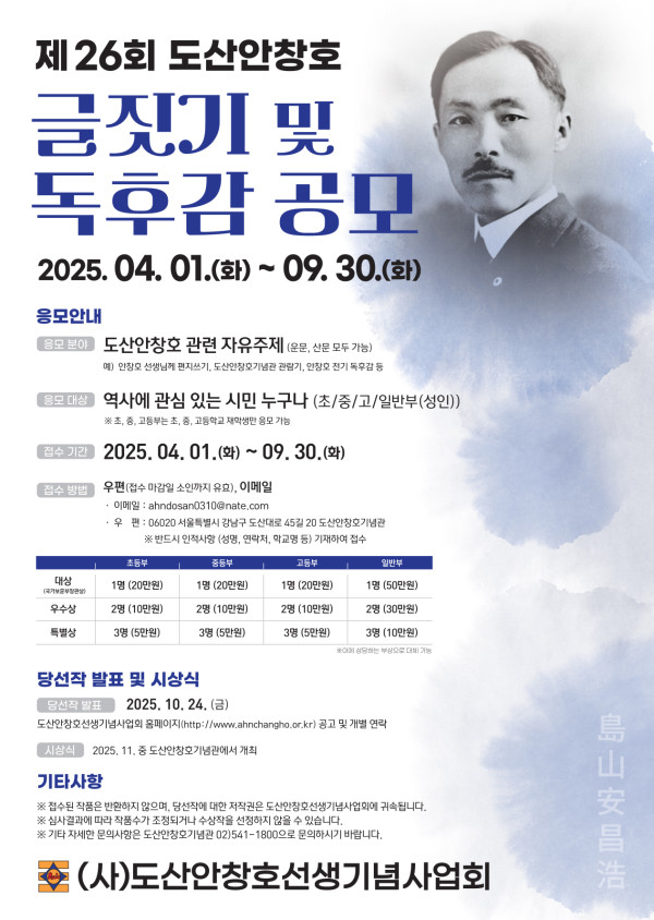 제26회 도산안창호 글짓기 및 독후감 공모전 공모분야 문학/시나리오, 논문/수기/사례 접수기간2025.04.01 ~ 2025.09.30 D+14 종료 참가자격 제한없음 주최(사)도산안창호선생기념사업회 주관도산안창호기념관 1등상금(상품)100만원 이하 홈페이지 바로가기 첨부파일 다운로드 유의사항 ※본 내용은 참고 자료로 내용의 오류와 변동에 대해 책임지지 않습니다. (오류 및 변동 신고는 상단의 '제안/오류' 신고를 통해 해주십시오.) ※주최사 사정에 따라 일정 및 내용이 변경될 수 있으니 주최사 홈페이지 등을 통해 관련 안내를 수시로 확인하시기 바랍니다. 상세내용 제26회 도산안창호 글짓기 및 독후감 공모전● 참가 자격 - 역사에 관심 있는 시민 누구나(초/중/고/일반부(성인)) * 초, 중, 고등부는 초, 중, 고등부는 초, 중, 고등학교 재학생만 응모 가능● 공모 주제 - 도산안창호 관련 자유주제(운문, 산문 모두 가능) - 예: 안창호 선생님께편지쓰기, 도산안창호기념관 관람기, 안창호 전기 독후감 등● 공모 일정 - 2025.04.01.(화)~09.30.(화)● 시상 내역 - 초등부: 대상(국가보훈부장관상, 1명,20만원)/ 우수상(2명, 10만원))/ 특별상(3명, 5만원) - 중등부:대상(국가보훈부장관상, 1명,20만원)/ 우수상(2명, 10만원))/ 특별상(3명, 5만원) - 고등부:대상(국가보훈부장관상, 1명,20만원)/ 우수상(2명, 10만원))/ 특별상(3명, 5만원) - 일반부: 대상(국가보훈부장관상, 1명, 50만원)/ 우수상(2명, 30만원)/ 특별상(3명, 10만원)● 접수 방법 - 우편(접수 마감일 소인까지 유효), 이메일 - 이메일: ahndosan0310@nate.com - 우편: 06020 서울특별시 강남구 도산대로 45길 20 도산안창호기념관 * 반드시 인적사항(성명, 연락처, 학교명 등) 기재하여 접수● 당선작 발표 및 시상식 - 당선작 발표: 2025. 10. 24. (금) - 도산안창호선생기념사업회 홈페이지(http://www.ahnchangho.or.kr) 공고 및 개별 연락 - 시상식: 2025. 11. 중 도산안창호기념관에서 개최● 유의 사항 - 접수된 작품은 반환하지 않으며, 당선작에 대한 저작권은 도산안창호선생기념사업회에 귀속됩니다. - 심사결과에 따라 작품수가 조정되거나 수상작을 선정하지 않을 수 있습니다.● 문의 사항 - 기타 자세한 문의사항은 도산안창호기념관 02)541-1800으로 문의하시기 바랍니다. 목록