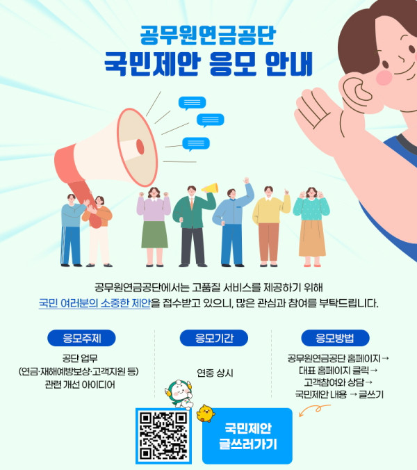 공무원 연금공단 국민제안 응모 공모분야 기획/아이디어/마케팅, 정책 제안 접수기간2025.06.25 ~ 2025.12.31 D+37 종료 참가자격 제한없음 주최공무원 연금공단 주관공무원 연금공단 1등상금(상품)200만원~499만원 홈페이지 바로가기 첨부파일 다운로드 유의사항 ※본 내용은 참고 자료로 내용의 오류와 변동에 대해 책임지지 않습니다. (오류 및 변동 신고는 상단의 '제안/오류' 신고를 통해 해주십시오.) ※주최사 사정에 따라 일정 및 내용이 변경될 수 있으니 주최사 홈페이지 등을 통해 관련 안내를 수시로 확인하시기 바랍니다. 상세내용 ■ 제목공무원 연금공단 국민제안 응모 ■ 개요공무원연금공단에서는 고품질 서비스를 제공하기 위해 국민 여러분의 소중안 제안을 상시 접수 받고 있습니다. ■ 기간접수 기간 : ~2025. 12. 31. (연중 상시 접수) ■ 참가자격제한 없음 ■ 참여방법 / 접수방법<응모주제> - 공단 업무 (연금, 재해예방보상, 고객지원 등) 관련 개선 아이디어 <응모방법>공무원연금공단 홈페이지 -> 고객참여와 상담 -> 국민제안 내용 -> 글쓰기 ■ 시상내용 / 혜택 - 채택포상금 : 2만원 - 제안포상금 : 금상 120만원 / 은상 80만원 / 동상 40만원 - 예산성과금 : S 240만원 / A 160만원 / B 80만원 ■ 유의사항자세한 내용은 홈페이지 공고 내용을 참조 바랍니다. ■ 문의공무원 연금공단 혁신기획실 : 064-802-2053 목록