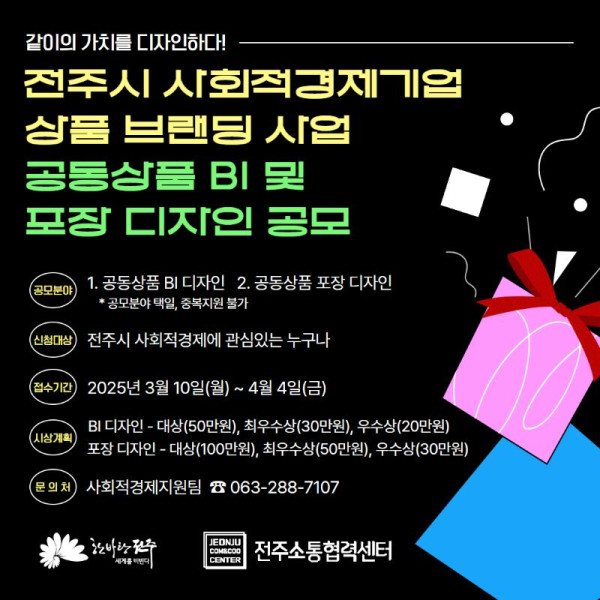 전주시 사회적경제기업 상품 브랜딩 사업 - 공동상품 BI 및 포장디자인 공고 공모분야 디자인/캐릭터, 기타분야 접수기간2025.03.10 ~ 2025.04.04 D+315 종료 참가자격 제한없음 주최전주시 1등상금(상품)100만원~199만원 홈페이지 바로가기 첨부파일 다운로드 유의사항 ※본 내용은 참고 자료로 내용의 오류와 변동에 대해 책임지지 않습니다. (오류 및 변동 신고는 상단의 '제안/오류' 신고를 통해 해주십시오.) ※주최사 사정에 따라 일정 및 내용이 변경될 수 있으니 주최사 홈페이지 등을 통해 관련 안내를 수시로 확인하시기 바랍니다. 상세내용 ■ 제목전주시 사회적경제기업 상품 브랜딩 사업 - 공동상품 BI 및 포장디자인 공고 ■ 기간 - 접수기간: 2025년 3월 10일(월) ~ 4월 4일(금) - 발표심사 및 시상식 : 2025년 4월 11일(금) 14시~18시 장소 추후 공지 * 발표심사는 응모자 참석 필수 (본인 확인 절차 진행 ■ 참가자격전주시 사회적경제에 관심있는 누구나 ■ 참여방법 / 접수방법<공모분야> 1. 공동상품 BI 디자인 2. 공동상품 포장 디자인* 공모분야 택일, 중복지원 불가 <공모주제> 같이 만드는 가치, 지속가능한 내일을 위한 사회적경제 브랜드 <공모내용> 전주시 사회적경제기업 제품으로 구성된 공동상품 BI 및 포장 디자인 - 공동상품에 담긴 사회적가치 및 윤리적소비 의의 강조 - 공동상품의 지속가능성을 위한 ESG 세부 요소 고려 <제출 서류> 신청서, 세부 설명서, 서약서, 개인정보 수집·이용 및 제공 동의서 각 1부 (붙임1~4 참고), 디자인 원본파일(AI, PSD, EPS 등) 별도 첨부 <접수방법> 센터 이메일 접수(jsec9319@naver.com) ■ 시상내용 / 혜택<BI 디자인> - 대상 1명 : 50만원 - 최우수상 1명 : 30만원 - 우수상 1명 : 20만원 <포장 디자인> - 대상 1명 : 100만원 - 최우수상 1명 : 50만원 - 우수상 1명 : 30만원 ■ 유의사항- 1인당 1분야 1작품만 접수 가능함- 응모된 출품작의 권리는 원칙적으로 응모자에게 귀속되나, 시상 출품작의 권리는 전주시지역소통협력센터에 귀속됨- 응모자의 출품작은 이번 공모전을 위한 순수창작물이어야 하고, 타 공모전에서 수상한 작품은 심사대상에서 제외되며, 선정 후에라도 사실이 밝혀질 경우 선정을 취소하고 시상금을 환수함- 응모자는 출품작의 폰트 사용 시 저작권에 저촉되지 않는 한에서 사용 가능함 (AI 활용 시 발생할 수 있는 모든 법적 분쟁의 책임성은 응모자에게 있음)- 표절, 도용 등 국내외 사례 혹은 타인의 저작권을 침해한 것이 판명될 경우 본 공모전에 선정되었더라도 법적 분쟁 발생 시 모든 책임은 응모자 본인에게 있음- 출품작이 심사기준에 부합하지 않거나, 그 수준이 현격하게 낮을 경우 재공고를 실시할 수 있고, 시상 건수를 축소하거나 시상 내역 조정이 이루어질 수 있음- 시상금은 제세공과금 공제 후 지급함 ■ 문의전주소통협력센터 사회적경제지원팀 (☎063-288-7107) 목록