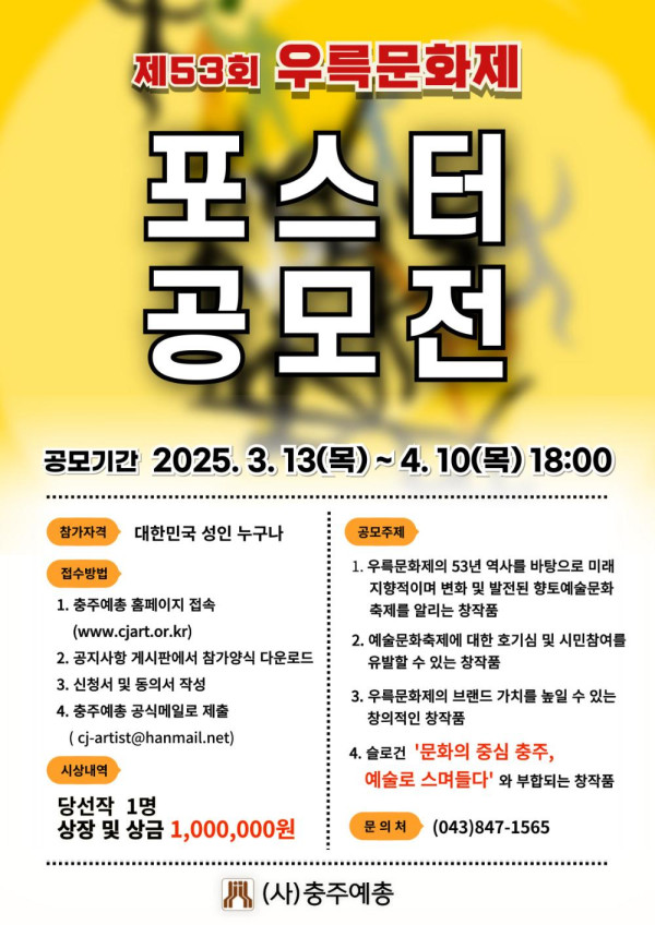 제53회 우륵문화제 포스터 공모전 공모분야 웹툰/포스터/미술 접수기간2025.03.13 ~ 2025.04.10 D+309 종료 참가자격 제한없음 주최한국예술문화단체총연합회 충주지회 1등상금(상품)100만원~199만원 홈페이지 바로가기 첨부파일 다운로드 유의사항 ※본 내용은 참고 자료로 내용의 오류와 변동에 대해 책임지지 않습니다. (오류 및 변동 신고는 상단의 '제안/오류' 신고를 통해 해주십시오.) ※주최사 사정에 따라 일정 및 내용이 변경될 수 있으니 주최사 홈페이지 등을 통해 관련 안내를 수시로 확인하시기 바랍니다. 상세내용 ■ 제목제53회 우륵문화제 포스터 공모전 ■ 개요2025 제53회 우륵문화제를 맞이하여 충북 충주에서 펼쳐지는 예술과 문화, 감동이 함께하는 축제를 홍보하고 참여를 유도할 수 있는 포스터 공모전을 개최합니다. ■ 기간 - 접수 기간 : 2025. 3. 13(목) ~ 4. 10(목) 18:00까지 - 결과 발표 : 2025년 4월 중 충주예총 홈페이지 공지사항 발표 ■ 참가자격대한민국 성인 누구나※ 1인 1개 작품 만 참여 ■ 참여방법 / 접수방법<공모 주제> - 우륵문화제의 53년 역사를 바탕으로 미래지향적이며, 변화 및 발전된 향토 예술문화 축제를 알리는 창작품 - 예술문화축제에 대한 호기심 및 시민참여를 유발 할 수 있는 창작품 - 우륵문화제의 브랜드 가치를 높일 수 있는 창의적인 창작품 - 슬로건 ‘문화의 중심 충주, 예술로 스며들다’ 와 부합되는 창작품 <접수 방법> 충주예총 홈페이지(http://www.cjart.or.kr) 공지사항에서 참가신청서 및 개인정보수집·활용 동의서를 다운로드 받아 E-MAIL 신청 (cj-artist@hanmail.net) ■ 시상내용 / 혜택 - 포스터 일 반 당선작 1명 : (사)충주예총 지회장상 + 상금 100만원 ■ 유의사항 - 출품작은 순수 창작물이여야하며, 본인의 작품이 아니거나 표절, 외국사례 복사 제출 또는 다른공모전에서 수상한 작품에 대해서는 심사에서 제외하며, 수상 후에도 위반 사실이 밝혀졌을 경우 당선 취소 및 시상금 환수 조치됩니다.- 당선작에 대한 제3자의 저작권, 특허권, 초상권 등의 모든 지적재산권 및 정보의 무단사용 등으로 인해 발생하는 법적문제에 대한 책임은 참가자 본인에게 있습니다. - 출품작 및 당선작에 대한 저작권(저작인격권, 저작재산권) 등 모든 권한은 참가자 본인에게 있습니다. - (사)충주예총은 당선작에 대한 무상사용권(실시권)을 가지며, 홍보를 목적으로 당선작을 2차 저작물로의 변형 및 이용 등 및 기념품 제작·판매 목적 등으로 사용할 수 있습니다. 이 경우 당선자의 저작재산권에 대한 이용료는 시상금으로 대체합니다. - 당선자는 출품작에 대한 [수정가능한 원본파일]을 주최 측에 제출해야 하며, 이를 거부할 시 당선을 취소할 수 있습니다. - 심사 기준에 따라 당선작이 선정되지 않을 수 있습니다.- 당선되지 않은 작품은 공모전 종료일로부터 1개월 이내에 모두 폐기되며, 응모자가 공모전 종료일로부터 1개월 이내에 반환을 요구하면 1주일 이내에 반환됩니다.- 시상금에 대한 제세공과금은 수상자 본인 부담이며, 공제 후 지급됩니다.- 상금 및 상장 지급을 위한 신분증, 통장사본 등 개인정보를 요구할 수 있으며, 이에 동의하지 않을 경우 시상금 지급이 제한될 수 있습니다. ■ 문의(사)충주예총 (043)847-1565 목록