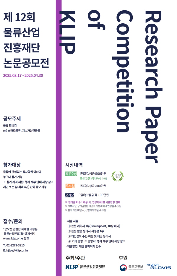 제 12회 물류산업진흥재단 논문공모전 공모분야 논문/수기/사례 접수기간2025.03.17 ~ 2025.04.30 D+289 종료 참가자격 제한없음 주최물류산업진흥재단 주관물류산업진흥재단 후원/협찬국토교통부, 현대글로비스 1등상금(상품)500만원~1천만원 홈페이지 바로가기 첨부파일 다운로드 유의사항 ※본 내용은 참고 자료로 내용의 오류와 변동에 대해 책임지지 않습니다. (오류 및 변동 신고는 상단의 '제안/오류' 신고를 통해 해주십시오.) ※주최사 사정에 따라 일정 및 내용이 변경될 수 있으니 주최사 홈페이지 등을 통해 관련 안내를 수시로 확인하시기 바랍니다. 상세내용 ■ 제목제 12회 물류산업진흥재단 논문공모전 ■ 개요물류산업진흥재단(이하 ‘재단’)은 현대자동차그룹 현대글로비스의 출연으로 설립되었으며, 국토교통부의 설립허가를 받은 기관입니다. 중소물류기업의 경쟁력 제고를 위한 역량강화 활동과 연구개발 및 학술 활동 등을 지원하고, 대중소기업간 상생협력체제를 구축하여 물류산업의 선진화를 도모하고자 합니다. 재단에서는 물류 인재 양성을 위해 국토교통부, 현대글로비스의 후원으로 논문 공모전을 개최합니다. 관심 있는 분들의 많은 참여를 바랍니다. ■ 기간 - 참가 신청 / 계획서 제출 : 2025. 3/17(월) ~ 4/30(수) ■ 참가자격 • 물류에 관심있는 석사학위 이하의 누구나 참가 가능 ※ 학력 : 석사학위 이하 * 석·박사통합과정 재학생 및 박사과정 재학생 참가 가능 ※ 참가 제한(1) 재단 주최 공모전에서 2회 이상 수상 경력이 있는 자(2) (수상작 限) 학회지 1곳 이상에 논문 투고 의사가 없는 자(3) 학술지(논문집) 등 다른 간행물에 발표된 논문을 제출한 자 • 개인 또는 팀(최대 4인) 단위 응모 가능 ■ 참여방법 / 접수방법<논문 주제> 물류 전 분야 ex) 스마트물류, 지속가능한 물류 등 <제출자료> ① ‘논문 과제 계획서’ 1부(PowerPoint) ② 논문 활용 동의서 서명본 PDF 1부 ③ 개인정보 수집·이용 및 제공 동의서 ④ 기타 증빙자료 - 학생 : 3개월 이내 재학(휴학)증명서 또는 졸업증명서 - 직장인 : 재직증명서 + (3개월 이내 재학(휴학)증명서 또는 졸업증명서) • 참가 신청 및 제출방법 : 재단 홈페이지 제출 (www.klip.or.kr) ※ 재단 홈페이지 메인 > 학술사업_논문공모 > “제12회 물류산업진흥재단 논문 공모전” ※ 별도의 신청서 제출 없이, 제출 가능 <과제 계획서 제출 형식> • PowerPoint 10장 내외 • 작성 S/W : PowerPoint • 작성방식 : 첨부파일의 ‘제12회 논문공모전 과제 계획서 양식’을 준수하여 작성 ■ 시상내용 / 혜택 - 최우수상 (국토교통부 장관상) 500만원 1편 - 우수상 300만원 1편 - 장려상 각 100만원 2편 ■ 유의사항 • 수상작은 재단 홈페이지 ‘물류정보플랫폼’에 게시하고 재단 뉴스레터 ‘물류로’에 게재됨 • 최우수상(국토부장관상) 수상자는 「2025 물류산업진흥 컨퍼런스」에 참가하여 수상 논문을 발표해야 함(별도의 프레젠테이션(PPT) 자료 제작 必) ※ 단, 당해년도 컨퍼런스 운영에 따라 발표 여부는 변경될 수 있음 • 학술지(논문집) 등 다른 간행물에 발표되지 않은(심사 중인 논문 포함) 것이어야 함 • 수상작은 반드시 2026년 이내 학회지 1곳 이상에 논문 투고를 하여야 함. 투고 의사가 없을 시 공모전 참여가 불가함 • 공모전에 응모한 논문을 타 학회지 등에 게재할 경우 다음을 참고하여 사사표기를 해야 하며, 이를 물류산업진흥재단에 고지하여야 함 “이 논문은 물류산업진흥재단이 주최/주관한 「제12회 논문 공모전」 최우수상(우수상·장려상)으로 선정된 논문(을 수정 보완한 논문)입니다.” “This research is based on the result of ‘The 10th Research Paper Competition’, which is the outstanding paper award through Foundation of Korea Logistics Industry Promotion(KLIP).” • 공모전에 출품된 저작물에 대한 저작권(저작재산권, 저작인격권)은 지원자에게 있으며, 수상 후에도 수상자에게 귀속됨을 원칙으로 함 • 제출된 응모작은 일체 반환하지 않으며, 재단은 수상작을 비영리·공익적 목적으로 활용할 수 있음 ※ 재단 뉴스레터 ‘물류로’ 內 게재를 통해 업계 내 논문을 알림. 재단 홈페이지 ‘물류정보플랫폼’ 內 게시하여 물류 관련 산·학·연 관계자들이 자료를 열람하고 참고할 수 있도록 함. 이 외 비영리·공익적인 목적으로 활용 예정 • 저서, 논문 등의 인용에 대해서는 반드시 원전을 명기하여야 함 • 팀 단위 참가 수상작의 경우는 제 1저자에게 상금을 지급함 • 논문 공모에 선정되었더라도 표절이나 응모자격 부적격 등 기타 부정한 방법으로 선정된 경우에는 수상을 당연 취소하며 상금은 상금환수를 통보받은 날부터 30일 이내에 재단에 상금 전액을 반환해야 함 • 논문 내용에 대한 표절시비, 기타 저작권법 위반여부에 대한 민·형사상의 책임은 논문 제출자에게 있음 ■ 문의 물류산업진흥재단 논문 공모전 담당자• Tel. 02-3279-3215• E-mail. hjlee@klip.or.kr 목록