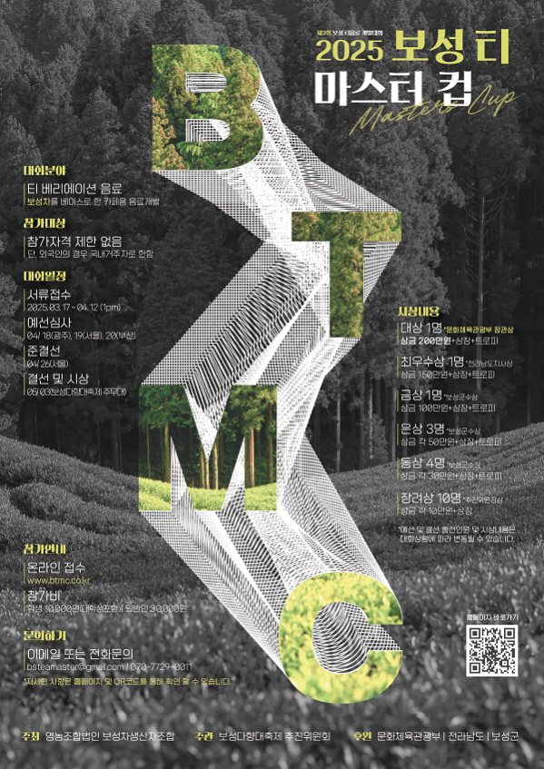 제 3회 보성 티음료 개발대회 보성 티 마스터 컵 공모분야 기획/아이디어/마케팅, 기타분야 접수기간2025.03.17 ~ 2025.04.12 D+307 종료 참가자격 제한없음 주최보성군, 영농조합법인 보성차생산자조합 주관보성다향대축제 추진위원회 1등상금(상품)200만원~499만원 홈페이지 바로가기 첨부파일 다운로드 유의사항 ※본 내용은 참고 자료로 내용의 오류와 변동에 대해 책임지지 않습니다. (오류 및 변동 신고는 상단의 '제안/오류' 신고를 통해 해주십시오.) ※주최사 사정에 따라 일정 및 내용이 변경될 수 있으니 주최사 홈페이지 등을 통해 관련 안내를 수시로 확인하시기 바랍니다. 상세내용 ■ 제목제 3회 보성 티음료 개발대회 보성 티 마스터 컵 ■ 기간 - 접수 기간 : 2025년 3월 17일 ~ 4월 12일 - 예선심사 : 광주 4/18 / 서울 4/19 / 부산 4/20 - 준결선 : 서울 4/26 - 결선 : 보성 5/3 (보성다향대축제 주무대) ■ 참가자격차(tea) 및 음료에 관심있는 누구나 (외국인의 경우 ‘국내 거주 외국인’만 가능) ■ 참여방법 / 접수방법<공모 주제> 티 베리에이션 음료 - 보성차를 베이스로 3가지 이상의 원/부재료를 믹싱 또는 토핑한 카페용 음료개발 - 보성에서 생산한 모든 차를 활용할 수 있습니다. - 단, RTD 상품은 사용을 금합니다. <참가비> - 학생 : 10,000원(대학생 포함) - 일반인 : 30,000원 ※ 입금 계좌 : 농협 301-0310-866-71 비즈업솔루션※ 참가비는 1인 1회 납입 시 최대 3개까지 출품이 가능합니다. 예시) 대학생 기준 총 3개 출품 시 1만원만 납입 <접수 방법> - 홈페이지(https://www.btmc.co.kr/) 제출 ■ 시상내용 / 혜택 - 대상(1명) : 상금 200만원 + 상장 + 트로피 + 판넬 (문화체육부장관상) - 최우수상(1명) : 상금 150만원 + 상장 + 트로피 + 판넬 (전라남도지사상) - 금상(1명) : 상금 100만원 + 상장 + 트로피 + 판넬 (보성군수상) - 은상(3명) : 각 상금 50만원 + 상장 + 트로피 + 판넬 (보성군수상) - 동상(4명) : 각상금 30만원 + 상장 + 트로피 + 판넬 (보성군수상) - 장려상(10명) : 각 상금 10만원 + 상장 + 판넬 (추진위원장상) <수상혜택> - 봇재 시그니처 음료 등록 - 개인매장 상품화, RTD 개발 등 판매 시 홍보지원 (상위 10인 / 언론 등) - 보성다향대축제 부스 지원 등 협의 후 진행 ■ 유의사항자세한 내용은 공식 홈페이지 내용을 참조 바랍니다. ■ 문의 - 전화 : 070-7729-0011 - 이메일 : bsteamaster@gmail.com(운영시간 : 평일 10~17시 / 주말 및 공휴일 휴무) 목록
