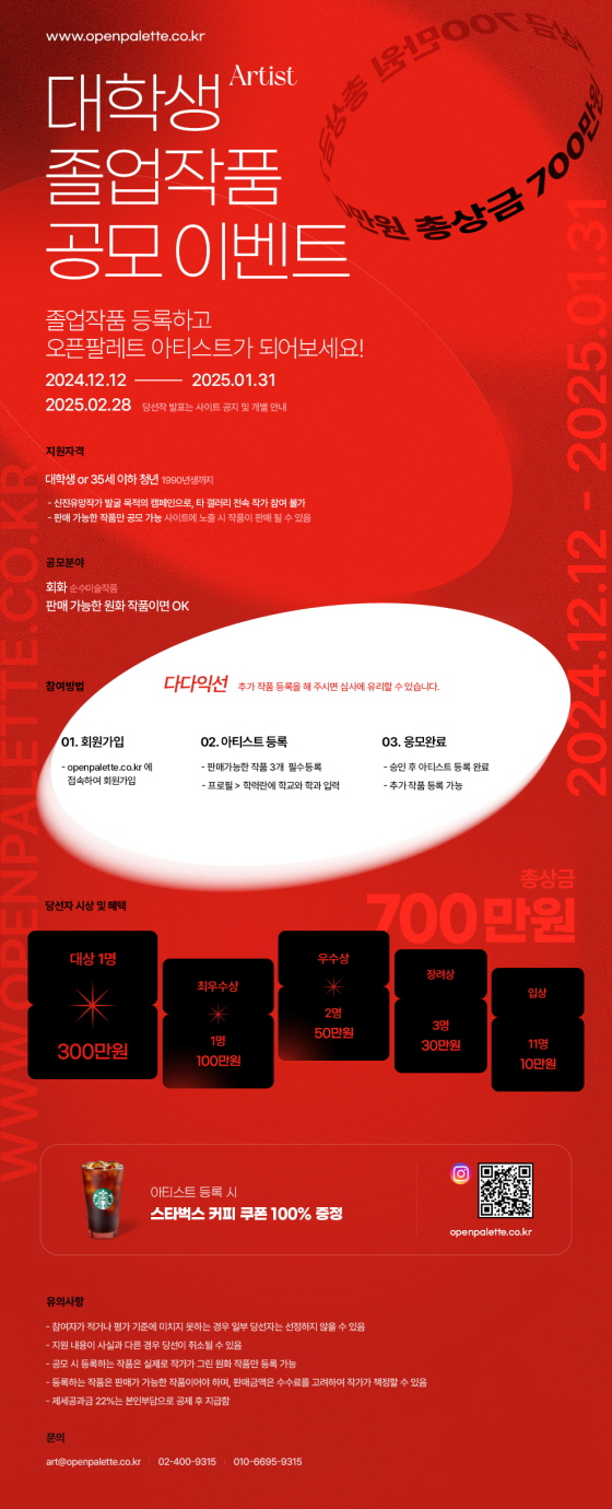 오픈팔레트 대학생 졸업작품 공모이벤트 공모분야 웹툰/포스터/미술, 디자인/캐릭터, 기타분야 접수기간2024.12.12 ~ 2025.01.31 D+377 종료 참가자격 대학(원)생/청년 주최오픈팔레트 1등상금(상품)200만원~499만원 홈페이지 바로가기 첨부파일 다운로드 유의사항 ※본 내용은 참고 자료로 내용의 오류와 변동에 대해 책임지지 않습니다. (오류 및 변동 신고는 상단의 '제안/오류' 신고를 통해 해주십시오.) ※주최사 사정에 따라 일정 및 내용이 변경될 수 있으니 주최사 홈페이지 등을 통해 관련 안내를 수시로 확인하시기 바랍니다. 상세내용 ■ 제목오픈팔레트 대학생 졸업작품 공모 이벤트 ■ 기간2024년 12월 12일 ~ 2025년 1월 31일 <당선작 발표> 2025년 2월 28일 (오픈팔레트 사이트 공지 및 개별 안내) ■ 참가자격대학생 or 35세 이하 청년 (1990년생까지) ■ 참여방법 / 접수방법<공모분야>회화 (순수미술작품 - 판매 가능한 원화 작품) <참여방법>openpalette.co.kr에 접속하여 회원가입아티스트 등록 : 판매가능한 작품 3개 필수 등록 / 프로필>학력란에 학교와 학과 입력응모완료 : 승인 후 아티스트 등록 완료 / 추가 작품 등록 가능 ■ 시상내용 / 혜택- 대상 1명: 300만원- 최우수상 1명: 100만원- 우수상 2명: 50만원- 장려상 3명: 30만원- 입상 11명: 10만원 * 아티스트 등록 시 스타벅스 커피 쿠폰 100% 증정 ■ 유의사항- 참여자가 적거나 평가 기준에 미치지 못하는 경우 일부 당선자는 선정하지 않을 수 있습니다.- 지원 내용이 사실과 다른 경우 당선이 취소될 수 있습니다.- 공모 시 등록하는 작품은 실제로 작가가 그린 원화 작품만 등록 가능합니다.- 등록하는 작품은 판매가 가능한 작품이어야 하며, 판매금액은 수수료를 고려하여 작가가 책정할 수 있습니다.- 제세공과금 22%는 본인부담으로 공제 후 지급합니다. ■ 문의- 이메일 : art@openpalette.co.kr- 전화 : 02-400-9315- 휴대폰 : 010-6695-9315 목록