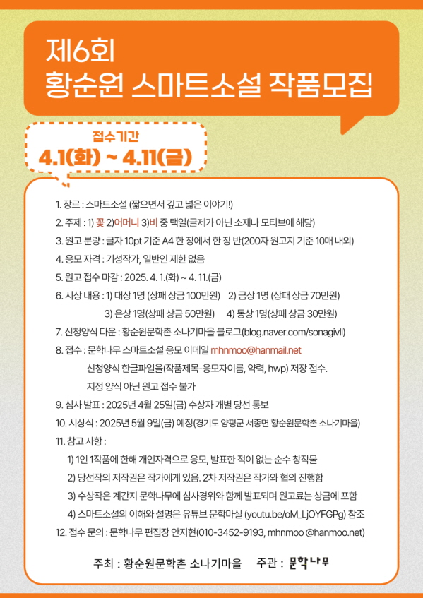 2025년 제6회 황순원 스마트소설 작품 모집 공모분야 문학/시나리오 접수기간2025.04.01 ~ 2025.04.11 D+308 종료 참가자격 제한없음 주최황순원기념사업회 1등상금(상품)100만원~199만원 홈페이지 바로가기 첨부파일 다운로드 유의사항 ※본 내용은 참고 자료로 내용의 오류와 변동에 대해 책임지지 않습니다. (오류 및 변동 신고는 상단의 '제안/오류' 신고를 통해 해주십시오.) ※주최사 사정에 따라 일정 및 내용이 변경될 수 있으니 주최사 홈페이지 등을 통해 관련 안내를 수시로 확인하시기 바랍니다. 상세내용 ■ 제목2025년 제6회 황순원 스마트소설 작품 모집 ■ 기간 - 접수 기간 : 2025년 4월 1일(화) ~ 4월 11일(금)까지 - 결과 발표 : 2025년 4월 25일(금) 예정 / 수상자 개별 통보 - 시상식 : 2025년 5월 9일(금) 15:00 예정 / 경기 양평군 서종면 황순원문학촌 소나기마을 ■ 참가자격기성작가, 일반인 제한 없음 ■ 참여방법 / 접수방법● 장르 : 스마트소설 (짧으면서 깊고 넓은 이야기!) ● 주제 : 1) 꽃 2)어머니 3비 중 택일 (글제가 아닌 소재나 모티브에 해당) ● 원고 분량 : 글자 10pt 기준 A4 한 장에서 한 장 반(200자 원고지 기준 10매 내외) ● 신청양식 다운로드 : 황순원문학촌 소나기마을 블로그(blog.naver.com/sonagivll) <접수 방법> - 문학나무 스마트소설 응모 이메일 mhnmoo@hanmail.net - 신청양식 한글파일을(작품제목-응모자이름, 약력, hwp) 저장 접수. - 지정 양식 아닌 원고 접수 불가 ■ 시상내용 / 혜택 - 대상 1명 (상패 상금 100만원) - 금상 1명 (상패 상금 70만원) - 은상 1명 (상패 상금 50만원) - 동상 1명 (상패 상금 30만원) ■ 유의사항 - 1인 1작품에 한해 개인자격으로 응모, 발표한 적이 없는 순수 창작물 - 당선작의 저작권은 작가에게 있음. 2차 저작권은 작가와 협의 진행함 - 수상작은 계간지 문학나무에 심사경위와 함께 발표되며 원고료는 상금에 포함 - 스마트소설에 관한 이해와 설명은 유튜브 ‘문학마실’ (youtu.be/oM_Lj0YFGPg) 참조 ■ 문의문학나무 편집장 안지현 (010-3452-9193, mhnmoo@hanmoo.net) 목록