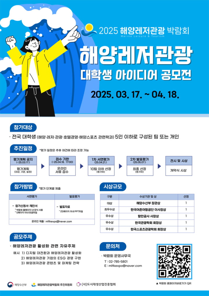 2025 해양레저관광 대학생 아이디어 공모전 공모분야 기획/아이디어/마케팅 접수기간2025.03.17 ~ 2025.04.18 D+300 종료 참가자격 대학(원)생/청년 주최해양레저관광 박람회 추진위원회 1등상금(상품)기타 홈페이지 바로가기 첨부파일 다운로드 유의사항 ※본 내용은 참고 자료로 내용의 오류와 변동에 대해 책임지지 않습니다. (오류 및 변동 신고는 상단의 '제안/오류' 신고를 통해 해주십시오.) ※주최사 사정에 따라 일정 및 내용이 변경될 수 있으니 주최사 홈페이지 등을 통해 관련 안내를 수시로 확인하시기 바랍니다. 상세내용 ■ 제목2025 해양레저관광 대학생 아이디어 공모전 ■ 기간 - 접수 기간 : ~ 2025년 4월 18일(금) 17:00까지 - 1차 발표 : 4월 21일(월) - 2차 발표 평가 : 5월 7일 (수) - 전시 및 시상 : 5월 8일(목) / 박람회 개막식 ■ 참가자격전국 대학생(해양·레저·관광·호텔경영·해양스포츠 관련학과) 5인 이하루 구성된 팀 또는 개인 ■ 참여방법 / 접수방법<공모 주제> 해양레저관광 활성화 관련 자유주제 - 예시 1) 디지털 대전환과 해양레저관광 활성화 2) 해양레저관광 기업의 ESG 경영 구현 3) 해양레저관광 콘텐츠 및 마케팅 전략 <참가 방법>※ 평가 단계별 제출1. 서면 평가 - 참가신청서, 제안서 작성 (박람회 홈페이지 내 양식 사용 / 5페이지 이내 한글 파일) 2. 발표 평가 (서면 평가를 통과한 10팀 이내) - 25페이지 이내 PPT 파일 -> 온라인 제출 : mltkexpo@naver.com ■ 시상내용 / 혜택 - 대상 1명 : 해양수산부 장관상 - 최우수상 1명 : 한국어촌어항공단 이사장상 - 우수상 1명 : 항만공사 사장상 - 우수상 1명 : 한국관광학회 회장상 - 우수상 1명 : 한국스포츠관광학회 회장상 ■ 문의박람회 운영 사무국 T. 02-785-5801 E. mltkexpo@naver.com 목록