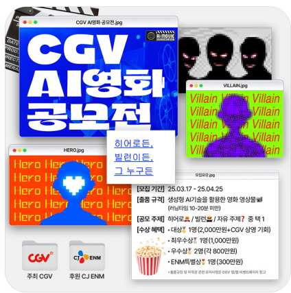 CGV AI영화 공모전 공모분야 사진/영상 접수기간2025.03.17 ~ 2025.04.25 D+293 종료 참가자격 제한없음 주최CGV 1등상금(상품)1천만원 초과 홈페이지 바로가기 첨부파일 다운로드 유의사항 ※본 내용은 참고 자료로 내용의 오류와 변동에 대해 책임지지 않습니다. (오류 및 변동 신고는 상단의 '제안/오류' 신고를 통해 해주십시오.) ※주최사 사정에 따라 일정 및 내용이 변경될 수 있으니 주최사 홈페이지 등을 통해 관련 안내를 수시로 확인하시기 바랍니다. 상세내용 ■ 제목CGV AI영화 공모전 ■ 기간 - 접수 기간 : 2025년 3월 17일 ~ 2025년 4월 25일까지 - 본선 진출작 발표 : 2025년 5월 7일 (15작품 선정) ■ 참가자격누구나 참여 가능 (영화를 사랑하고, AI기술에 관심이 많은 사람) ■ 참여방법 / 접수방법<출품 부문 / 주제> - 생성형 AI 기술을 활용한 10분~20분 영화 영상물 (장르, 제작년도 제한 없음) - 주제 : 히어로 / 빌런 / 자유주제 중 택 1하여 응모 <접수 방법> - 공식 홈페이지 공지 글 ‘접수하기’를 눌러서 접수홈페이지 주소 : http://www.cgv.co.kr/culture-event/event/detailViewUnited.aspx?seq=43953&menu=001 접수 구글폼 바로가기https://docs.google.com/forms/d/e/1FAIpQLSddT_PvGRUoHXI8ErmqLE1J9nLWupwzFBnm27jB7UnKVjqkww/viewform ■ 시상내용 / 혜택 - 대상 1명 : 2천만원 + CGV 상영 기회 - 최우수상 1명 : 1천만원 - 우수상 2명 : 각 800만원 - ENM특별상 1명 : 300만원 ■ 유의사항출품 규정 등 자세한 내용은 홈페이지 공지 글을 참조 바랍니다. ■ 문의cjcgvevent@cj.net 목록