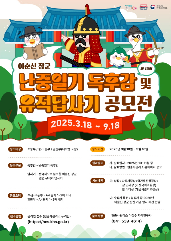 제13회 이순신 장군 난중일기 독후감 및 유적 답사기 공모전 공모분야 문학/시나리오, 논문/수기/사례 접수기간2025.03.18 ~ 2025.09.18 D+147 종료 참가자격 제한없음 주최국가유산청 1등상금(상품)기타 홈페이지 바로가기 첨부파일 다운로드 유의사항 ※본 내용은 참고 자료로 내용의 오류와 변동에 대해 책임지지 않습니다. (오류 및 변동 신고는 상단의 '제안/오류' 신고를 통해 해주십시오.) ※주최사 사정에 따라 일정 및 내용이 변경될 수 있으니 주최사 홈페이지 등을 통해 관련 안내를 수시로 확인하시기 바랍니다. 상세내용 ■ 제목제13회 이순신 장군 난중일기 독후감 및 유적 답사기 공모전 ■ 개요 유네스코 세계기록유산이자 국보인 『난중일기』를 전 국민이 읽고, 이순신 장군의 나라사랑 정신을 되새기고 관련 유적지 답사를 통한 문화관광 활성화 계기를 마련하고자 다음과 같이 난중일기 독후감 및 유적답사기 공모전을 개최하오니 많은 참여 바랍니다. ■ 기간 - 응모기간: 2025년 3월 18일 09시 ~ 9월 18일 24시 정각까지 - 수상자 발표: 2025년 10~11월 중 현충사관리소 누리집(http://hcs.khs.go.kr) ■ 참가자격초등학생, 중‧고등학생(같은 연령 포함), 일반인(대학생 포함) ■ 참여방법 / 접수방법<응모부문> - 독후감: 『난중일기』(한문본 및 각 번역서 포함) - 유적 답사기: 전국적으로 분포한 이순신 장군 관련 유적지 답사 <접수방법> 온라인 접수 현충사관리소 누리집(http://hcs.khs.go.kr) - 제목: 난중일기 독후감 / 유적답사기 공모 - 참가신청서: 누리집 접수 화면에 직접 입력 (분야, 구분, 이름, 생년월일, 이메일, 본인 연락처, 부모님 연락처, 집주소, 도서정보, 답사정보, 학교정보 등) *전화번호 등 연락처 누락 또는 연락 불가시 최종 심사에서 제외할 수 있음 - 파일명: 독후감(홍길동), 유적답사기(홍길동).hwp/hwpx/doc/docx *pdf 및 기타 형식 파일 접수불가 * 접수 시작 당일 09시부터 접수 마감 당일 자정 24:00까지 접수분에 한정합니다. * 접수 마감일에 접속량이 많아 접수가 원활하지 않을 수 있으니, 마감 전 미리 접수하는 것이 좋습니다. <응모요령> ㅇ 초등부문: A4 용지 1~2매 이내 ㅇ 중ㆍ고등부문: A4용지 1~2매 이내 ㅇ 일반부문: A4용지 1~3매 내외 ※ 누리집 창에서 참가신청서를 작성하고 응모글 파일을 첨부하여 제출 ※ A4용지: 한글프로그램 또는 MS워드, 맑은고딕, 글자크기 13포인트(제목 24포인트), 줄간격 160% [여백 / 위 10.0, 아래 10.0, 왼쪽 20.0, 오른쪽 20.0, 머리말 15.0, 꼬리말 15.0] ■ 시상내용 / 혜택 상 훈 격응모분야나라사랑상(6명)(국가유산청장상)참 인재상(12명)(아산국회의원상)참 리더상(12명)(해군사관학교장상)응모대상초 등 부독후감1명2명2명답사기1명2명2명중고등부독후감1명2명2명답사기1명2명2명일 반 부독후감1명2명2명답사기1명2명2명 ※ 수상자 특전 : 입상자 중 2026년 제481회 충무공이순신장군 탄신기념행사 제관 선발 ■ 유의사항ㅇ 응모는 1인 1점에 한함 ㅇ 심사결과 심사기준에 미달하는 경우 부문별로 시상자가 없을 수 있음 ㅇ 응모할 때 응모자의 인적사항이 누락되지 않도록 주의 ㅇ 공정한 심사를 위해 제출물에 이름 외 아무것도 기입하지 말 것 ㅇ 입상작의 판권 및 저작권은 문화재청에 귀속됨 ㅇ 이미 발표된 작품이나 모방성 등 표절이 인정되는 작품은 심사에서 제외되며, 시상 후에도 입상이 취소 또는 환수됨 ㅇ ’24년도 수상자는 ’25년도 공모전 동일대상(연령)&동일분야 응모 제한 ■ 문의현충사관리소 관리과 이정수(041-539-4614) 목록