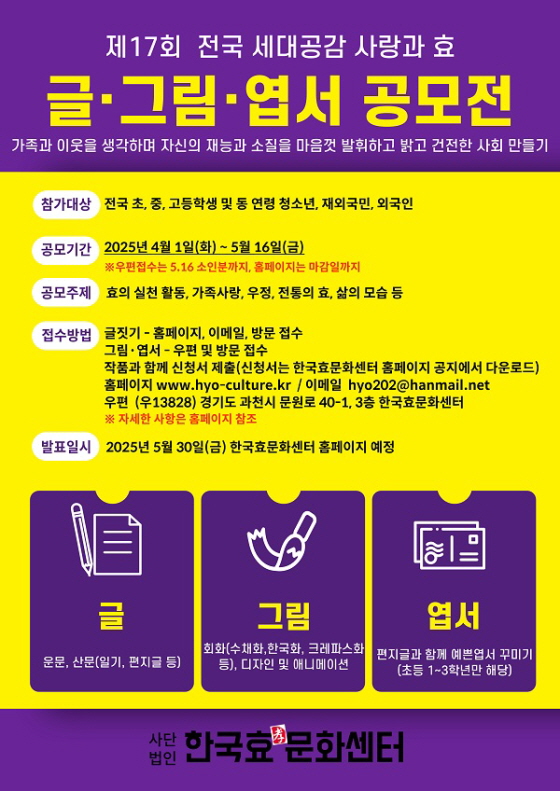 제17회 전국 세대공감 [사랑과 효] 글, 그림, 엽서 공모전 공모분야 문학/시나리오, 웹툰/포스터/미술, 기타분야 접수기간2025.04.01 ~ 2025.05.16 D+272 종료 참가자격 청소년 주최사단법인 한국효문화센터 1등상금(상품)기타 홈페이지 바로가기 첨부파일 다운로드 유의사항 ※본 내용은 참고 자료로 내용의 오류와 변동에 대해 책임지지 않습니다. (오류 및 변동 신고는 상단의 '제안/오류' 신고를 통해 해주십시오.) ※주최사 사정에 따라 일정 및 내용이 변경될 수 있으니 주최사 홈페이지 등을 통해 관련 안내를 수시로 확인하시기 바랍니다. 상세내용 ■ 제목제17회 전국 세대공감 [사랑과 효] 글, 그림, 엽서 공모전 ■ 기간 - 접수 기간 : 2025년 4월 1일(화) ~ 5월 16일(금) ※ 우편접수는 5. 16(금) 소인분까지, 홈페이지는 마감일까지 ■ 참가자격전국 초, 중, 고등학생 및 동연령 청소년, 재외국민, 외국인 ■ 참여방법 / 접수방법<공모 부문>글, 그림, 엽서※ 공모 분야별 중복 참여 가능하며, 동일인의 1개 이상 작품이 우수작품으로 선정된 경우, 가장 우수한 1개 작품만을 채택함. <공모 주제> 효의 실천 활동, 가족사랑, 우정, 전통의 효, 삶의 모습 등 <제출 형식>● 그림(회화) : 크레파스화, 수채화, 유화, 한국화 - 초등학생 5, 8절지 / 중학생 4, 5절지 / 고등학생 4절지● 그림(디자인 및 애니메이션) : 발상과 표현, 상황표현, 칸만화(4칸~8칸) - 초등학생 5, 8절지 / 중학생 4, 5절지 / 고등학생 4절지● 글짓기 : 초등부 - 운문(시), 산문(생활문-일기, 편지글) / 중·고등부 - 운문(시), 산문(수필-일기, 편지글) *소설 제외 - 2,000자 이내 (13pt 기준 A4 2장 또는 200자 원고지 10매)● 엽서 : 초등(1~3학년)부 – 편지글 - 우체국 규격엽서 필히 사용 <공모 방법> 작품과 함께 신청서 제출(신청서는 한국효문화센터 홈페이지 공지에서 다운로드 가능) - 홈페이지 : www.hyo-culture.kr - e-mail : hyo202@hanmail.net - 우편 : (우13828) 경기도 과천시 문원로 40-1, 3층 한국효문화센터 (1) 글짓기 : 홈페이지, 이메일, 방문 접수(신청서 필수) ※ 이메일 접수 시 메일 제목과 파일명 [공모전 제출_이름] 작성 (2) 그림 : 우편 및 방문 접수(신청서는 작품 뒷면에 부착하여 제출)(3) 엽서 : 우편 및 방문 접수(신청서는 작품과 함께 동봉하여 제출)※ 엽서 뒷면 양식 중 보내는 곳 : 참가자 기재 / 받는 곳 : 추후 엽서 받을 분 주소 이름 ■ 시상내용 / 혜택 교육부장관, 문화체육부장관, 경기도지사, 성균관장, 전국 시도교육감, 한국문인협회장, 한국미술협회장, 과천시장, 과천시의회의장, 안양과천교육장, 한국효문화센터 이사장 상장 및 부상, 지도자상 ■ 유의사항※ A4 작성법, 원고지 작성법 등 자세한 응모방법은 공식 홈페이지 공지글 참조 - 수상한 이력이 없는 작품으로 저작권에 위배되는 작품은 수상을 취소함. - 저작권은 주최측에 있으며 전시, 홍보 및 영상물 제작과 배포할 수 있음. - 응모된 작품은 반환하지 않음. - 글짓기 부분의 소설은 심사에서 제외됨. ■ 문의 - 전화 : 02-503-2022 - FAX : 02-504-2494 - 이메일 : hyo202@hanmail.net / www.hyo-culture.kr 목록
