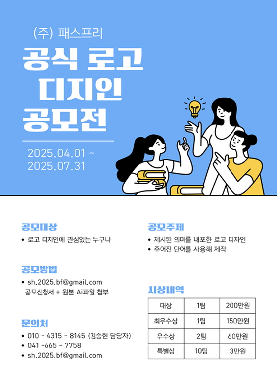 패스프리 공식 로고 디자인 공모전 공모분야 디자인/캐릭터 접수기간2025.04.01 ~ 2025.07.31 D+196 종료 참가자격 제한없음 주최(주)패스프리 1등상금(상품)200만원~499만원 홈페이지 바로가기 첨부파일 다운로드 유의사항 ※본 내용은 참고 자료로 내용의 오류와 변동에 대해 책임지지 않습니다. (오류 및 변동 신고는 상단의 '제안/오류' 신고를 통해 해주십시오.) ※주최사 사정에 따라 일정 및 내용이 변경될 수 있으니 주최사 홈페이지 등을 통해 관련 안내를 수시로 확인하시기 바랍니다. 상세내용 ■ 제목패스프리 공식 로고 디자인 공모전 ■ 기간- 접수 기간 : 2025년 4월 1일 ~ 2025년 7월 31일 ■ 참가자격로고 디자인에 관심있는 누구나 ■ 참여방법 / 접수방법<공모 주제> - 제시된 의미를 내포한 로고 디자인 제작 - 주어진 단어를 사용해 제작 ※ 필수 포함사항 : 영어 알파벳 PF 사용, 사용하는 컬러에 대한 의미 설명, 로고는 책임감, 신뢰성, 혁신, 미래를 나타내는 의미로 제작요망 <공모 방법> 공모신청서(첨부파일 다운로드), 원본 AI파일 첨부하여 이메일 접수 - 이메일 접수처 : sh.2025.bf@gmail.com ■ 시상내용 / 혜택 - 대상 1팀 : 상금 200만원 - 최우수상 1팀 : 상금 150만원 - 우수상 2팀 : 상금 60만원 - 특별상 10팀 : 상금 3만원 ■ 문의김승현 담당자 - 전화 : 010-4315-8145 / 041-665-7758 - 이메일 : sh.2025.bf@gmail.com 목록