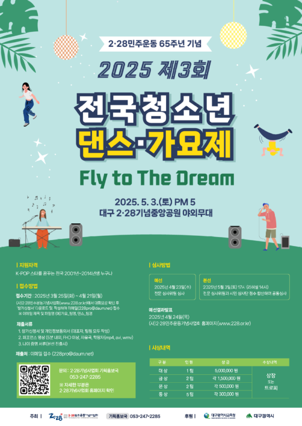 2·28민주운동 65주년 기념 제3회 전국 청소년 댄스·가요제 공모분야 대회/전시/제작, 기타분야 접수기간2025.03.25 ~ 2025.04.21 D+297 종료 참가자격 대학(원)생/청년, 청소년 주최(사)2·28민주운동기념사업회 후원/협찬대구광역시교육청, 대구광역시 1등상금(상품)500만원~1천만원 홈페이지 바로가기 첨부파일 다운로드 유의사항 ※본 내용은 참고 자료로 내용의 오류와 변동에 대해 책임지지 않습니다. (오류 및 변동 신고는 상단의 '제안/오류' 신고를 통해 해주십시오.) ※주최사 사정에 따라 일정 및 내용이 변경될 수 있으니 주최사 홈페이지 등을 통해 관련 안내를 수시로 확인하시기 바랍니다. 상세내용 ■ 제목 2·28민주운동 65주년 기념 제3회 전국 청소년 댄스·가요제 ■ 기간 - 접수기간 : 2025년 3월 25일(화) ~ 4월 21일(월) - 영상심사 : 2025년 4월 23일(수)※ 온라인 접수 팀 中 블라인드 심사를 통해 본선 진출 10팀 선정※ 미성년자(팀원 모두 2006. 1. 1. 이후 출생) 4팀(가요2팀, 댄스2팀) 본선 할당 예선결과발표 : 2025년 4월 24일(목) (사)2·28민주운동기념사업회 홈페이지(www.228.or.kr) - 본선대회 일시 : 2025년 5월 3일(토) 17시 (현장 리허설 14시 부터)◇ 장소 : 대구 2·28기념중앙공원 야외무대 ■ 참가자격- K-POP 스타를 꿈꾸는 전국 2001년~2014년생 누구나 - 댄스 및 가요부문 팀과 개인 단위 참가 가능(부문별 중복 참가 불가) ■ 참여방법 / 접수방법<접수방법>- 2·28민주운동기념사업회(www.228.or.kr)에서 참가신청서 및 개인정보 동의서 다운로드 및 작성하여 이메일(228pro@daum.net) 접수※ 이메일 제목 및 파일명 (예)가요_팀명, 댄스_팀명 - 제출처 : 이메일 접수 (228pro@daum.net) <제출서류>1. 참가신청서 및 개인정보동의서 (대표자, 팀원 모두 자필 작성)2. 퍼포먼스 영상○ 5분 내외, FHD 이상, 자유곡, 확장자(mp4, avi, wmv)○ 300MB 내외 파일 용량으로 제한, 영상 촬영시 참가인원 전체 모습이 보여야함○ 영상 시작시 '제3회 2·28민주운동 청소년 댄스·가요제' 지원 영상임을 알려야함(예시) "2·28민주운동 청소년 댄스·가요제 지원자(팀) OOO입니다." 후 퍼포먼스 시작3. [본선 진출시] 지원자격 확인용 연령 인증 서류(주민등록증, 등본, 학생증 등) ■ 시상내용 / 혜택 - 대상 1팀(가요·댄스 통합) : 상금 5,000,000원 - 금상 2팀(가요·댄스 각1팀) : 상금 각 1,500,000원 - 은상 2팀(가요·댄스 각1팀) : 상금 각 500,000원 - 동상 5팀(가요·댄스 통합) : 상금 각 300,000원 * 일괄 기타소득세 제한 금액 지급 ■ 유의사항- 경연에 필요한 소품 및 악기는 참가자 직접 준비- 예선과 결선 참가자는 동일해야 하며(곡명과 안무는 변경 가능), 참가팀 팀원의 변경이 있을 경우 주최 측에 사전승인 신청해야 하며 승인 없이 변경 시 심사에 불이익이 있을 수 있음- 접수된 모든 서류 및 영상은 반환하지 않음- 접수 마감 전 접수 사항 필히 확인 해야함. (마감 이후의 문제는 주최 측에서 책임지지 않음)- 예선접수 마감 후 제출된 영상물은 수정이 불가함- 비난, 비하 등 타인의 명예를 훼손하거나 공공에게 불쾌감을 줄 수 있는 언행 금지- 본선 진출팀 중 참가 포기를 할 경우 반드시 일주일 전에 주최 측에 알려야 함- 본선 참가팀은 본선 당일 리허설에 반드시 참가해야 하며 본선 리허설에 참석하지 못한 팀은 본선 포기로 간주함- 영상 제출시 '제3회 2·28민주운동 청소년 댄스·가요제' 지원 영상임을 알린 후 퍼포먼스 진행- 2·28민주운동 65주년 기념 제3회 전국 청소년 댄스·가요제와 관련하여 제작된 영상물의 저작권은 (사)2·28민주운동기념사업회가 가집니다. ■ 문의(사)2·28민주운동기념사업회 기획홍보국 053)247-2285※ 운영시간 : 화~금 09:00~18:00, 토 09:00~17:00 (일, 월 휴무) 목록