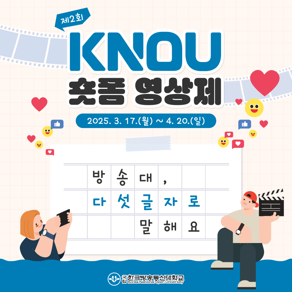 제2회 KNOU 숏폼 영상제 공모분야 사진/영상 접수기간2025.03.17 ~ 2025.04.20 D+297 종료 참가자격 제한없음 주최한국방송통신대학교 1등상금(상품)100만원~199만원 홈페이지 바로가기 첨부파일 다운로드 유의사항 ※본 내용은 참고 자료로 내용의 오류와 변동에 대해 책임지지 않습니다. (오류 및 변동 신고는 상단의 '제안/오류' 신고를 통해 해주십시오.) ※주최사 사정에 따라 일정 및 내용이 변경될 수 있으니 주최사 홈페이지 등을 통해 관련 안내를 수시로 확인하시기 바랍니다. 상세내용 ■ 제목제2회 KNOU 숏폼 영상제 ■ 개요제2회 KNOU 숏폼 영상제에서 짧은 영상으로 여러분이 생각하는 방송대를 다섯글자로 소개해 주세요! ■ 기간 - 접수 기간 : 2025. 3. 17. (월) ~ 4. 20. (일) ■ 참가자격전국민 누구나 ■ 참여방법 / 접수방법<공모 주제>방송대 다섯글자로 말해요ex. 장학금많아 ▶ 방송대의 다양한 장학금에 대한 영상평생교육해 ▶ 방송대의 평생교육에 대한 영상 <영상규격>- 길이 : 30초 내외 (제목, 크레딧 제외)- 형태 : 가로형 또는 세로형 영상- 해상도 : 1920*1080(px) / 1080*1920(px)- 프레임 : 29.97fps 또는 24fps- 포맷 : mp4, mov, mpg, avi, wmv 등 표준코덱- 용량 : 1GB 미만 <출품방법>이메일 제출 ▶josystyle@luffynjerry.com※ 이메일 제목 양식 : KNOU 숏폼 영상제 출품_(이름)_(전화번호) ■ 시상내용 / 혜택 - 최우수상 (1편) : 150만원 - 우수상 (1편) : 100만원- 장려상 (3편) : 50만원- 입선 (5편) : 20만원 ■ 유의사항○ 팀원 및 출품작 수에 제한을 두지 않습니다. (중복출품 가능)○ 최종 수상작은 방송대 공식 SNS를 통해 발표됩니다.○ 출품작 및 수상작은 추후 방송대의 홍보 콘텐츠로 활용될 수 있습니다.○ 방송대 이미지에 부정적인 영향을 줄 수 있는 작품은 심사에서 제외됩니다.○ 수상작 발표 및 출품 일정은 방송대 사정으로 인해 변경될 수 있습니다.○ 영상 제작 시 저작권 및 초상권 문제가 없는(혹은 저작권자의 사용 승인을 받은) 소스를 사용하시길 권장드립니다.추후 관련 문제가 발생할 경우 책임은 출품자 본인에게 있습니다. ■ 문의숏폼영상제 운영사무국 ☎ 02-3152-6770 목록