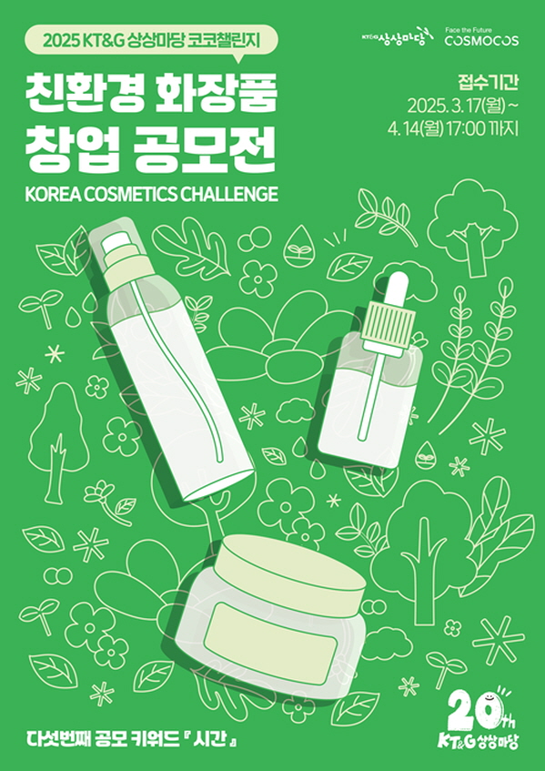 2025 KT&G 상상마당 코코챌린지 (친환경 화장품 창업 공모전) 공모분야 기획/아이디어/마케팅, 창업/사업 지원 접수기간2025.03.17 ~ 2025.04.14 D+303 종료 참가자격 제한없음 주최조회 184회 주최 1등상금(상품)기타 홈페이지 바로가기 첨부파일 다운로드 유의사항 ※본 내용은 참고 자료로 내용의 오류와 변동에 대해 책임지지 않습니다. (오류 및 변동 신고는 상단의 '제안/오류' 신고를 통해 해주십시오.) ※주최사 사정에 따라 일정 및 내용이 변경될 수 있으니 주최사 홈페이지 등을 통해 관련 안내를 수시로 확인하시기 바랍니다. 상세내용 ■ 제목2025 KT&G 상상마당 코코챌린지 (친환경 화장품 창업 공모전) ■ 개요KT&G 상상마당과 코스모코스가 함께하는 친환경 화장품 창업 공모전 ■ 기간 - 접수 기간 : 2025.03.17 ~ 2025.04.14. 오후 5시까지 ■ 참가자격 - 비기너 트랙 : 친환경 화장품 아이디어를 가진 누구나 - 챌린저 트랙 : 창업 5년 이내의 기창업자 ■ 참여방법 / 접수방법<공모 키워드> - 시간 : 자신만의 친환경화장품을 기획하고, ‘시간’이라는 단어로 브랜딩하라. <카테고리>스킨케어, 헤어케어, 바디케어, 메이크업 <신청 방법>신청서 작성 후 이메일 접수 : ssmdbs_apply@interparktriple.com※ 자세한 내용은 홈페이지 공고문 참조 ■ 시상내용 / 혜택2천만원 상당 ODM 개발 및 제품 제작 지원 (총 3팀 선발) ■ 문의070-8893-0922 목록