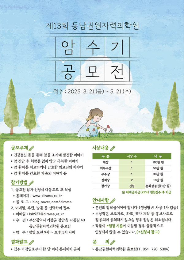 제13회 동남권원자력의학원 암수기 공모전 공모분야 논문/수기/사례 접수기간2025.03.21 ~ 2025.05.21 D+265 종료 참가자격 제한없음, 기타 제한 주최동남권 원자력의학원 1등상금(상품)100만원~199만원 홈페이지 바로가기 첨부파일 다운로드 유의사항 ※본 내용은 참고 자료로 내용의 오류와 변동에 대해 책임지지 않습니다. (오류 및 변동 신고는 상단의 '제안/오류' 신고를 통해 해주십시오.) ※주최사 사정에 따라 일정 및 내용이 변경될 수 있으니 주최사 홈페이지 등을 통해 관련 안내를 수시로 확인하시기 바랍니다. 상세내용 ■ 제목제13회 동남권원자력의학원 암수기 공모전 ■ 기간 - 접수 기간 : 2025. 3. 21(금) ~ 5. 21.(수) ■ 참여방법 / 접수방법<공모 주제> · 건강검진 등을 통해 암을 조기에 발견한 이야기 · 암 진단 후 희망을 잃지 않고 극복한 이야기 · 암 환자를 치료하거나 간호한 의료진의 이야기 · 암 환자를 간호한 가족의 이야기 등 <참가 방법> 1. 공모전 참가 신청서 다운로드 후 작성(게시글 상단 첨부파일 참고) 2. 이메일, 우편, 방문 중 선택하여 접수 · 이메일: lsh927@dirams.re.kr · 우편: 부산광역시 기장군 장안읍 좌동길 40 동남권원자력의학원 홍보팀 · 방문: 평일 오전 9시 ~ 오후 5시 사이 ■ 시상내용 / 혜택 1. 대상(1편): 100만 원 2. 최우수상(1편): 50만 원 3. 우수상(1편): 30만 원 4. 장려상(2편): 10만 원 5. 참가상(전원): 문화상품권 1만 원 권(※ 분량 충족 시 / 수상자 제외) ■ 유의사항 -본인의 창작물이어야 합니다.(생성형 AI 사용 1차 검증)- 수상작은 보도자료, SNS, 책자 제작 등 홍보자료로 활용되며 동의하지 않으실 경우 입상은 취소됩니다.- 작품이 *일정 기준에 미달할 경우 출품작으로 인정되지 않을 수 있습니다.(*신청서 참고) ■ 문의동남권원자력의학원 홍보팀(T. 051-720-5304) 목록