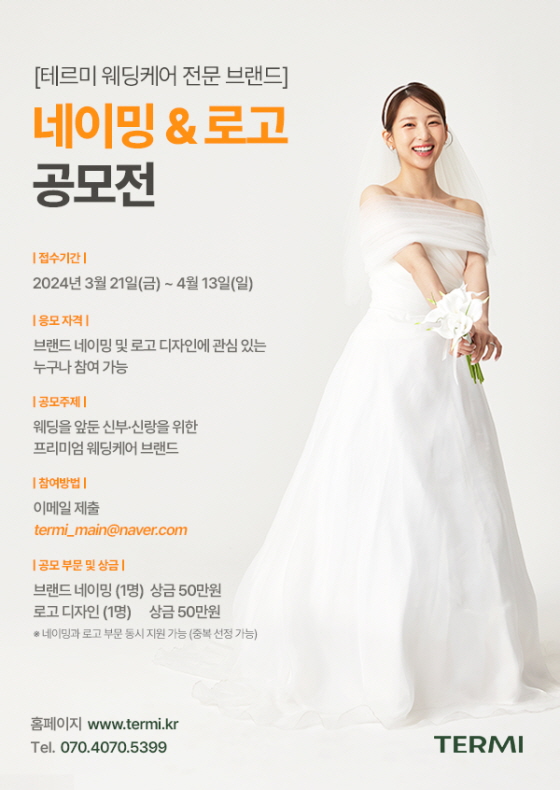 테르미 웨딩케어 전문 브랜드 네이밍 & 로고 공모전 공모분야 네이밍/슬로건, 디자인/캐릭터 접수기간2025.03.21 ~ 2025.04.13 D+303 종료 참가자격 제한없음 주최테르미 1등상금(상품)100만원~199만원 홈페이지 바로가기 첨부파일 다운로드 유의사항 ※본 내용은 참고 자료로 내용의 오류와 변동에 대해 책임지지 않습니다. (오류 및 변동 신고는 상단의 '제안/오류' 신고를 통해 해주십시오.) ※주최사 사정에 따라 일정 및 내용이 변경될 수 있으니 주최사 홈페이지 등을 통해 관련 안내를 수시로 확인하시기 바랍니다. 상세내용 ■ 제목테르미 웨딩케어 전문 브랜드 네이밍 & 로고 공모전 ■ 기간 - 접수 기간 : 2025년 3월 21일(금) ~ 4월 13일(일) ■ 참가자격 - 브랜드 네이밍 및 로고 디자인에 관심 있는 누구나 참여 가능 ■ 참여방법 / 접수방법<공모 주제> - 웨딩을 앞둔 신부·신랑을 위한 프리미엄 웨딩케어 브랜드 - 우아하고 세련된 감성을 담은 네이밍 & 로고 디자인 - 테르미의 웨딩케어 전문성과 브랜드 아이덴티티를 표현 <제출 형식> - 네이밍 부문 제출 형식 1.브랜드 네이밍 (국문 및 영문 가능) 2.네이밍 의미 및 기획 의도 (A4 1장 이내, PDF 또는 HWP) - 로고 디자인 부문 제출 형식 1. 로고 디자인 이미지 (PNG 및 AI 파일) 2. 로고 디자인 컨셉 설명 (A4 1장 이내, PDF 또는 HWP) <접수 방법>이메일 제출: termi_main@naver.com - 제출 파일명: [테르미 웨딩 공모] 네이밍_이름 / 로고_이름 - 파일 형식: PDF, HWP (네이밍 설명) / PNG, AI (로고 디자인 파일) ■ 시상내용 / 혜택- 브랜드 네이밍 부문 (1명) – 상금 50만원 - 로고 디자인 부문 (1명) – 상금 50만원 ※ 네이밍과 로고 부문 동시 지원 가능 (중복 수상 가능) ■ 문의- 홈페이지: termi.kr- 전화: 070-4070-5399 목록