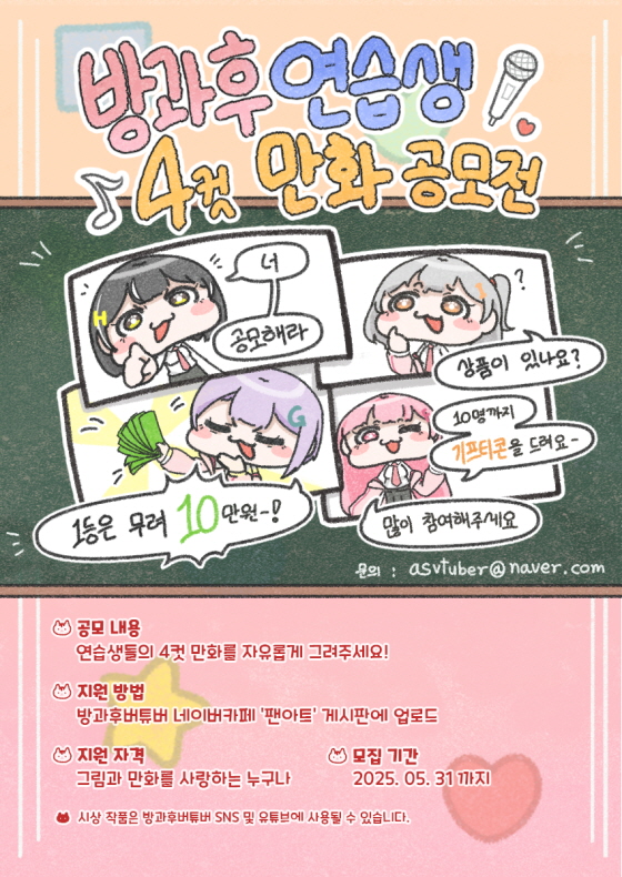 방과후 연습생 4컷 만화 공모전 공모분야 웹툰/포스터/미술 접수기간2025.03.21 ~ 2025.05.31 D+255 종료 참가자격 제한없음 주최방과후버튜버 1등상금(상품)100만원 이하 홈페이지 바로가기 첨부파일 다운로드 유의사항 ※본 내용은 참고 자료로 내용의 오류와 변동에 대해 책임지지 않습니다. (오류 및 변동 신고는 상단의 '제안/오류' 신고를 통해 해주십시오.) ※주최사 사정에 따라 일정 및 내용이 변경될 수 있으니 주최사 홈페이지 등을 통해 관련 안내를 수시로 확인하시기 바랍니다. 상세내용 ■ 제목방과후 연습생 4컷 만화 공모전 ■ 기간응모 마감: 2025년 5월 31일까지 ■ 참가자격방과후 연습생에게 관심이 많고, 그림과 만화를 사랑하는 누구나 참여 가능! ■ 참여방법 / 접수방법<공모 내용>연습생들의 4컷 만화를 자유롭게 그려주세요!(연습생 1명을 지정하여, 해당 캐릭터의 성격이 잘 드러나도록 표현해 주세요.) <응모 방법>방과후버튜버 네이버 카페 ‘팬아트’ 게시판에 작품 업로드https://cafe.naver.com/w3tdc?iframe_url=/ArticleList.nhn%3Fsearch.clubid=19708802%26search.menuid=74%26search.boardtype=I ■ 시상내용 / 혜택 - 1등 (1명): 상금 10만원 - 참여상 (10명): 원하는 치킨 기프티콘 ■ 유의사항- 당선작은 방과후 버튜버 SNS 및 유튜브에서 활용될 수 있습니다.- 원본 파일 제출 시, (배경/캐릭터/말풍선) 레이어가 분리된 파일로 제공해야 합니다. ■ 문의이메일: asvtuber@naver.com 목록