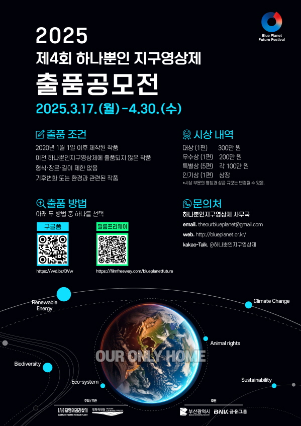 2025 제4회 하나뿐인 지구영상제 출품공모전 공모분야 사진/영상 접수기간2025.03.14 ~ 2025.04.30 D+286 종료 참가자격 제한없음 주최(사)자연의권리찾기, (재)영화의전당 주관(사)자연의권리찾기, (재)영화의전당 1등상금(상품)200만원~499만원 홈페이지 바로가기 첨부파일 다운로드 유의사항 ※본 내용은 참고 자료로 내용의 오류와 변동에 대해 책임지지 않습니다. (오류 및 변동 신고는 상단의 '제안/오류' 신고를 통해 해주십시오.) ※주최사 사정에 따라 일정 및 내용이 변경될 수 있으니 주최사 홈페이지 등을 통해 관련 안내를 수시로 확인하시기 바랍니다. 상세내용 ■ 제목2025 제4회 하나뿐인 지구영상제 출품공모전 ■ 기간 - 출품 기간 : 2025년 3월 14일(금) ~ 2025년 4월 30일(수) ■ 참가자격제한없이 누구나 ■ 참여방법 / 접수방법<출품조건>- 2020년 1월 1일 이후 제작 완료된 작품으로 이전 하나뿐인 지구영상제에 출품된 바 없는 작품- 형식, 장르 및 길이에 상관없이 기후변화를 소재 혹은 주제로 다루거나 폭넓은 의미에서 환경과 관련된 작품 <출품방법>- 출품 마감: 2025년 4월 30일 (수)- 출품은 탄소 발생을 최소화하기 위해 온라인으로만 가능하며, 아래 두 방법 중 하나를 선택하여 출품해야 한다.1) 구글 출품 링크 https://vvd.bz/DVw2) 필름프리웨이 출품 https://filmfreeway.com/blueplanetfuture ■ 시상내용 / 혜택 - 대상 1편 : 상금 3,000,000원- 우수상 1편 : 상금 2,000,000원- 특별상 5편 : 각 상금 1,000,000원 - 인기상 1편 : 상장 ■ 유의사항※자세한 내용은 출품규정을 확인 바랍니다. ■ 문의하나뿐인 지구영상제 Blue Planet Future Festival in Busan48058 부산광역시 해운대구 우동 센텀중앙로 55, 동서대학교 센텀 캠퍼스 15층 1520호Tel. +82 51-744-3335Email. theourblueplanet@gmail.comKakao-Talk. @하나뿐인지구영상제 목록