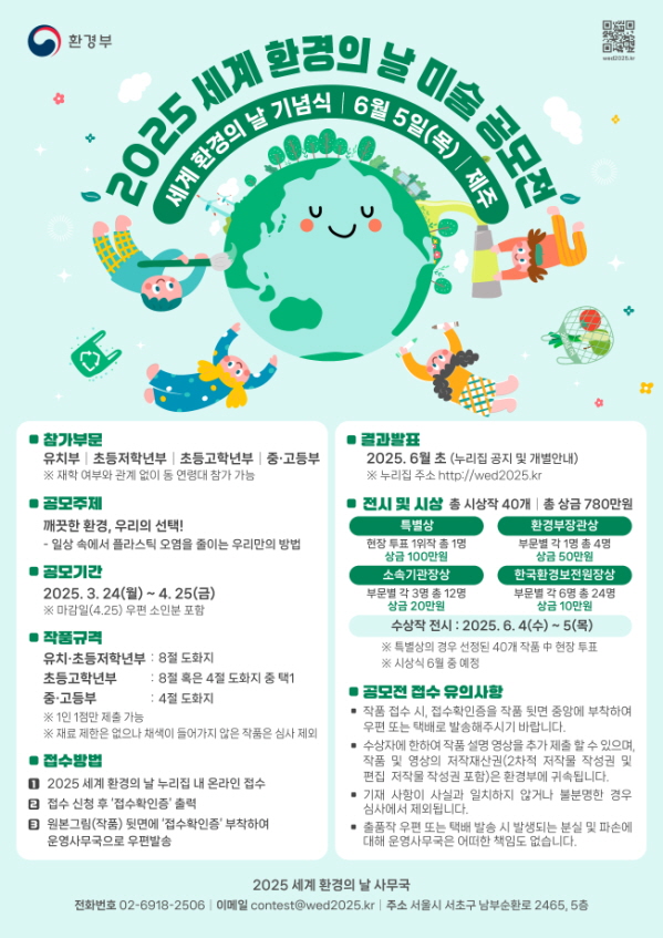 2025 세계 환경의 날 미술 공모전 공모분야 웹툰/포스터/미술 접수기간2025.03.24 ~ 2025.04.25 D+291 종료 참가자격 청소년 주최환경부 1등상금(상품)100만원~199만원 홈페이지 바로가기 첨부파일 다운로드 유의사항 ※본 내용은 참고 자료로 내용의 오류와 변동에 대해 책임지지 않습니다. (오류 및 변동 신고는 상단의 '제안/오류' 신고를 통해 해주십시오.) ※주최사 사정에 따라 일정 및 내용이 변경될 수 있으니 주최사 홈페이지 등을 통해 관련 안내를 수시로 확인하시기 바랍니다. 상세내용 ■ 제목2025 세계 환경의 날 미술 공모전 ■ 기간 - 접수 기간 : 2025. 3. 24.(월) ∼ 4. 25.(금) / 마감일(4.25.)우편 소인분 포함 - 결과발표 : 6월 초 예정 ■ 참가자격 유치부, 초등저학년부, 초등고학년부, 중고등부 또는 동 연령대 ※ 재학 여부와 관계없이 동 연령대 참가 가능 ■ 참여방법 / 접수방법<공모 주제> "꺠끗한 환경, 우리의 선택"! - 일상 속에서 플라스틱 오염을 줄이는 우리만의 방법 <접수 방법> ○온라인 접수: 참가신청서, 유의사항 및 개인정보 수집 및 이용동의서 작성 ○우편접수: 원본 그림 및 접수확인증을 작품 뒷면에 부착하여 우편 발송 1. 공모전 누리집(https://wed2025.kr)에서 참가 접수 신청 - 지원자 및 작품정보 기입, 개인정보 수집 및 이용 동의, 공모전 유의사항 확인 2. 접수 신청 후 '접수확인증' 출력 3. 원본그림(작품) 뒷면에 '접수확인증' 부착하여 운영사무국*으로 우편 발송 *2025 세계 환경의 날 미술 공모전 운영사무국 주소: 서울시 서초구 남부순환로 2465, 5층 ※작품뒷면 접수확인증 미부착 시 심사대상에서 제외(작품 제출 후 추후 별도 접수확인증 부착 불가) <접수 규격> - 6월 초 예정 유치부, 초등저학년부 - 8절 도화지, 중고등부- 4절 도화지 - 초등고학년부의 경우 8절 혹은 4절 도화지 中 택1 ■ 시상내용 / 혜택 - 특별상 현장 투표 1위작 1명 : 상금 100만원 - 환경부장관상 부문별 각 1명(총 4명) : 상금 50만원 - 소속기관상 부문별 각 3명(총 12명) : 상금 20만원 - 국립환경보전원장상 부문별 각 6명(총 24명) : 상금 10만원 ■ 유의사항 - 작품 접수는 마감일(2025.4.25.금) 기준 우편 소인분까지 인정됩니다. - 접수 완료 시, 접수확인증을 작품 뒷면 중앙에 부착하여 우편 또는 택배로 발송해주시기 바랍니다. - 수상자는 작품 설명 영상을 요청받을 수 있으며, 해당 영상의 저작재산권 (2차적 저작물 작성권 및 편집 저작물 작성권 포함)은 2025 세계 환경의 날 운영 사무국에 귀속됩니다. - 기재 사항이 사실과 일치하지 않거나 불분명한 경우 심사에서 제외됩니다. - 출품작 우편 또는 택배 발송 시 발생되는 분실 및 파손에 대해 운영사무국은 어떠한 책임도 없습니다. - 출품된 작품 및 제출서류는 반환되지 않으며, 입상 작품에 대한 저작재산권 이체(2차적 저작물작성권 및 편집 저작물 작성권 포함)는 환경부에 귀속됩니다. - 타 공모전 수상작품(동일작품이 아니더라도 작품의 일부 또는 유사작이 타 공모전에서 수상작으로 선정된 경우 포함), 컴퓨터 그래픽이나 이미지 합성사진, 표절 또는 모방 작품은 심사에서 제외되며, 수상 이후에도 당선을 취소하고 상금과 상장을 환수합니다. - 모든 제출 작품은 타인의 저작권을 침해 하여서는 안되며, 입상한 작품이 추후에라도 저작권에 위배되거나 표절로 인정될 경우 지원자의 책임으로 상금과 상장을 환수합니다. - 수상자는 작품설명 영상을 요청받을 수 있으며, 해당 영상의 저작재산권(2차적 저작물작성권 및 편집 저작물 작성권 포함)은 세계 환경의 날 운영사무국에 귀속됩니다. - 응모작은 제3자의 명예, 초상권, 저작권 등을 침해하지 않아야 하며, 이와 관련된 분쟁 발생 시 민·형사상의 모든 법적 책임은 참가자 본인에게 있습니다. - 적격작품이 없을 시 시상하지 않을 수 있으며, 시상 내용 및 일정은 내·외부 사정에 따라 변경될 수 있습니다. (변경사항은 사전 공식 누리집을 통해 공지) - 상금에 대한 제세공과금은 응모자 본인이 부담합니다. ■ 문의 공모전 운영사무국(02-6918-2506) ※ 운영시간: 월~금, 10:00~17:00Mail: contest@wed2025.kr 목록