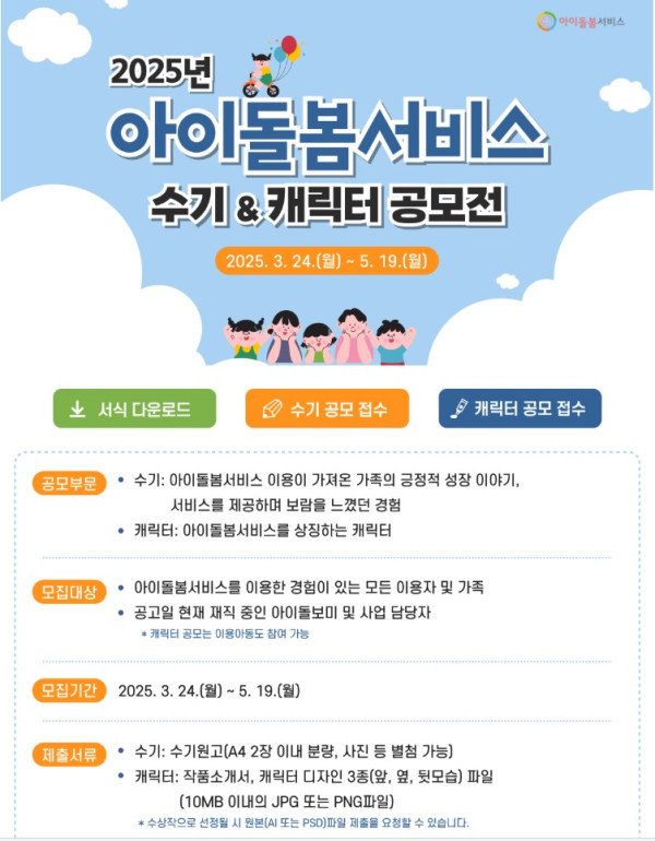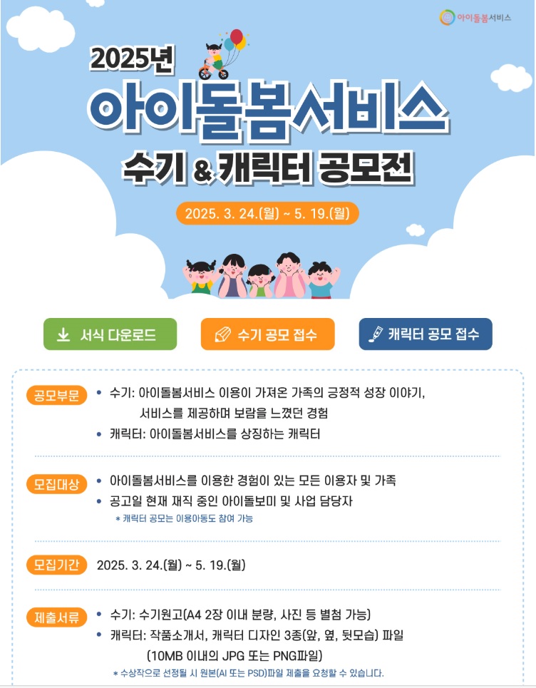 2025년 아이돌봄서비스 수기 & 캐릭터 공모전 공모분야 논문/수기/사례, 디자인/캐릭터 접수기간2025.03.24 ~ 2025.05.19 D+266 종료 참가자격 기타 제한 주최여성가족부 1등상금(상품)기타 홈페이지 바로가기 첨부파일 다운로드 유의사항 ※본 내용은 참고 자료로 내용의 오류와 변동에 대해 책임지지 않습니다. (오류 및 변동 신고는 상단의 '제안/오류' 신고를 통해 해주십시오.) ※주최사 사정에 따라 일정 및 내용이 변경될 수 있으니 주최사 홈페이지 등을 통해 관련 안내를 수시로 확인하시기 바랍니다. 상세내용 ■ 제목2025년 아이돌봄서비스 수기 & 캐릭터 공모전 ■ 기간 - 접수 기간 : 2025. 3. 24.(월) ~ 5. 19.(월) ■ 참가자격 - 아이돌봄서비스를 이용한 경험이 있는 모든 이용자 및 가족 - 공고일 현재 재직 중인 아이돌보미 및 사업 담당자※ 캐릭터 공모는 이용 아동도 참여 가능 ■ 참여방법 / 접수방법<공모 부문> - 수기 : 아이돌봄서비스 이용이 가져온 가족의 긍정적 성장 이야기, 서비스를 제공하며 보람을 느꼈던 경험 - 캐릭터 : 아이돌봄서비스를 상징하는 캐릭터 <제출 서류> - 수기 : 수기원고(A4 2장 이내 분량, 사진 등 별첨 가능) - 캐릭터 : 작품소개서, 캐릭터 디자인 3종(앞, 옆, 뒷모습) 파일[10MB 이내의 JPG 또는 PNG 파일]※ 수상작으로 선정될 시 원본(AI 또는 PSD 파일)제출을 요청할 수 있습니다. <접수 방법> 응모페이지 (gongmo.ecomidolbom.or.kr) 에서 서식 다운로드 및 응모 ■ 시상내용 / 혜택 - 대상 : 수기 3점, 캐릭터 1점 = 50만원 상당 상품권 - 우수상 : 수기 9점, 캐릭터 2점 = 30만원 상당 상품권 - 장려상 : 수기 12점, 캐릭터 5점 = 15만원 상당 상품권 ■ 유의사항 - 수상자들은 행사 당일 낭독회에 필수 참여 - 자세한 내용은 홈페이지 공고문 참조 ■ 문의 02-3479-7686, 7690 목록