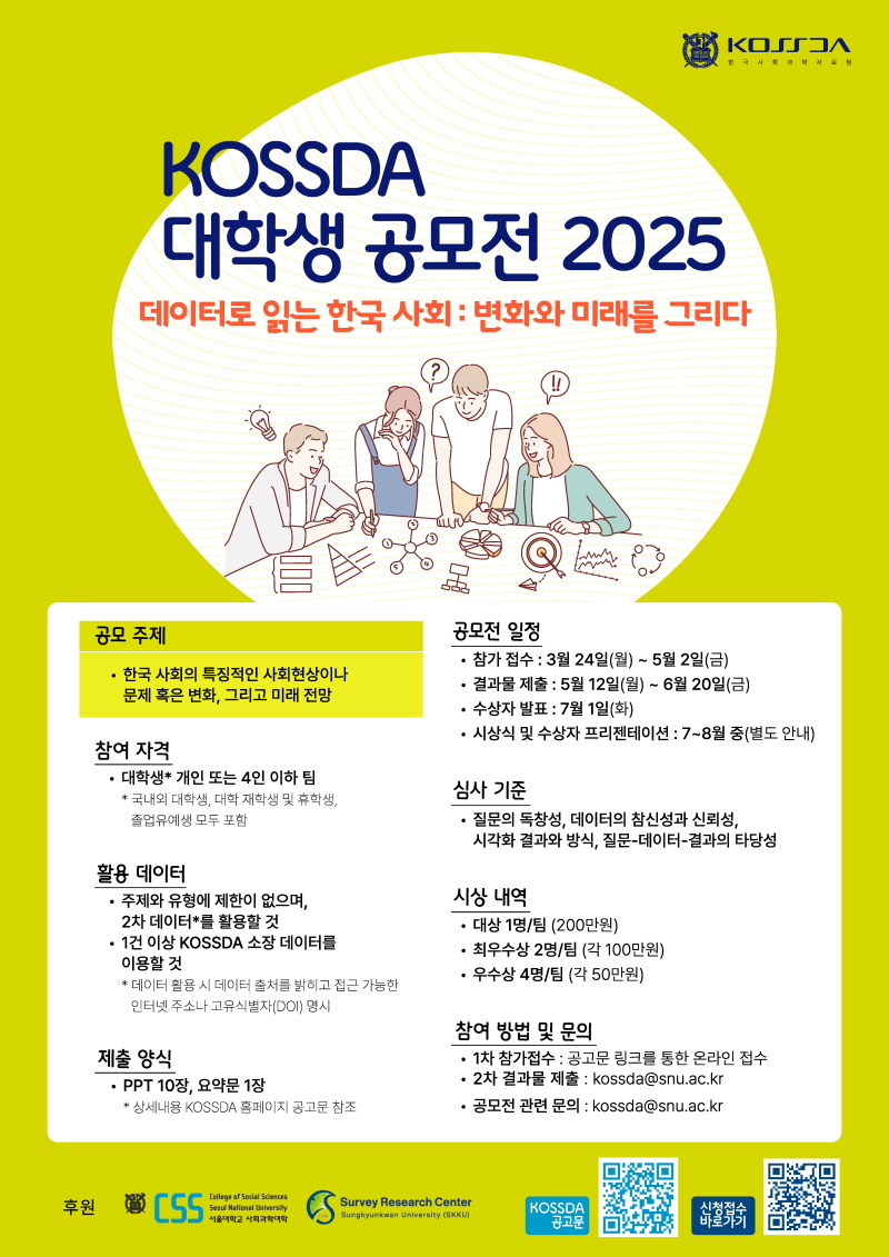 KOSSDA 대학생 공모전 2025 - 데이터로 읽는 한국 사회 : 변화와 미래를 그리다 공모분야 기획/아이디어/마케팅 접수기간2025.03.24 ~ 2025.05.02 D+283 종료 참가자격 대학(원)생/청년 주최서울대학교 한국사회과학자료원 1등상금(상품)200만원~499만원 홈페이지 바로가기 첨부파일 다운로드 유의사항 ※본 내용은 참고 자료로 내용의 오류와 변동에 대해 책임지지 않습니다. (오류 및 변동 신고는 상단의 '제안/오류' 신고를 통해 해주십시오.) ※주최사 사정에 따라 일정 및 내용이 변경될 수 있으니 주최사 홈페이지 등을 통해 관련 안내를 수시로 확인하시기 바랍니다. 상세내용 ■ 제목KOSSDA 대학생 공모전 2025 - 데이터로 읽는 한국 사회 : 변화와 미래를 그리다 ■ 개요한국 사회는 빠른 변화와 복합적인 사회문제를 겪고 있습니다. 저출산·고령화, 양극화, 노동시장 구조 변화, 환경 문제, 디지털 전환 등 다양한 사회적 이슈가 우리의 삶을 형성하고 있습니다. 데이터를 활용하여 한국 사회의 특징적인 현상, 문제, 혹은 변화를 어떻게 분석할 수 있을까요? 그리고 이러한 분석 결과를 시각적으로 효과적으로 전달하는 방법은 무엇일까요? KOSSDA에서는 사회과학 분야의 데이터 활용을 활성화시키고, 창의적인 문제 해결 능력을 기르는 데 기여하기 위해 <데이터로 읽는 한국 사회: 변화와 미래를 그리다> 공모전을 개최합니다. 대학생이라면 누구나 참여 가능하며, 다양한 데이터를 활용하여 한국 사회를 분석하고 시각화한 결과를 제출해 주시면 됩니다. 여러분의 참신한 아이디어와 열정으로 한국 사회의 미래를 함께 그려나가길 기대합니다. ■ 기간- 참가접수 : 2025년 3월 24일(월) ~ 5월 2일(금) - 결과물 제출 : 2025년 5월 12일(월) ~ 6월 20일(금)- 심사 : 2025년 6월 23일(월) ~ 6월 27일(금)- 수상자 발표 : 2025년 7월 1일(화)- 시상식 및 수상자 프리젠테이션 : 2025년 7월, 8월 중 (별도 안내)* 시상식에 이어 각 수상자(팀)가 자신의 수상작을 발표 ■ 참가자격 대학생* 개인 또는 4인 이하 팀 (*국내외 대학생, 대학 재학생 및 휴학생, 졸업유예생 모두 포함) ■ 참여방법 / 접수방법<공모 주제>- 한국 사회의 특징적인 사회현상이나 문제 혹은 변화, 그리고 미래 전망 <제출 양식>- 공모전 요건을 충족하는 PPT 자료 파일과 요약문(요약문 양식 다운 받아 작성)* 분량 : 10장 (표지와 참고문헌 제외)* 형식 : 글자 크기, 디자인, 글꼴 자유* 연구 제출물(요약문, PPT)에 참가자 이름, 소속 등 개인을 식별할 수 있는 정보 기입 불가 <필수 구성요소>- 제목 : 한국 사회를 특징적으로 포착하는 의문형 제목- 문제 제기 : 한국 사회의 특징적인 사회현상이나 문제 혹은 변화, 그리고 미래 전망- 데이터 선택과 분석 : 데이터 출처와 데이터 선정 과정 그리고 데이터분석- 데이터 시각화 : 데이터분석 결과와 그것의 효과적인 시각화- 토의 : ‘질문’과 데이터 시각화가 보여주는 ‘대답’에 대한 전반적인 평가 <활용 데이터>- 주제와 유형에 제한이 없으며, 2차 데이터*를 활용할 것- 1건 이상 KOSSDA 소장 데이터를 이용할 것* 2차 데이터는 이미 다른 목적을 위해 수집되었거나 존재하는 데이터를 의미함* 데이터 활용 시 데이터 출처를 밝히고 접근가능하도록 인터넷 주소나 데이터 인용 정보 (Digital Object Identifier, DOI)를 명시할 것* KOSSDA 데이터 사용 시 KOSSDA 자료인용서식에 따라 작성: KOSSDA 홈페이지 자료별 메타데이터의 ‘자료인용서식‘ 항목 참고 예) 김지범. 한국종합사회조사, 2003-2023 [누적자료] [데이터 세트]. 성균관대학교 서베이리서치센터 [연구수행기관]. 한국사회과학자료원 (KOSSDA) [자료제공기관], 2024-07-16, https://doi.org/10.22687/KOSSDA-A1-CUM-0062-V1. * 추천사이트 :1) 서울대학교 한국사회과학자료원(KOSSDA) https://kossda.snu.ac.k- 국내 사회과학분야 연구데이터 아카이브 2) 통계청 마이크로데이터 통합서비스(MDIS) https://mdis.kostat.go.kr/index.do- 통계청과 관련 정부기관/연구기관이 작성한 마이크로데이터를 한곳에 모아 통합적으로 제공하는 사이트 <심사 기준>- 질문의 독창성, 데이터의 참신성과 신뢰성, 시각화 결과와 방식, 질문-데이터-결과의 타당성 <제출 양식> 공모전 요건을 충족하는 PPT 자료 파일과 요약문 <접수 방법>- 1차 참가 접수 : 접수 링크 바로가기(클릭)- 2차 결과물 제출 : KOSSDA 이메일(kossda@snu.ac.kr)로 접수* 1) PPT자료(ppt문서 1부, pdf문서 1부)2) 요약문(양식에 작성하며 pdf문서 1부)3) 개인정보 수집 및 활용 동의서4) 공모전 참여 유의사항 확인서 ■ 시상내용 / 혜택- 대상 1명/팀(200만원), 최우수상 2명/팀(각 100만원), 우수상 4명/팀(각 50만원) ■ 문의 kossda@snu.ac.kr 목록