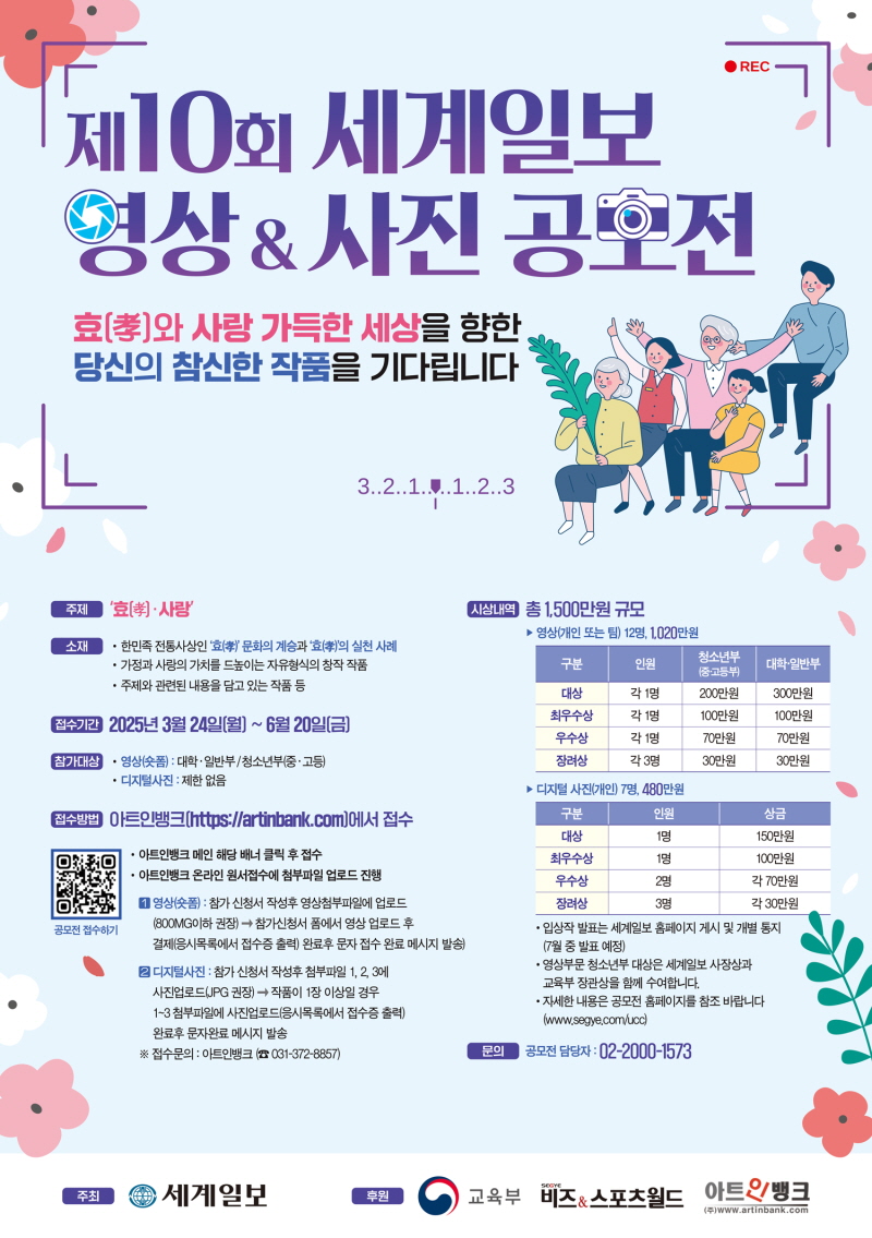 제10회 세계일보 영상 & 사진 공모전 공모분야 사진/영상 접수기간2025.03.24 ~ 2025.06.20 D+234 종료 참가자격 제한없음 주최세계일보 후원/협찬교육부, 세계비즈앤스포츠월드, ㈜아트인뱅크 1등상금(상품)200만원~499만원 홈페이지 바로가기 첨부파일 다운로드 유의사항 ※본 내용은 참고 자료로 내용의 오류와 변동에 대해 책임지지 않습니다. (오류 및 변동 신고는 상단의 '제안/오류' 신고를 통해 해주십시오.) ※주최사 사정에 따라 일정 및 내용이 변경될 수 있으니 주최사 홈페이지 등을 통해 관련 안내를 수시로 확인하시기 바랍니다. 상세내용 ■ 제목제10회 세계일보 영상 & 사진 공모전 ■ 개요전통적 효(孝)사상과 인류애의 바탕인 사랑을 표현하는 「효(孝)와 사랑」을 주제로『제10회 세계일보 영상&사진 공모전』을 개최하오니 많은 참여 바랍니다. ■ 기간 - 접수기간 : 2025년 3월 24일(월) ~ 6월 20일(금) ■ 참가자격 (1) 영상(숏폼) : 대학‧일반부 / 청소년부(중‧고등) (2) 디지털사진 : 제한 없음 ■ 참여방법 / 접수방법● 공모부문 : 영상(숏폼), 디지털사진 <주제 및 소재> 가. 주 제 : ‘효(孝)·사랑’ 나. 소 재 - 한민족 전통사상인 ‘효(孝)’ 문화의 계승과 ‘효(孝)’의 실천 사례 - 가정과 사랑의 가치를 드높이는 자유형식의 창작 작품 - 주제와 관련된 내용을 담고 있는 작품 등 <부문별 규격 및 제출사항>※ 응모수량 : 부문별 1인 3작품 이내가. 영상(숏폼)▷1분 이내(장르와 촬영기법 제한 없음) - 규격 : 1920*1080 픽셀, 확장명 : AVI, MP4, MPEG - 원서접수시 접수처 업로드 : 참가신청서, 원본 파일 나. 디지털사진▷10Mb 이내 (1인 최대 3매 제출 가능), 흑백 및 컬러 무관 - 규격(3,000×2,000 픽셀 이상, 500만 화소 이상 - 휴대폰 사진촬영 가능(A4 용지 출력 가능해야 함) - 원서접수시 접수처 업로드 : 참가신청서, 원본 파일 <접수방법> 가. 아트인뱅크(https://artinbank.com)에서 접수 (1) 아트인뱅크 메인 해당 배너 클릭 후 접수 (2) 아트인뱅크 온라인 원서접수에 첨부파일 업로드 진행 1. 영상(숏폼) : 참가 신청서 작성후 영상첨부파일에 업로드(800MG이하 권장) → 참가신청서 폼에서 영상 업로드 후 결제 (응시목록에서 접수증 출력) 완료후 문자 접수 완료 메시지 발송 2. 디지털사진 : 참가 신청서 작성후 첨부파일 1, 2, 3에 사진업로드(JPG 권장) → 작품이 1장 이상일 경우 1~3 첨부파일에 사진업로드 (응시목록에서 접수증 출력) 완료후 문자완료 메시지 발송 ■ 시상내용 / 혜택<영상(개인 또는 팀)> - 대상 : 대학일반부 1명 300만원 / 청소년부 1명 200만원 - 최우수상 : 대학일반부 1명 100만원 / 청소년부 1명 100만원 - 우수상 : 대학일반부 1명 70만원 / 청소년부 1명 70만원 - 장려상 : 대학일반부 3명 각 30만원 / 청소년부 3명 각 30만원 <디지털 사진(개인)> - 대상 1명 : 150만원 - 최우수상 1명 : 100만원 - 우수상 2명 : 각 70만원 - 장려상 3명 : 각 30만원 ■ 유의사항▷제출 작품은 반환하지 않으며 국내외 타 공모전 등에 출품되지 않은 순수 창작품이어야 함 ▷초상권 및 저작권에 위배 되지 않는 작품이어야 함 ▷수상 이후라도 표절 판명 시 수상 취소 ▷공모요강에 준하지 않는 작품은 심사 대상에서 제외될 수 있음 ▷영상 제작 과정에서 일어나는 지적재산권, 초상권 침해와 명예훼손 등에 따른 분쟁 발생 시 모든 책임은 응모자에 있음 ▷응모된 작품에 대한 저작권은 응모자에게 있으며, 세계일보는 당선작에 한하여 2년 동안 다양한 온·오프라인 미디어를 통해 세계일보 홍보물로 활용할 수 있음 ▷심사 결과 및 작품 완성도에 따라 수상 인원은 달라질 수 있음 ▷입상하지 않은 응모작은 공모전 종료일로부터 3개월 이내 모두 폐기하며 응모자가 반환을 요구 시 3개월 이내에 반환하며, 반환을 위한 비용은 반환을 요구한 응모자가 부담함 ▷본 공모전은 문화체육관광부 창작물 공모전 가이드라인에 준하여 적용함 ■ 문의아트인뱅크 (☎ 031-372-8857) 목록