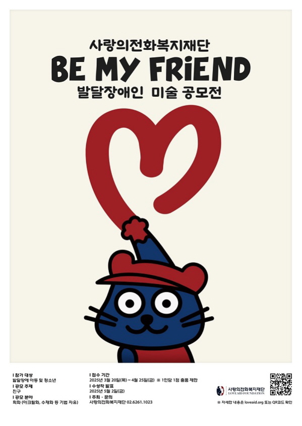 2025 사랑의전화복지재단 발달장애인 미술 공모전 공모분야 웹툰/포스터/미술 접수기간2025.03.20 ~ 2025.04.25 D+290 종료 참가자격 기타 제한 주최사랑의전화복지재단 1등상금(상품)100만원 이하 홈페이지 바로가기 첨부파일 다운로드 유의사항 ※본 내용은 참고 자료로 내용의 오류와 변동에 대해 책임지지 않습니다. (오류 및 변동 신고는 상단의 '제안/오류' 신고를 통해 해주십시오.) ※주최사 사정에 따라 일정 및 내용이 변경될 수 있으니 주최사 홈페이지 등을 통해 관련 안내를 수시로 확인하시기 바랍니다. 상세내용 ■ 제목2025 사랑의전화복지재단 발달장애인 미술 공모전 ■ 개요사랑의전화복지재단에서는 발달장애 아동이 제한 없이 자신의 생각과 감정을 그림으로 표현할 수 있는 기회를 제공하기 위해 ‘Be My Friend’ 미술공모전을 개최합니다.수상작은 온라인 및 VR 전시로, 아동의 창의적 표현을 국내외로 공유함으로써 자아존중감을 높이고, 해외 K-아트 교류를 통해 비장애 아동 및 일반인들과 함께하는 사회적 소통 채널 역할을 할 이번 공모전에 많은 관심 부탁드립니다. ■ 기간 - 접수 기간: 2025년 3월 20일(목) ~ 4월 25일(금)※ 서류 신청서는 우선 접수 부탁드립니다. - 수상작 발표: 2025년 5월 2일(금) 예정 / 사랑의전화복지재단 홈페이지id.org) 공지사항 및 수상자 개별 통보 ※ 수상작품은 5월 12일까지 사랑의전화복지재단 본사로 우편 또는 직접 제출※ 주소 : (04209) 서울 마포구 만리재로 51, 사랑의전화복지재단 - 시상식 일정: 2025년 5월 14일(수) 예정 ■ 참가자격발달장애 아동 및 청소년※ 국내 특수학교 재학 또는 특수교육을 받는 발달장애 아동 및 청소년※ 해당 증빙서류(장애인 복지카드 사본 앞/뒤) ■ 참여방법 / 접수방법● 공모 주제: 친구 (Friend) ● 공모 분야: 회화(아크릴화, 수채화 등 기법 자유) ※ 1인 1점 출품 제한 <작품 규격> - 크기: 4절지(39.4*54.5cm) / 캔버스 25호(유형 자유) 이상 - 재료: 자유 (제한없음) - 형식: 평면 작품 <접수 방법>가. 홈페이지 신청서양식 다운로드 후 이메일(loveaiddoc@gmail.com) 또는 구글폼 제출- 구글폼 : https://docs.google.com/forms/d/e/1FAIpQLSdg7UxUyKuHT7S25TljVihjBYMM7oJAFv6LOLpW7ybgwDUTQQ/viewform ※ 구글폼으로 접수 시 파일 한 개당 10MB 이하 업로드 가능 <제출 서류>① 참가신청서② 개인정보동의서(소정 양식) 1부 ※ 만 14세 미만 아동의 경우 법정 대리인의 동의 필수③ 유의사항 및 저작권 관련 확인 동의서 ④ 복지카드 사본 앞 / 뒤⑤ 작품소개서⑥ 작품 이미지 파일 ※ 수상작에 한해 실물 작품 제출 필수 <파일명 및 형식>- 신청서: 지원자이름 + 기관 또는 학교명 (예: 홍길동_정인학교) / 한글, 워드, pdf - 작품사진: 작품명 + 지원자 이름 + 학교 및 기관명 (예: 내친구_홍길동_정인학교) / jpg, png, pdf ■ 시상내용 / 혜택- 대상(1명): 상장 및 상금 70만원- 최우수상(2명): 상장 및 상금 50만원- 우수상(3명): 상장 및 상금 30만원- 장려상(5명): 상장 및 상금 20만원- 입선작(10명): 상장 및 상금 5만원 ※ 상장 및 상금은 시상식을 통하여 전달※ 소득세법에 따라 상금은 제세공과금 공제 후 지급 ■ 유의사항- 타 공모전 수상 및 전시 경력이 있는 작품 출품 시 접수 취소- 출품작은 본인의 작품이어야 하며, 저작권에 위배되지 않아야 함- 수상작 우편 배송 중 파손 시 주최자는 책임지지 않음- 모든 작품은 공모전 이후 사랑의전화복지재단의 공익 목적, 홍보 및 전시 등으로 사용될 수 있음- 수상작은 사랑의전화복지재단이 제작하는 굿즈 디자인으로 활용될 수 있음- 입상한 모든 작품은 실물로 본사 제출 필수(심사결과 발표 전까지 작품 관리에 유의, 작품 반환 불가)- 참가자 수 및 접수 작품이 심사 기준에 맞지 않을 경우, 수상 인원 변경 또는 선정 않을 수 있음 ■ 문의- 전화: 02. 6261. 1023 (사랑의전화복지재단 정서지원사업부 / 9:00~17:00)- 이메일: loveaiddoc@gmail.com 목록