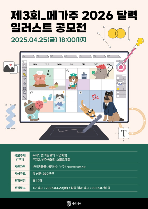 제3회 메가주 2026 달력 일러스트 공모전 공모분야 웹툰/포스터/미술, 디자인/캐릭터 접수기간2025.03.24 ~ 2025.04.25 D+290 종료 참가자격 제한없음 주최메쎄이상 1등상금(상품)100만원~199만원 홈페이지 바로가기 첨부파일 다운로드 유의사항 ※본 내용은 참고 자료로 내용의 오류와 변동에 대해 책임지지 않습니다. (오류 및 변동 신고는 상단의 '제안/오류' 신고를 통해 해주십시오.) ※주최사 사정에 따라 일정 및 내용이 변경될 수 있으니 주최사 홈페이지 등을 통해 관련 안내를 수시로 확인하시기 바랍니다. 상세내용 ■ 제목제3회 메가주 2026 달력 일러스트 공모전 ■ 개요 '상상 속의 반려동물'을 주제로 한 일러스트 공모전이 개최됩니다.다양한 상상력을 바탕으로 사랑하는 반려동물의 새로운 모습을 그려주세요.다양한 직업과 스포츠 경기에서 활약하는 반려동물의 모습을 재미있고 독특하게 표현한 작품을 기다립니다! 반려동물을 키우고 계시지 않더라도, 귀여운 상상 속의 반려동물을 표현하는 작품을 제출할 수 있습니다. 최종 선정된 작품으로 제작된 2026 달력은 '2025 메가주 일산(하)'에서 만나보실 수 있습니다. ■ 기간- 접수기간 : ~2025.04.25.(금) 18:00까지 - 1차 서류심사 결과발표 : 2025.04.29(화) 예정- 현장투표 : 2025.05.16(금)~18(일)- 온라인투표 : 2025.05.26(월)~06.30(월)- 최종 결과 발표 : 2025.07월 중- 상금 전달 : 2025.11월 중※ 상기 일정은 변경될 수 있으며, 모든 변경사항은 케이펫페어 홈페이지 내 공지사항 확인 ■ 참가자격 강아지, 고양이를 사랑하는 누구나 (반려인, 비반려인 모두 참여 가능)- 1인당 1개의 작품만 응모 가능- 달력 뒷면의 일러스트만 제출 (숫자판은 주최사에서 제작 예정)- 개인 응모만 가능 (팀별 응모 불가) ■ 참여방법 / 접수방법■ 공모분야 : 일러스트 ■ 응모주제 : 상상 속의 반려동물 (2개의 주제 중 택1)- 강아지, 고양이, 앵무새, 햄스터 등 다양한 반려동물 가능[주제1] 반려동물의 직업체험- 반려동물이 다양한 직업을 가진다면 어떤 모습일까요?제빵사, 경찰, 환경미화원 등 다양한 직업을 가진 모습을 상상해보세요.[주제2] 반려동물의 스포츠대회- 반려동물이 다양한 스포츠 경기의 선수로 활약한다면 어떤 경기를 할까요?축구, 피겨, 스케이팅, 마라톤 등 각종 스포츠에서 열심히 참여하는 반려동물의 모습을 상상해보세요. <출품내역>- 파일형식 : 원본파일 (PSD,Ai(일러스트) 등) 1부, jpg파일 1부.※ 손그림의 경우 고화질 스캔본을 제출하여야 함.- 작품규격 : (가로)150*(세로)210mm※ 상단의 15mm는 스프링 영역으로 배경만 작업 가능. <접수방법>- 아래 신청폼 작성 및 제출https://forms.gle/yCo9an9mAWrBfTg17 ■ 시상내용 / 혜택- 대상(1명) : 상금 100만원, 달력 배정 선택 1순위- 최우수상(1명) : 상금 50만원, 달력 배정 선택 2순위- 우수상(2명) : 상금 30만원, 달력 배정 선택 3-4순위- 장려상(8명) : 상금 10만원*공통 제공사항 : 2025년 11월 메가주 일산(하) 일러스트존 작가 부스 1개 제공 ■ 유의사항◦ 1인 1개의 작품만 제출 가능하며, 달력 숫자판은 주최사에서 제작 예정으로 뒷면의 일러스트 파일만 제출.※ 1인 다수의 작품 제출 시 가장 먼저 제출한 작품으로 심사 참여◦ 응모자는 응모한 작품이 초상권, 저작권 등 제3자의 저작권을 침해하지 않도록 해야 하며, 부정행위로 인해 발생한 모든 법적 책임은 응모자에게 있음.◦ 응모 형식과 규격에 맞지 않는 작품, 다른 공모전에서 입상한 작품 및 표절, 복제 등으로 타인의 지적재산권 등을 침해한 경우 심사에서 제외하며, 수상 후에라도 이 사실이 밝혀질 경우 수상을 취소하고 상장 및 상금 등은 일체 회수함.◦ 접수된 작품 중 1차 선정작부터 최종 수상작은 ㈜메쎄이상에서 주최하는 ‘케이펫페어&메가주’에서 작품 전시, 홍보 목적 등의 용도로 사용할 수 있음.◦ 작품은 일러스트, 포토샵, 손 그림 등 직접 그린 작품만 응모 가능하며, 미드저니, 어도비 파이어플라이 등 AI를 활용하여 제작된 그림은 응모 불가함. 생성형 AI를 통해 제작된 그림으로 확인되는 경우 선정에서 제외되며, 수상 후에라도 이 사실이 밝혀질 경우 수상을 취소하고 상장 및 상금 등은 일체 회수함.◦ 수상작은 2026 메가주 달력으로 제작되어 온오프라인 한정 판매 예정이며, 판매 수익금은 ㈜메쎄이상에 귀속됨.◦ 필수 제출내용 누락, 허위기재의 경우 심사에서 제외될 수 있으며, 제출 후 수정은 불가함.◦ 심사 내용은 공개하지 않고 심사 결과에 따라 수상작이 없거나 변경될 수 있음.◦ 수상자는 결과 발표 이후 주최사에서 원본파일을 요청한 기한 이내에 원본데이터를 제출해야 하므로 반드시 별도 보관 필요.◦ 제출한 원본 데이터가 응모작과 일치하지 않거나 기한 내에 제출하지 않은 경우 또는 기재된 연락처가 불분명하여 연락되지 않는 경우 수상에서 제외할 수 있음.◦ 대상 수상자는 선정 발표 이후 주최사에서 별도 안내하는 기한 내에 달력 표지 디자인 1부를 추가 제출하여야 함.◦ 수상자 공통 제공사항인 ‘2025 메가주 일산(하)’의 일러스트존 작가 부스 관련 내용은 수상자에 한해서만 안내됨.◦ 공모와 관련된 모든 변경사항, 공지사항 등은 개별 안내되지 않으며