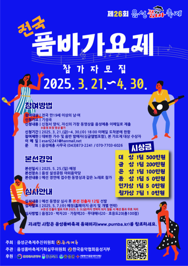 2025 제26회 음성품바축제 전국 품바 가요제 공모분야 대회/전시/제작 접수기간2025.03.21 ~ 2025.04.30 D+284 종료 참가자격 제한없음 주최음성군축제추진위원회, 음성예총 주관음성품바축제 기획실무위원회 후원/협찬문화체육관광부, 충청북도, 음성군, 음성꽃동네 1등상금(상품)200만원~499만원 홈페이지 바로가기 첨부파일 다운로드 유의사항 ※본 내용은 참고 자료로 내용의 오류와 변동에 대해 책임지지 않습니다. (오류 및 변동 신고는 상단의 '제안/오류' 신고를 통해 해주십시오.) ※주최사 사정에 따라 일정 및 내용이 변경될 수 있으니 주최사 홈페이지 등을 통해 관련 안내를 수시로 확인하시기 바랍니다. 상세내용 ■ 제목2025 제26회 음성품바축제 전국 품바 가요제 ■ 기간 - 신청기간 : 2025. 3. 21.(금) ~ 4. 30.(수) 18:00 이메일 도착분에 한함 ■ 참가자격전국 만19세 이상의 남·여- 참가 부(不) 자격 : 데뷔한 가수, 음반 발매자(싱글앨범포함) 및 본 가요제 대상 수상자※ 음정 보정 영상 불가 ■ 참여방법 / 접수방법<참가 규정>· 인 원 : 1인 혹은 2인 이상 팀· 신청 가요 : 기성곡 <신청방법> 참가신청서, 자신의 모습이 담긴 가창 동영상을 이메일(esart2241@hanmail.net)로 제출 <심사 방법 및 본선 경연>- 본선 참가팀 발표 : 2025. 5. 7.(수) 이후 예정(동영상 심사 후 12팀 내외 선발-홈페이지 https://pumba.kr 공지 및 개별 연락)※ 2025. 5. 9.(금)까지 본선팀의 연락처 오류, 미수신 등으로 연락이 되지 않는 경우 예선통과 무효처리 - 본선 경연· 일시 : 2025. 5. 25.(일) 예정· 장소 : 음성 설성공원 야외음악당(본선 당일 대회 30분 전까지 집결 예정)· 내용 : 예선 경연에 접수한 동영상 내용과 같은 노래로 참가· 준비물 : 각 팀별 MR CD 또는 USB 지참 ■ 시상내용 / 혜택 - 대상 1 : 300만원 - 금상 1 : 200만원 - 은상 1 : 100만원 - 동상 1 : 50만원 - 인기상 1 : 50만원 - 참가상 7 : 각 10만원 ■ 문의음성예총 ☎043)873-2241, 070-7703-6026 목록