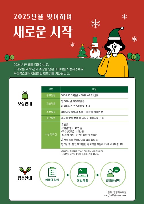 픽셀북스 에세이 공모전 공모분야 문학/시나리오 접수기간2024.12.23 ~ 2025.01.31 D+377 종료 참가자격 지역한정 주최픽셀북스 주관MUSE LABELS 1등상금(상품)100만원 이하 홈페이지 바로가기 첨부파일 다운로드 유의사항 ※본 내용은 참고 자료로 내용의 오류와 변동에 대해 책임지지 않습니다. (오류 및 변동 신고는 상단의 '제안/오류' 신고를 통해 해주십시오.) ※주최사 사정에 따라 일정 및 내용이 변경될 수 있으니 주최사 홈페이지 등을 통해 관련 안내를 수시로 확인하시기 바랍니다. 상세내용 픽셀북스 에세이 공모전 ■ 개요2024년 한 해를 되돌아보고, 다가오는 2025년의 소망을 담은 에세이를 작성해주세요. 픽셀북스에서 여러분의 이야기를 기다립니다. ■ 기간2024.12.23(월) ~ 2025.01.31.(금) - 작품심사 : ~ 2025. 2. 5- 수상작 발표 : 2025. 2. 7.(금) 개별 연락 ■ 참가자격서울시 거주 2,30대 청년 누구나 가능 ■ 참여방법 / 접수방법 "2024년 한 해를 되돌아보고, 다가오는 2025년의 소망을 담은 여러분의 이야기를 들려주세요." - 2024년 아쉬웠던 점, 2025년 새해 소망 (한 주제 당 500자 이내 작성) <접수방법>이메일 접수 : zero_1022@naver.com※ 이메일 제목 : 00_이름생년 (ex.00_홍길동00) ■ 시상내용 / 혜택- 대상(1명) 40만원- 우수상(2명) 25만원- 장려상(5명) 2만원 상당의 상품권- 픽셀북스 인스타그램 게시글 업로드 ■ 유의사항 ※ 우수작으로 선정된 작품은 마케팅 활용에 동의해주셔야 합니다. ※ 1년 후 본인이 제출한 공모작을 2025년 12월 31일에 다시 메일로 보내드립니다. 목록