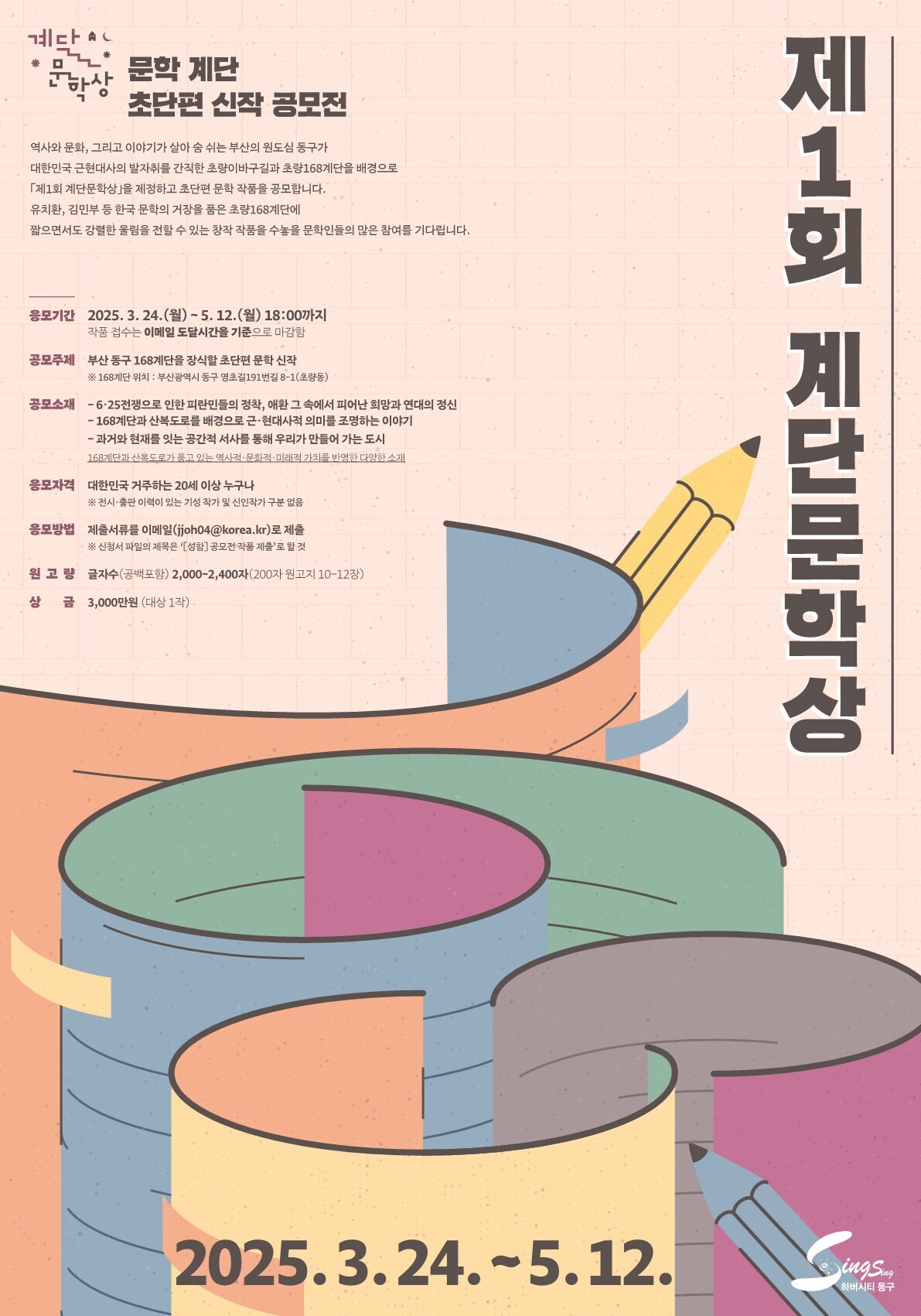 제1회 계단문학상 공모전 (상금 : 3천만원) 공모분야 문학/시나리오 접수기간2025.03.24 ~ 2025.05.12 D+272 종료 참가자격 제한없음 주최부산광역시 동구청 1등상금(상품)1천만원 초과 홈페이지 바로가기 첨부파일 다운로드 유의사항 ※본 내용은 참고 자료로 내용의 오류와 변동에 대해 책임지지 않습니다. (오류 및 변동 신고는 상단의 '제안/오류' 신고를 통해 해주십시오.) ※주최사 사정에 따라 일정 및 내용이 변경될 수 있으니 주최사 홈페이지 등을 통해 관련 안내를 수시로 확인하시기 바랍니다. 상세내용 ■ 제목제1회 계단문학상 공모전 ■ 기간 - 접수기간 : 2025. 3. 24.(월) ~ 2025. 5. 12.(월) - 결과발표 : 2025. 6월 중 (구 홈페이지 공고 및 수상자에 한하여 개별 통보) ■ 참가자격대한민국 거주하는 20세 이상 누구나 ■ 참여방법 / 접수방법○ 공모주제 : 부산 동구 168계단을 장식할 초단편 문학 신작 ○ 공모소재- 6·25전쟁으로 인한 피란민들의 정착, 애환 그 속에서 피어난 희망과 연대의 정신- 168계단과 산복도로를 배경으로 근·현대사적 의미를 조명하는 이야기- 과거와 현재를 잇는 공간적 서사를 통해 우리가 만들어 가는 도시▶ 168계단과 산복도로가 품고 있는 역사적·문화적·미래적 가치를 반영한 다양한 소재 ○ 제출서류 : 참가신청서 및 개인정보 수집·이용 동의서 등(붙임파일 서식 1~4 참고) ○ 제출방법 : 이메일 제출(붙임파일 공고문 참고) ■ 시상내용 / 혜택상 금 : 3,000만원(대상 1작) ■ 유의사항기타사항 : 붙임파일 공고문 참고 ■ 문의문화관광과 ☎051-440-4811 목록