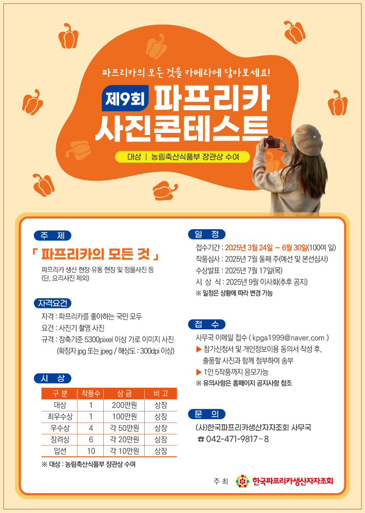 제9회 파프리카 사진콘테스트 공모 공모분야 사진/영상 접수기간2025.03.24 ~ 2025.06.30 D+223 종료 참가자격 제한없음 주최(사)한국파프리카생산자자조회 1등상금(상품)200만원~499만원 홈페이지 바로가기 첨부파일 다운로드 유의사항 ※본 내용은 참고 자료로 내용의 오류와 변동에 대해 책임지지 않습니다. (오류 및 변동 신고는 상단의 '제안/오류' 신고를 통해 해주십시오.) ※주최사 사정에 따라 일정 및 내용이 변경될 수 있으니 주최사 홈페이지 등을 통해 관련 안내를 수시로 확인하시기 바랍니다. 상세내용 ■ 제목제9회 파프리카 사진콘테스트 공모 ■ 기간○ 접수 기간 : 2025년 3월 24일 ∼ 6월 30일(100여 일) ○ 수상 발표 : 2025년 7월 17일(목)○ 시상식 : 2025년 9월 이사회(추후 공지) ■ 참가자격파프리카를 좋아하는 국민 모두 ■ 참여방법 / 접수방법<공모 주제 : 파프리카의 모든 것> 파프리카 생산 현장·유통 현장 및 정물사진 등(단, 요리사진 제외)- 요건 : 사진기 촬영 사진- 규격 : 장축기준 5300pixel 이상 가로 이미지 사진(확장자 : jpg 또는 jpeg / 해상도 : 300dpi 이상) <접수 방법> 사무국 이메일 접수(kpga1999@naver.com)- 참가신청서 및 개인정보이용 동의서 작성 후, 출품할 사진과 함께 첨부하여 송부- 1인 5작품까지 응모 가능 ■ 시상내용 / 혜택 - 대상 1 : 200만원 및 상장(농림축산식품부 장관상) - 최우수상 1 : 100만원 및 상장 - 우수상 4 : 각 50만원 및 상장 - 장려상 6 : 각 20만원 및 상장 - 입선 10 : 각 10만원 및 상장 ■ 유의사항○ 사진콘테스트 응모 시 참가신청서, 개인정보이용 동의서와 같이 접수되지 않은 응모작품은 심사에서 제외됨 ○ 응모 한도를 초과한 응모작품은 접수시간 기준 1인당 5점 이후 응모작품부터 심사에서 제외됨 ○ 출품자가 응모한 작품이 본 심사 중 시상작으로 2점 이상 선정 시, 차상위 시상작을 제외한 작품은 심사에서 제외됨(단, 입선은 예외) ○ 타 공모전에 기 입상된 작품이거나 표절, 편집 합성된 응모작품, 대리 작성된 응모작품, 출품대상 규격을 충족하지 아니한 작품은 심사에서 제외되며 시상 이후에도 수상 취소 및 상금이 환수됨 ○ 색 보정 등을 위한 간단한 포토샵은 허용하나 포토샵 사용 시 그 내용을 기재하여야 하며, 사실과 다를 경우 심사에서 불이익을 받을 수 있음 ○ 수상작품을 포함한 응모작품에 대한 사용 권한은 (사)한국파프리카생산자자조회에 귀속되며 이는 2차 저작물 작성권을 포함함 ○ 사진에 인물, 건축물, 개인·법인소유자 등이 포함되었을 경우 응모자는 초상권 등 저작권과 관련하여 발생할 수 있는 문제들을 해결한 후 응모하여야 하며, 향후 분쟁이 발생할 경우 민·형사상의 모든 법적 책임은 출품자(저작권)에게 있음 ○ 본 심사 대상으로 선정된 작품의 출품자는 주관사로부터 본 심사에 필요하여 원본파일 제출을 요구 받았을 때, 원본파일을 제출해야 하며, 제출하지 않을 시 본 심사 대상에서 제외 ○ 입상작품 중 기한 내에 원본파일과 관련 서류를 제출하지 않을 경우 수상이 취소됨 ○ 상금에 대한 제세공과금이 발생할 경우, 응모자 본인 부담임 ○ 시상규모 및 일정은 사정에 따라 변경 가능하며, 변경사항은 “한국파프리카생산자자조회” 홈페이지를 통해 공지됨 ■ 문의(사)한국파프리카생산자자조회 사무국 ☎ 042-471-9817~8 목록