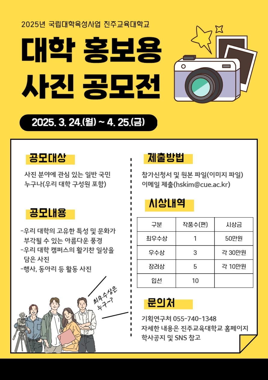 진주교육대 대학 홍보용 사진 공모전 공모분야 사진/영상 접수기간2025.03.24 ~ 2025.04.25 D+289 종료 참가자격 제한없음 주최진주교육대학교 1등상금(상품)100만원 이하 홈페이지 바로가기 첨부파일 다운로드 유의사항 ※본 내용은 참고 자료로 내용의 오류와 변동에 대해 책임지지 않습니다. (오류 및 변동 신고는 상단의 '제안/오류' 신고를 통해 해주십시오.) ※주최사 사정에 따라 일정 및 내용이 변경될 수 있으니 주최사 홈페이지 등을 통해 관련 안내를 수시로 확인하시기 바랍니다. 상세내용 ■ 제목진주교육대 대학 홍보용 사진 공모전 ■ 기간 - 공모기간: 2025. 3. 24.(월) ~ 2025. 4. 25.(금) 18:00까지 - 당선작 발표: 2025. 5. 26.(월) 예정 / 학교 홈페이지 공지 및 입상자 개별 연락 ■ 참가자격사진 분야에 관심 있는 일반인 누구나(우리 대학 구성원 포함) ■ 참여방법 / 접수방법<공모내용>- 우리 대학의 고유한 특성 및 문화가 부각될 수 있는 아름다운 풍경 ※ 계절 또는 날씨에 따라 변화하는 캠퍼스의 경관- 우리 대학 캠퍼스의 활기찬 일상을 담은 사진- 행사, 동아리 등 활동사진 <응모방법> 참가신청서 및 사진 원본파일 이메일(hskim@cue.ac.kr)로 제출 ※ 출품형식: 이미지파일, 파일 및 메일 제목:「대학 홍보용 사진 공모전 신청서_이름」 ■ 시상내용 / 혜택 - 최우수상 1 : 50만원- 우수상 3 : 각 30만원- 장려상 5 : 각 10만원 - 입선 10 ■ 유의사항- 1인 최대 3점까지 접수가능(입상작은 1인 1점으로 한정) - 응모작은 제목과 의미를 모두 기재하여야 하며 제목의 작성 취지 및 의미를 심사에 반영할 수 있음 - 당선작에 대한 저작권은 진주교육대학교에 귀속됨 - 접수 완료 후 응모 수가 적거나, 작품 수준이 미달하는 등의 사유가 발생할 경우 재공모 또는 내부 검토 후 변경하여 추진할 수 있음 - 사진에 인물 등이 포함되어 초상권을 비롯한 저작권 관련 문제 발생 소지가 없어야 하며 이와 관련한 분쟁은 응모자 본인에게 모든 책임이 있음 - 표절·편집·합성된 응모작품, 대리 작성된 응모작품은 심사에서 제외되며, 시상 후에라도 수상 취소 및 상금 반환해야 함 - 공모전의 내용과 일정은 진행 상황에 따라 변동될 수 있음 ■ 문의기획연구처 055-740-1348 목록