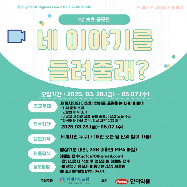 네 이야기를 들려줄래? 1분 숏츠 공모전 공모분야 사진/영상 접수기간2025.03.28 ~ 2025.05.07 D+277 종료 참가자격 제한없음 주최사단법인 세계시민포럼 주관사단법인 세계시민포럼 후원/협찬한미약품(주) 1등상금(상품)100만원 이하 홈페이지 바로가기 첨부파일 다운로드 유의사항 ※본 내용은 참고 자료로 내용의 오류와 변동에 대해 책임지지 않습니다. (오류 및 변동 신고는 상단의 '제안/오류' 신고를 통해 해주십시오.) ※주최사 사정에 따라 일정 및 내용이 변경될 수 있으니 주최사 홈페이지 등을 통해 관련 안내를 수시로 확인하시기 바랍니다. 상세내용 ■ 제목네 이야기를 들려줄래? 1분 숏츠 공모전 ■ 기간 - 접수기간 : 2025. 03.28.(금) ~ 05.07.(수) - 선정발표 : 2025.05.15.(목)- 시상안내 : 2025.05.20.(월) ~ 05.22.(목) / 상장(PDF파일) 전달. 응모자 개별 연락 ■ 참가자격세계시민 누구나(개인 또는 팀단위 참여 가능)※ 미성년자 참가자의 경우, ‘개인정보 제공 및 수집·이용 동의서’ 내에 법정 대리인 동의 필수 ■ 참여방법 / 접수방법<공모주제>세계시민의 다양한 언어로 표현하는 나의 이야기- 지역 문화 소개- 고향의 미식 소개- 다양성 사회와 상호 문화 존중이 담긴 모든 주제 <제출형식 : 영상 (1분 내외)>- 자막은 모든 언어로 가능- 단, 한국어가 아닌 경우 한글 자막 추가 삽입 필수: 파파고, 구글 번역 등 사용 권장, 번역 오류는 심사에 반영되지 않음 <응모방법>1. 신청하기 : 온라인 접수 (▶ 신청 바로가기 ‣ direct link: Online Application) : 3/28부터 신청서 작성 가능)- 출품 작품 설명, 개인정보 동의, 참가자 서약2. 영상제출 : 이메일 접수 (gcfca16@gmail.com)- 1분 내외의 짧은 영상- 2GB 이하 MP4 형식의 영상- 파일명 : 응모자이름(1분영상)제출일 / 예시: 김세계(1분영상)25.04.01.3. 온라인 신청과 영상 제출 확인 후 접수 확정 (응모자 연락처로 개별 안내) ■ 시상내용 / 혜택- 대상 1명 : 30만원- 최우수상 3명 : 10만원- 우수상 10명 : 5만원- 장려상 20명 : 3만원- 입선 00명 : 1만원 ※ 상금은 온라인상품권으로 증정됩니다.• 온라인상품권은 대한민국에서만 사용할 수 있습니다.• 해외응모자의 경우, 한국에 거주하는 대리수상자 지정이 가능합니다.※ 상기 내용은 상황에 따라 변경될 수도 있음 ■ 문의 사단법인 세계시민포럼- 전화 : 070-7755-9595- 이메일 : gcfca16@gmail.com 목록