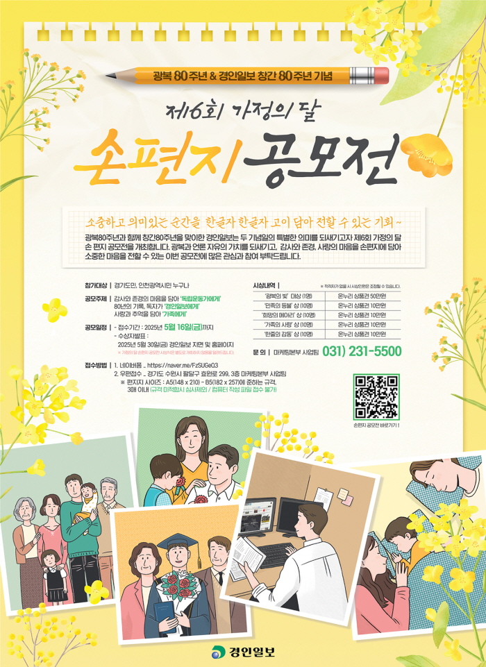 제6회 가정의 달 손편지 공모전 공모분야 문학/시나리오, 논문/수기/사례, 기타분야 접수기간2025.03.27 ~ 2025.05.16 D+268 종료 참가자격 지역한정 주최경인일보 주관경인일보 1등상금(상품)100만원 이하 홈페이지 바로가기 첨부파일 다운로드 유의사항 ※본 내용은 참고 자료로 내용의 오류와 변동에 대해 책임지지 않습니다. (오류 및 변동 신고는 상단의 '제안/오류' 신고를 통해 해주십시오.) ※주최사 사정에 따라 일정 및 내용이 변경될 수 있으니 주최사 홈페이지 등을 통해 관련 안내를 수시로 확인하시기 바랍니다. 상세내용 ■ 제목제6회 가정의 달 손편지 공모전 ■ 개요 광복 80주년과 함께 창간 80주년을 맞이한 경인일보가 ‘제6회 가정의 달 손편지 공모전’을 개최합니다. 이번 공모전은 광복과 언론 자유의 가치를 되새기고 감사와 존경, 사랑의 마음을 손편지에 담아 표현하는 뜻깊은 행사입니다. 소중한 마음을 전할 수 있는 이번 공모전에 많은 관심과 참여 부탁드립니다. ■ 기간- 모집기간 : 5월 16일(금)까지 - 수상자 발표 : 5월 30일(금) 경인일보 지면 및 홈페이지 ■ 참가자격경기도민, 인천광역시민 누구나 ■ 참여방법 / 접수방법<공모주제> 감사와 존경의 마음을 담아 ‘독립운동가에게’ / 80년의 기록, 독자가 ‘경인일보에게’ / 사랑과 추억을 담아 ‘가족에게’ <접수방법>1. 네이버폼_https://form.naver.com/response/-46GUZpDyHsefSSweCunkg2. 우편접수_ 경기도 수원시 팔달구 효원로 299 3층 사업팀 <편지지 사이즈> A5(148×210) ~ B5(182×257) 준하는 규격, 3매 이내(규격 미적합 시 심사제외 / 컴퓨터 작성 파일 접수 불가) ■ 시상내용 / 혜택 - ‘광복의 빛’ 대상 1명 : 온누리 상품권 50만원 - ‘민족의 등불’ 상 10명 : 온누리 상품권 10만원 - ‘희망의 메아리’ 상 10명 : 온누리 상품권 10만원 - ‘가족의 사랑’ 상 10명 : 온누리 상품권 10만원 - ‘한줄의 감동’ 상 10명 : 온누리 상품권 10만원 ※ 수상작 특혜 : 경인일보 수상자 명단 지면 게재, 수상작 모음집 제작 ■ 문의(031) 231-5511 목록