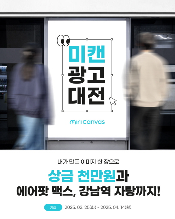 제1회 미캔광고대전 (이미지 한 장으로 상금 1천만원) 공모분야 웹툰/포스터/미술, 디자인/캐릭터 접수기간2025.03.25 ~ 2025.04.14 D+300 종료 참가자격 제한없음 주최미리캔버스 1등상금(상품)500만원~1천만원 홈페이지 바로가기 첨부파일 다운로드 유의사항 ※본 내용은 참고 자료로 내용의 오류와 변동에 대해 책임지지 않습니다. (오류 및 변동 신고는 상단의 '제안/오류' 신고를 통해 해주십시오.) ※주최사 사정에 따라 일정 및 내용이 변경될 수 있으니 주최사 홈페이지 등을 통해 관련 안내를 수시로 확인하시기 바랍니다. 상세내용 ■ 제목제1회 미캔광고대전 (이미지 한 장으로 상금 1천만원) ■ 기간 - 접수 기간 : 2025년 3월 25일(화) ~ 4월 14일(월) - 당첨작 발표 : 2025년 4월 22일(화) ■ 참가자격미리캔버스를 쓸 줄 아는 누구나 참여 가능 ■ 참여방법 / 접수방법<공모 방법> 쉽고 편한 디자인 툴 미리캔버스를 알리는 광고를 이미지 한 장으로 만들어주세요! <제출 방법> - 미리캔버스에서 제작 후 구글폼으로 제출 <심사 기준>※ 재밌거나! 감동적이거나! 기발하거나! 센스있거나! 멋있거나! ■ 시상내용 / 혜택 1등(1명) : 1,000만원 2등(2명) : 에어팟 맥스 3등(10명) : 미리캔버스 Pro 1년권 * 당첨작은 모두 강남역 지하철 스크린에 닉네임과 함께 한달 간 광고가 전시됩니다. ■ 유의사항 - 미리캔버스로만 디자인해야 합니다. - 중복 출품은 가능하지만, 상품은 1회만 수령 가능합니다. - 저작권 침해, 부적절한 표현이 포함된 작품은 심사에서 제외됩니다. - 상금 및 에어팟 맥스는 세금을 납부해야 합니다. ■ 문의 mkt_kr@miridih.com 목록