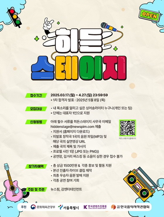 제3회 싱어송라이터 경연대회 히든스테이지 (대상 : 500만원) 공모분야 로고송/음악, 대회/전시/제작 접수기간2025.03.17 ~ 2025.04.27 D+286 종료 참가자격 제한없음 주최뉴스핌, 감엔터테인먼트 주관뉴스핌, 감엔터테인먼트 후원/협찬문화체육관광부, 서울특별시, 한국콘텐츠진흥원, 한국음악저작권협회 1등상금(상품)500만원~1천만원 홈페이지 바로가기 첨부파일 다운로드 유의사항 ※본 내용은 참고 자료로 내용의 오류와 변동에 대해 책임지지 않습니다. (오류 및 변동 신고는 상단의 '제안/오류' 신고를 통해 해주십시오.) ※주최사 사정에 따라 일정 및 내용이 변경될 수 있으니 주최사 홈페이지 등을 통해 관련 안내를 수시로 확인하시기 바랍니다. 상세내용 ■ 제목제3회 싱어송라이터 경연대회 히든스테이지 ■ 기간 - 모집 기간 : 2025년 3월 17일(월) ~ 4월 27일 (일) 23:59 - 1차 합격자 발표 : 2025년 5월 8일 (목)- 2차 본선 : 2025년 6월~8월 (뉴스핌TV KYD 스튜디오 라이브 클립 촬영)※ 라이브클립 녹화는 5월 예정. 2차 본선 일정은 송출일자를 표시하였습니다.- 3차 결선 : 2025년 9월 중 (서울시 야외무대) ■ 참가자격내 목소리를 알리고 싶은 싱어송라이터 누구나나이 성별 국적에 상관없이 대한민국에서 음악 활동이 가능한 개인 및 단체- 단체는 대표자 1인으로 지원- 본선 유튜브 경연에서는 보컬만 촬영 됩니다. (세션 MR사용. 1인 악기 경우에 따라 사용 가능) ■ 참여방법 / 접수방법지원 방법※ 아래 필수 서류를 히든스테이지 사무국 이메일 hiddenstage@newspim.com 제출1. 지원서 (2025 히든스테이지 참가 지원서 한글· 워드)2. 미발표 창작곡 1곡의 음원 파일(MP3), 해당 곡의 실연영상 URL3. 제출 곡의 제목 및 가사지4. 프로필 사진 1장 (JPG, PNG)- 공연장, 길거리 버스킹 등 소음이 심한 경우 접수 불가- 메일 제목: 2025년 히든 스테이지 참가 신청서_지원자명- 실연 영상은 튠작업 등 후보정을 하지 않은 원본이어야 함. ■ 시상내용 / 혜택- 대상(1명) : 500만원- 최우수상(2명) : 각 300만원 (한국콘텐츠진흥원장상, 한국음악저작권협회장상)- 우수상(1명), 루키상(1명) : 각 200만원 <참가자 혜택>※ 총 상금 1500만원과 각종 홍보 및 활동 지원본선 진출자 라이브 클립 제작최종 우승자 음원 발매각종 공연 참여 기회언론 홍보 및 인터뷰 지원 ■ 문의뉴스핌 히든스테이지 운영 사무국hiddenstage@newspim.com 목록