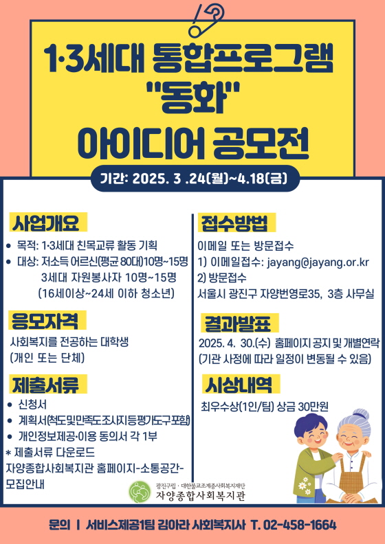 1,3세대 통합프로그램 "동화(同化)" 아이디어 공모전 공모분야 기획/아이디어/마케팅 접수기간2025.03.24 ~ 2025.04.18 D+295 종료 참가자격 기타 제한 주최자양종합사회복지관 1등상금(상품)100만원 이하 홈페이지 바로가기 첨부파일 다운로드 유의사항 ※본 내용은 참고 자료로 내용의 오류와 변동에 대해 책임지지 않습니다. (오류 및 변동 신고는 상단의 '제안/오류' 신고를 통해 해주십시오.) ※주최사 사정에 따라 일정 및 내용이 변경될 수 있으니 주최사 홈페이지 등을 통해 관련 안내를 수시로 확인하시기 바랍니다. 상세내용 ■ 제목1,3세대 통합프로그램 "동화(同化)" 아이디어 공모전 ■ 개요* 동화(同化)란? 세대 간 벽을 허물고 자연스럽게 어울리며 조화를 이루는 동시에 동화책처럼 1∙3세대가 함께 활동하면서 따뜻한 이야기들을 만들어가자는 의미를 담고 있습니다. ○ 사업목적1세대와 3세대가 각각 10명~15명씩 1:1로 매칭하여 각 세대가 서로 이해하고 문화차이를 줄일 수 있는 활동 기획 ○ 사업대상저소득 어르신(평균 80대), 3세대 자원봉사자(16세이상~24세 이하 청소년) ○ 예산약 150만원 이내 ○ 사업(프로그램) 진행 일정2025년 5월~12월(8개월, 8회기 이상), 매월 마지막 주 토요일 10:00~12:00* 일정은 복지관 프로그램 운영 상황을 고려하여 추후 협의가능* 수상자가 희망할 시 자원봉사자로 활동 가능함. ■ 기간- 서류 접수 기간: 2025. 3. 24.(월) ~ 2025. 4. 18.(금) 18시 ■ 참가자격사회복지를 전공하는 대학생(개인 또는 단체) ■ 참여방법 / 접수방법<접수방법>- 이메일 또는 방문 접수1) 이메일접수: jayang@jayang.or.kr- 이메일 제목에 학교명/팀명 표시, 첨부되는 파일명도 이메일 제목과 동일하게 명시ex) 자양대학교(자양팀) 2025년 동화 프로그램 아이디어 공모전 서류 2) 방문접수: 서울시 광진구 자양번영로35 자양종합사회복지관 3층 사무실 <제출서류>- 신청서, 계획서(척도 및 만족도 조사지 등 평가도구 포함), 개인정보제공・이용 동의서 각 1부 ■ 시상내용 / 혜택- 최우수상(1인/팀) 상금 30만원 ■ 유의사항- 프로그램 기획안은 지역 특성(서울시 광진구)에 부합하는 내용으로 작성해야 합니다.- 입상에 적합한 사회복지 프로그램이 없는 경우, 미선정 될 수 있습니다.- 응모작은 반환하지 않으며, 입상 아이디어의 권리는 자양종합사회복지관에 귀속됩니다.- 타 지원사업 선정 프로그램, 모방한 아이디어는 심사에서 제외될 수 있으며, 입상 후 이와 같은 사실이 발생할 경우 입상이 취소될 수 있습니다. ■ 문의- 서비스제공1팀 김아라 사회복지사 02-458-1664 / 070-5051-5706 목록
