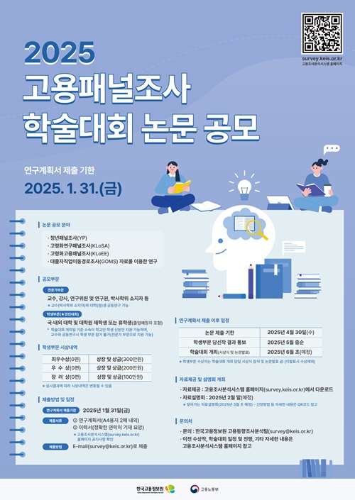 2025 고용패널조사 학술대회 논문 공모 공모분야 문학/시나리오 접수기간2024.12.11 ~ 2025.01.31 D+377 종료 참가자격 기타 제한 주최한국고용정보원 주관한국고용정보원 1등상금(상품)200만원~499만원 홈페이지 바로가기 첨부파일 다운로드 유의사항 ※본 내용은 참고 자료로 내용의 오류와 변동에 대해 책임지지 않습니다. (오류 및 변동 신고는 상단의 '제안/오류' 신고를 통해 해주십시오.) ※주최사 사정에 따라 일정 및 내용이 변경될 수 있으니 주최사 홈페이지 등을 통해 관련 안내를 수시로 확인하시기 바랍니다. 상세내용 ■ 제목2025 고용패널조사 학술대회 논문 공모 ■ 개요한국고용정보원은 ‘청년패널조사(YP)’, ‘고령화연구패널조사(KLoSA)’, ‘고령화고용패널조사(KLoEE)’, ‘대졸자직업이동경로조사(GOMS)’ 자료를 이용한 학술대회를 매년 개최하고 있습니다.이에 올해 열릴 학술대회에 참여할 뜻이 있는 연구진의 논문을 공모합니다.연구자 부문, 학생 부문으로 나눠 진행되며 연구자 부문은 제출된 논문 중 발표작을 선정하고 학생부문은 논문 경진대회 형태로 진행됩니다. ■ 기간연구계획서 제출 기한 : ~2025년 1월 31일(금) 23:59까지 논문제출 기한 : 2025년 4월 30일(수) ■ 참가자격 ◆ 전문가 부문: 교수, 연구위원 및 연구원 등 연구자 * 교수(박사학위 소지자)와 대학(원)생 공동연구 가능 ◆ 학생 부문: 국/내외 대학 및 대학원 재학생 또는 휴학생(수료 및 졸업예정자 포함) * 학술대회 개최일 기준 소속이 학교인 학생 신분만 지원 가능하며, 교수와 공동연구 시 학생 부문 참가 불가(전문가 부문으로 지원 가능) ■ 참여방법 / 접수방법 - 제출서류 : 연구계획서(A4용지 2매 이내), 이력서(연락처 기재) (논문 공모 안내 첨부파일 참조) - 제출방법: E-mail(survey@keis.or.kr)로 제출 ※ 고용조사분석시스템(survey.keis.or.kr) 홈페이지 게시글 – 원고 양식 확인 ■ 시상내용 / 혜택<학생 부문 시상내역> 최우수상 300만 원(○편), 우수상 200만 원(○편), 장려상 100만 원(○편) ■ 기타사항<데이터 제공>고용조사분석시스템(https://survey.keis.or.kr)에서 제공, 최신 자료는 공개 후 사이트 및 이메일 공지 예정 <찾아가는 데이터 설명회> - 개최기간: 2025년 3월 초(예정) - 신청기간: 2025년 2월 3일~7일 - 신청조건: 학교 또는 기관 내 참석자 5명 이상, 학교 또는 기관 내 빔프로젝터 회의실 대여가 가능한 경우 - 신청방법: E-mail(survey@keis.or.kr)로 ‘학교명 또는 기관명/참석 희망자 수 / 희망 날짜 및 시간(3순위) 작성하여 제출 <학술대회 개최>2025년 6월 초(예정) * 학생부문 수상작 발표: 2025년 5월 중순(예정)※ 학생부문 수상자는 학술대회 개최 당일 시상식 참석 및 논문발표 必 (미발표시 수상제외) ■ 문의한국고용정보원 고용동향조사분석팀(survey@keis.or.kr) 목록