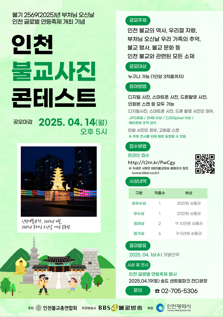 인천 불교사진 콘테스트 공모분야 사진/영상 접수기간2025.03.26 ~ 2025.04.14 D+299 종료 참가자격 제한없음 주최인천불교총연합회 주관BBS불교방송 후원/협찬인천광역시 1등상금(상품)기타 홈페이지 바로가기 첨부파일 다운로드 유의사항 ※본 내용은 참고 자료로 내용의 오류와 변동에 대해 책임지지 않습니다. (오류 및 변동 신고는 상단의 '제안/오류' 신고를 통해 해주십시오.) ※주최사 사정에 따라 일정 및 내용이 변경될 수 있으니 주최사 홈페이지 등을 통해 관련 안내를 수시로 확인하시기 바랍니다. 상세내용 ■ 공모주제- 인천 불교의 역사, 우리절 자랑, 부처님 오신날 우리 가족의 추억, 불교 행사, 불교 문화 등 인천 불교와 관련된 모든 소재■ 공모대상누구나 가능 (1인 3작품까지)■ 참여방법디지털 사진, 스마트폰 사진, 드론촬영 사진, 인화본 스캔 등 모두 가능- 디지털 사진, 스마트폰 사진, 드론 촬영 사진인 경우 : jpg 파일 / 2MB이상 / 2,000pixel 이상 / 메타정보(EXIF) 조작 금지- 인화 사진인 경우 : 고화질 스캔※ 추후 전시를 위해 원본 요청할 수 있음■ 시상내역최우수상 │ 1명 │ 30만원 상품권우수상 │ 1명 │ 20만원 상품권장려상 │ 2명 │ 각 10만원 상품권참가상 │ 6명 │ 각 5만원 상품권■ 결과발표2025.04.16(수) 개별연락※ 출품자 인적사항, 연락처 오입력 등으로 인해 연락이 닿지 않을 경우 수상이 취소될 수 있습니다.■ 시상 및 전시인천 글로벌 연등축제 행사2025.04.19(토) 송도 센트럴파크 잔디광장■ 유의사항- 촬영 장소가 불분명하거나 사진 설명이 부족한 경우 수상작으로 선정하지 않습니다.- 수상작은 사단법인 인천불교총연합회에서 인천 불교 홍보 등의 비상업적 목적으로 기한에 관계없이 방송, 인쇄 등 다양한 형태의 제작물로 사용할 수 있으며, 일부 변경하거나 편집할 수 있습니다.- 수상작은 타 사진대회에 출품할 수 없습니다.- 수상작이 타 대회 출품작이거나 사진 도용 등으로 인해 문제가 발생할 시 수상은 취소되며, 모든 법적 책임은 응모자에게 있습니다.- 응모자가 유의사항을 충분히 숙지하고 모든 사항에 동의한 것으로 간주합니다.■ 문 의BBS불교방송 02-705-5306 / baekda77@gmail.com 목록