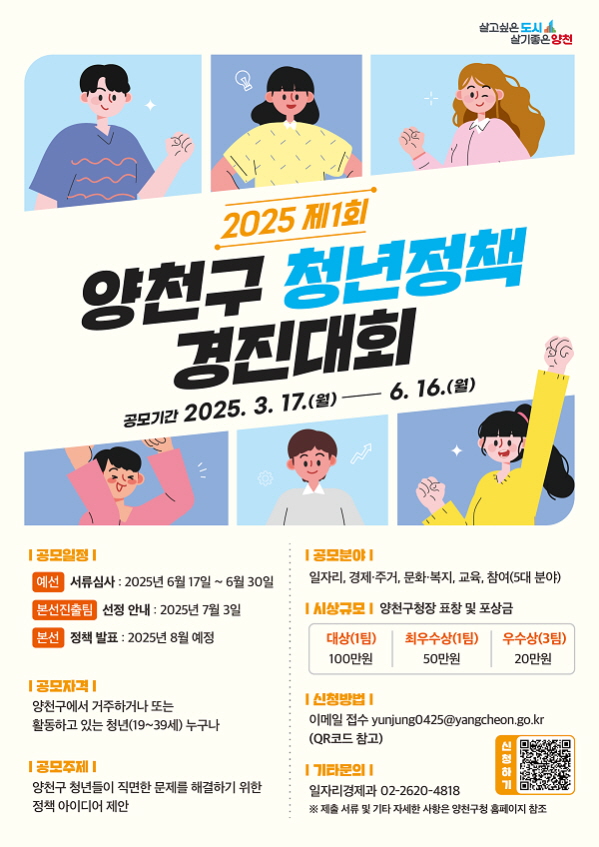 제1회 양천구 청년정책 경진대회 공모분야 기획/아이디어/마케팅, 정책 제안 접수기간2025.03.17 ~ 2025.06.16 D+236 종료 참가자격 지역한정 주최양천구청 주관양천구청 1등상금(상품)100만원~199만원 홈페이지 바로가기 첨부파일 다운로드 유의사항 ※본 내용은 참고 자료로 내용의 오류와 변동에 대해 책임지지 않습니다. (오류 및 변동 신고는 상단의 '제안/오류' 신고를 통해 해주십시오.) ※주최사 사정에 따라 일정 및 내용이 변경될 수 있으니 주최사 홈페이지 등을 통해 관련 안내를 수시로 확인하시기 바랍니다. 상세내용 ■ 제목제1회 양천구 청년정책 경진대회 ■ 기간 - 접수 기간 : 2025. 3. 17.(월) ~ 6. 16.(월) 24:00 - 예선 심사 결과 발표 : 2025. 7. 3.(목) / 개별 문자 통보- 팀별 퍼실리테이팅 : 2025. 7월 (예정) ※ 예선 심사 선정 5팀 정책 제안 연구원 1:1 컨설팅※ 정책 제안서를 분석하여 개선 방향 제시 및 피드백- 본선심사(발표 및 해커톤) 및 선정 : 2025. 8월 중순 (예정) / 양천구청 디지털미디어센터(3층) ■ 참가자격양천구에서 거주하거나 활동하는 청년(만 19세 이상 39세 이하) 누구나 (개인 또는 5인 이하의 팀)○ ‘5인 이하의 팀’의 경우 팀 구성원 모두가 공고일 기준 양천구에서 거주하거나 활동하는 청년이여야 함○ 의무복무 제대군인의 경우 최대 3년 범위에서 군 복무 기간만큼 연령 상한 연장 - 2년 이상 복무자 : 3년 / 1년 이상 2년 미만 복무자 : 2년 / 1년 미만 복무자 : 1년 연장 ■ 참여방법 / 접수방법<공모 주제>양천구 청년들이 직면한 문제를 해결하기 위한 정책 아이디어 제안※ 예시 1. 양천구 청년 참여 디자인 공간 기획 2. 은둔·고립 청년 사회 참여 활성화 방안 3. 양천구 청년 대상 정책 홍보 방안 <공모분야> 일자리, 경제·주거, 문화·복지, 교육, 참여 (5대 분야)※ 2025년 양천구 분야별 주요 추진 청년 사업은 홈페이지 공고문을 다운로드 받아서 확인 <접수방법> 담당자 이메일로 관련 서류 제출 : yunjung0425@yangcheon.go.kr <제출서류>- 첨부문서 작성 후 하나의 폴더에 넣어 ‘주제_이름(팀명)’으로 압축(zip) 후 제출① 증빙서류 1부 ※ 하단의 서류 등 증빙서류 1가지만 제출· 주민등록초본 1부(주민등록번호 뒷자리 미포함, 양천구 거주 확인용) · 재직증명서 또는 사업자등록증 1부(양천구 소재 직장․사업장 확인용) · 활동증명서 1부(양천구 소재 단체 확인용)② 참가신청서 1부 [붙임 1]③ 정책제안 요약서 1부 [붙임 2]④ 제안기획서 1부 ※ PPT로 작성 후 PDF로 제출. 20매 이하 ※ 요약서 및 제안기획서 내 소속과 이름 등 신상정보를 알 수 있는 표기 일체 금지(낙선 사유) ※ 2차 발표심사 시, 발표자료는 별도로 제작 가능(단, 주요 아이디어는 수정불가) ※ 제출규격을 준수하지 않을 시, 심사대상에서 제외⑤ 개인정보 수집·이용 동의서 1부. [붙임 3]⑥ (선택)병적증명서 또는 주민등록초본(병역사항 포함) ※ 의무복무 제대군인 연령 상한 연장 희망자에 한하여 제출 ■ 시상내용 / 혜택 - 대상 1팀 : 구청장 상장 및 상금 100만원 - 최우수상 1팀 : 각 구청장 상장 및 상금 50만원 - 우수상 3팀 : 각 구청장 상장 및 상금 20만원 ■ 유의사항❍ 중복접수 가능. 단, 동일 인(팀)의 여러 작품이 수상하게 될 경우 최고 상격 및 상금에 해당하는 단 하나의 작품만을 시상함 ❍ 규정 및 출품규격에 맞지 않는 작품은 심사대상에서 제외함 ❍ 접수작의 개수 및 수준에 따라 상금, 상격 및 수상팀 수 등이 변동될 수 있음 ❍ 심사점수는 공표하지 않고, 심사항목 및 배점 등은 변경될 수 있음 ❍ 동일 내용의 아이디어가 접수된 경우, 먼저 접수된 제안을 우선 심사함 ❍ 출품작은 미출품된 창작품에 한하며, 아래 사유 중 어느 하나에 해당하는 경우 심사에서 제외될 수 있으며, 수상 후에도 아래 어느 하나에 해당하는 사실이 발견될 경우 입상 취소 및 상금회수 등 적절한 조치가 있을 수 있으며, 이로 인한 법적 책임은 출품자(응모자)에게 있음 가. 출품자(응모자)의 작품이 아닌 경우(표절 등) 나. 모방 또는 이미 사용 중인 아이디어를 출품(응모)한 경우 다. 타 기관의 청년정책 또는 공모전에 당선된 동일 또는 유사한 내용을 출품한 경우 라. 출품자(응모자)의 신분이 참가자격에 벗어난 경우 ❍ 출품자(응모자)는 팀별 퍼실리테이팅과 본선(해커톤)에 적극적으로 참여해야 함 ❍ 출품자(응모자)는 출품작이 선정된 경우 향후 양천구 청년 정책화 추진을 위한 추가 자료 제출 등의 요청에 적극 응하여야 하며, 이에 동의하고 이행하였을 때 상금을 지급함 ❍ 출품된 작품의 저작권은 출품자(응모자)에게 있으며, 주최 또는 주관기관은 수상작에 한하여 복제・배포할 수 있음 ❍ 주최 또는 주관 기관의 필요 시 저작자와 별도의 협의를 거쳐 수상작에 대한 저작재산권을 양수받거나 이용허락을 받을 수 있음 ❍ 모든 출품자(응모자)는 출품작이 주최기관이 수상작으로 선정하여 널리 사용할 때 법적 문제가 없어야 하며, 제3자의 저작권, 초상권, 명예훼손 등을 침해하지 않도록 주의의무를 다하여야 함 ❍ 출품작에 대한 분쟁 발생 시 모든 책임은 출품자(응모자)에 있음 ❍ 공모에 관한 모든 변경 및 추가 사항은 양천구 홈페이지 등에 