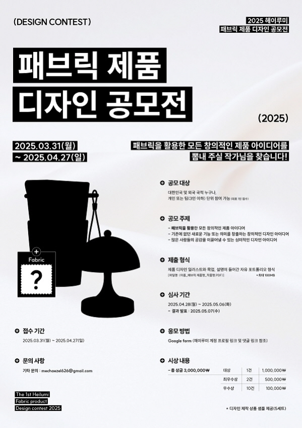 제 2회 헤이루미 패브릭 제품 디자인 공모전 공모분야 디자인/캐릭터 접수기간2025.03.31 ~ 2025.04.27 D+285 종료 참가자격 제한없음 주최헤이루미 1등상금(상품)100만원~199만원 홈페이지 바로가기 첨부파일 다운로드 유의사항 ※본 내용은 참고 자료로 내용의 오류와 변동에 대해 책임지지 않습니다. (오류 및 변동 신고는 상단의 '제안/오류' 신고를 통해 해주십시오.) ※주최사 사정에 따라 일정 및 내용이 변경될 수 있으니 주최사 홈페이지 등을 통해 관련 안내를 수시로 확인하시기 바랍니다. 상세내용 ■ 제목제 2회 헤이루미 패브릭 제품 디자인 공모전 ■ 기간- 접수기간 : 2025.3.31(월) ~ 4.27(일) - 심사결과 발표 2025.5.7. (수) ■ 참가자격대한민국 및 외국 국적 누구나 참여 가능 (개인 또는 3인 이내 팀 구성으로 지원 가능) ※ 팀 참가 시 대표 1인 접수 ■ 참여방법 / 접수방법<공모주제>- 패브릭 + 제품의 신선한 조합이면 ok!- 패브릭의 감성을 담아, 트렌디하게 풀어낸 제품 디자인- 기존에 없던 새로운 기능 또는 의미를 창출하는 창의적인 디자인 아이디어 - 많은 사람들의 공감을 이끌어낼 수 있는 심미적인 디자인 아이디어 <제출형식> - 제품 디자인 일러스트와 목업, 설명이 들어간 자유 포트폴리오 형식 ※ 파일명 : 이름_패브릭 제품명_작품명.PDF (최대 100mb) <접수 방법>구글폼 접수 : https://forms.gle/PmGRoauAqrKoAdVW8 ■ 시상내용 / 혜택 - 대상 1건 : 100만원 - 최우수상 2건 : 각 50만원 - 우수상 10건 : 각 10만원 ※ 디자인 제작상품 샘플 제공 (5세트) ■ 유의사항공모전에 출품된 작품에 대한 저작권은 응모자에게 있으며, 수상 후에도 입상자에게 귀속됨을 원칙으로 합니다.(주)니즈는 입상작(대상작/최우수작/우수작)에 한하여 영리 목적으로 3년간 독점적으로 복제, 전시,대여하여 브랜딩할 수 있습니다. 응모자는 응모와 동시에 추후 입상 시 공모전 요강에 기재되어 있는 이용 방법 및 조건의 범위 안에서 저작물(입상작) 이용을 허락한 것으로 보고, 입상작의 저작재산권에 대한 이용료는 입상에 따른 시상금과 상품으로 대체될 수 있습니다. 향후, (주)니즈는 입상작에 대한 저작재산권(전부 또는 일부)을 양수할 필요가 있거나, 공모전 요강에 공고된 범위를 넘어 입상작을 이용할 경우, 저작자와 별도로 합의하여 정할 수 있습니다. 응모자는 공모전의 저작권과 관련한 이의 사항이 있을 경우 이의신청을 할 수 있습니다. 향후 공모전 출품작 저작권과 관련한 분쟁이 발생할 경우 한국저작권 위원회에 조정을 신청하여 해결할 수 있으며, 양 당사자는 원활한 분쟁 해결을 위해 상호 노력합니다. ■ 문의mechaezel626@gmail.com 목록
