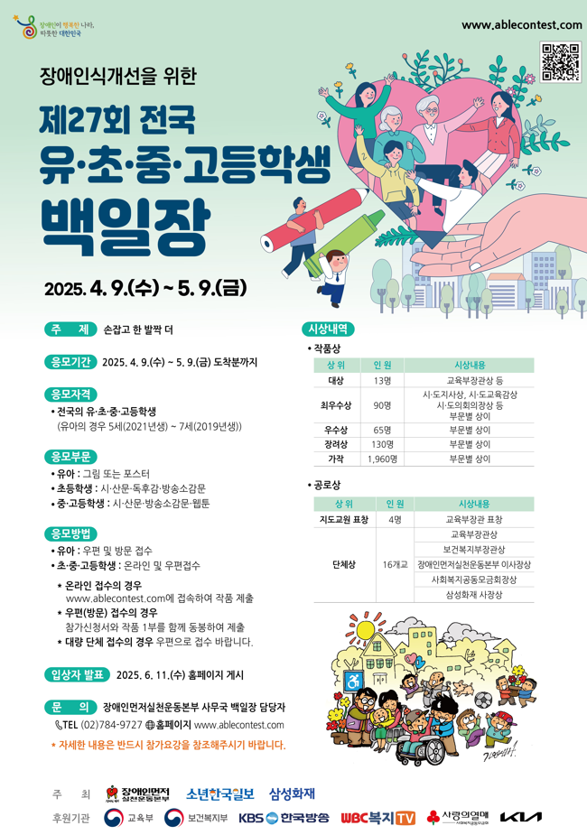 장애인식개선을 위한 제27회 전국 유·초·중·고등학생 백일장 공모분야 문학/시나리오 접수기간2025.04.09 ~ 2025.05.09 D+273 종료 참가자격 청소년, 어린이/초등학생 주최장애인먼저실천운동본부, 삼성화재, 소년한국일보 후원/협찬교육부, 보건복지부, KBS, WBC복지TV, 사회복지공동모금회, KIA 1등상금(상품)기타 홈페이지 바로가기 첨부파일 다운로드 유의사항 ※본 내용은 참고 자료로 내용의 오류와 변동에 대해 책임지지 않습니다. (오류 및 변동 신고는 상단의 '제안/오류' 신고를 통해 해주십시오.) ※주최사 사정에 따라 일정 및 내용이 변경될 수 있으니 주최사 홈페이지 등을 통해 관련 안내를 수시로 확인하시기 바랍니다. 상세내용 ■ 제목장애인식개선을 위한 제27회 전국 유·초·중·고등학생 백일장 ■ 기간- 응모기간 : 2025. 4. 9.(수) ~ 5. 9.(금) 도착 분까지 - 수상자 발표 : 2025. 6. 11.(수) 홈페이지 게시 ■ 참가자격전국 유·초·중·고등학생(개인, 단체 응모 가능)* 유아의 경우 5세(2021년생) ~ 7세(2019년생) ■ 참여방법 / 접수방법● 주제 : 손잡고 한 발짝 더 <응모부문>· 유아 : 그림 또는 포스터· 초등학생 : 시, 산문, 독후감, 방송소감문· 중·고등학생 : 시, 산문, 방송소감문, 웹툰* 독후감의 경우, ‘장애(인)와 관련한 소재’ 독서 후 응모* 방송소감문의 경우, 초등학생은 반드시 장애인의 날 특별기획 ‘2025 대한민국 1교시’를 청취, 중·고 등학생은 ‘렛츠 댄스’를 시청 후 응모* 자세한 내용은 첨부파일 ‘백일장 참가요강(유아/초·중·고)’ 참조 <응모방법> 우편(방문) 접수의 경우, 홈페이지에서 참가 신청서 양식 다운로드하여 제출· 온라인 접수 : www.ablecontest.com 에 접속하여 작품 제출· 우편(방문) 접수 : 참가신청서와 작품 1부(유아 부문의 경우 작품 원본 1부)를 함께 동봉하여 제출 ■ 시상내용 / 혜택교육부장관상 등(*자세한 내용은 참가요강 참조) ■ 유의사항자세한 내용은 반드시 참가 요강을 참조해 주시기 바랍니다. ■ 문의장애인먼저실천운동본부 백일장 담당자(02)784-9727 / 홈페이지 www.ablecontest.com 목록