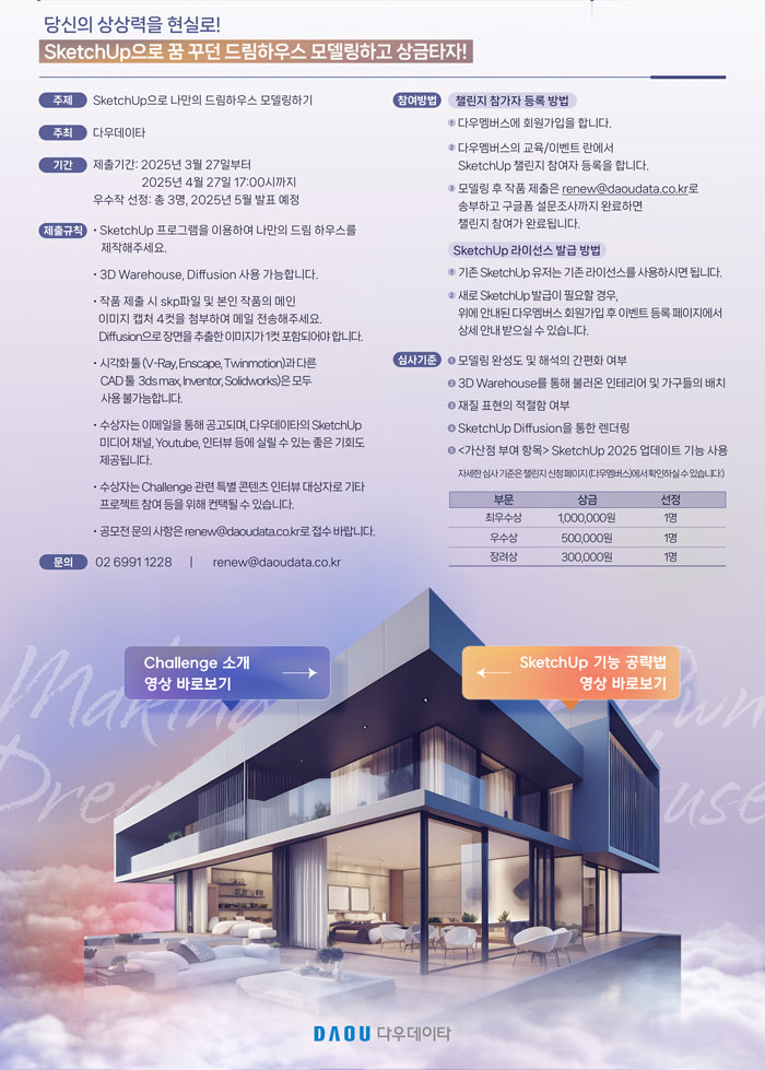 SketchUp Challenge 나만의 드림하우스 만들기 공모전 공모분야 디자인/캐릭터, 게임/어플/프로그램, 기타분야 접수기간2025.03.27 ~ 2025.04.27 D+285 종료 참가자격 제한없음 주최다우데이타 1등상금(상품)100만원~199만원 홈페이지 바로가기 첨부파일 다운로드 유의사항 ※본 내용은 참고 자료로 내용의 오류와 변동에 대해 책임지지 않습니다. (오류 및 변동 신고는 상단의 '제안/오류' 신고를 통해 해주십시오.) ※주최사 사정에 따라 일정 및 내용이 변경될 수 있으니 주최사 홈페이지 등을 통해 관련 안내를 수시로 확인하시기 바랍니다. 상세내용 ■ 제목SketchUp Challenge 나만의 드림하우스 만들기 공모전 ■ 기간 - 접수 기간 : 2025.03.27(목) ~ 2025.04.27(일) 17:00 ■ 참가자격누구나 제한없음 ■ 참여방법 / 접수방법<공모 주제> SketchUp으로 나만의 드림하우스 모델링하기 <참여 방법> 1. 다우멤버스에 회원가입을 합니다. 2. 다우멤버스 교육/이벤트 란에서 SketchUp 챌린지 참여자 등록을 합니다. ※ 참여자 등록 페이지 : https://ycomms.kr/daoudata/seminar/daoudata250222/ 3. 모델링 후 작품 제출은 renew@daoudata.co.kr로 송부하고 구글폼 설문조사까지 완료하면 챌린지 참여가 완료됩니다. ※ SketchUp 라이선스 발급 방법 - 기존 SketchUp 유저는 기존 라이선스를 사용하시면 됩니다. - 새로 SketchUp 발급이 필요한 경우, 위에 안내된 다우데이터 회원가입 후 이벤트 등록 페이지에서 상세 안내 받으실 수 있습니다. ■ 시상내용 / 혜택 - 최우수상 1명 : 상금 1,000,000원 - 우수상 1명 : 500,000원 - 장려상 1명 : 300,000원 ■ 유의사항 - SketchUp 프로그램을 이용하여 나만의 드림 하우스를 제작해주세요. - 3D Warehouse, Diffusion 사용 가능합니다. - 작품 제출 메일에는 skp 파일 및 본인 작품의 메인 캡쳐 이미지 4컷을 첨부하여 작품을 제출해주세요. - 시각화 툴 (V-Ray, Enscape, D5 render, Twinmotion)과 다른 CAD 툴 (3ds max, Inventor, Solidworks)은 모두 사용 불가능합니다. - 수상자는 이메일을 통해 공고되며, 다우데이타의 SketchUp 미디어 채널, Youtube, 인터뷰 등에 실릴 수 있는 좋은 기회도 제공됩니다. - 수상자는 Challenge 관련 특별 콘텐츠 인터뷰 대상자로 기타 프로젝트 참여 등을 위해 컨택될 수 있습니다. ■ 문의 - 전화 : 02-6991-1228 - 이메일 : renew@daoudata.co.kr 목록